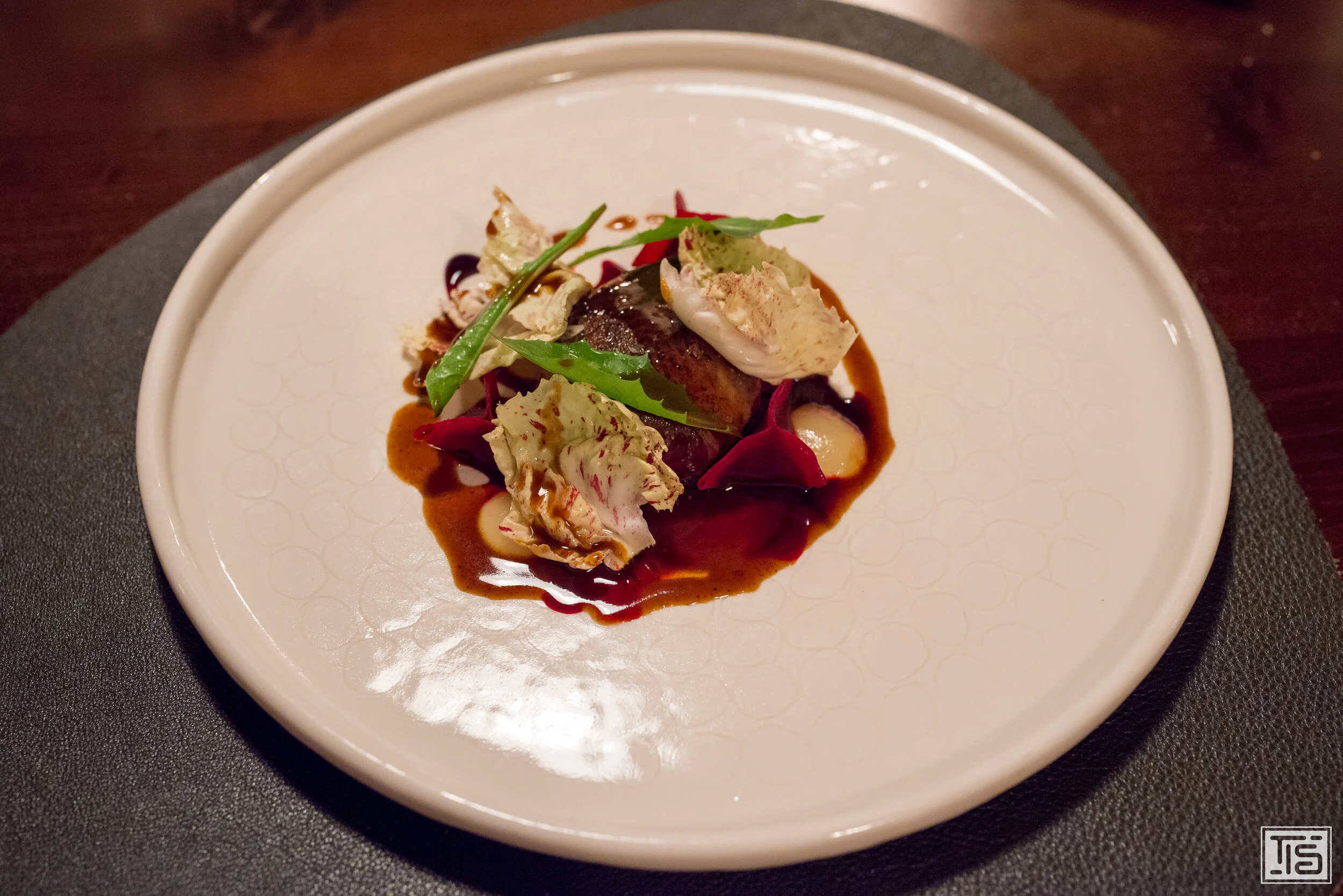 Taube mit Roter Rübe, Tonkabohne und Löwenzahn von Harald Irka in den Saziani Stub’n in Straden, Österreich