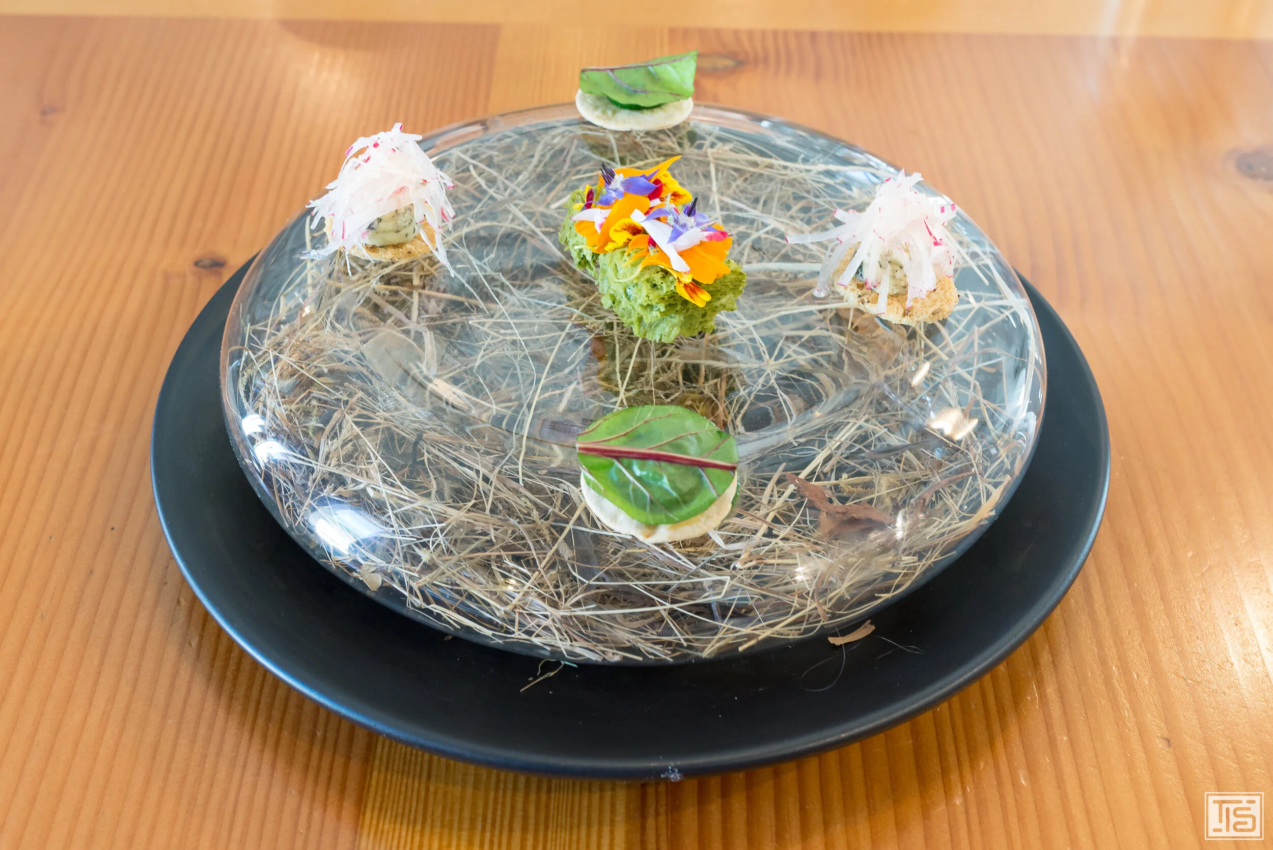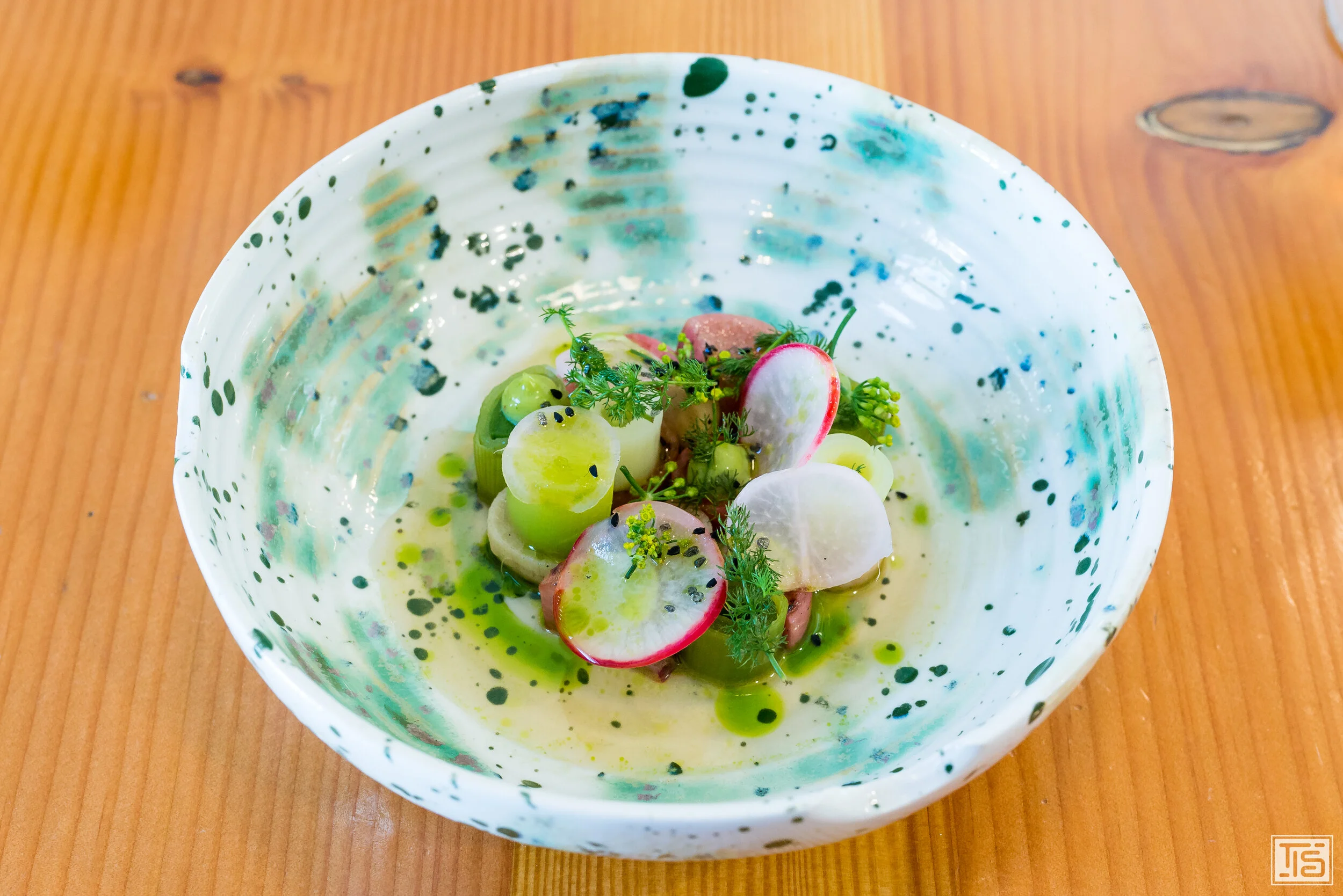 Lauch, Rettich, Rübe, Honig und Estragon sind die Komponenten des zweiten vegetarischen Ganges. Wer immer noch denkt, dass Spitzenküche nur mit Fisch, Fleisch und Co. funktioniert, sollte sich mal eine Kreation wie diese einverleiben, um sich endlich bekehren zu lassen. Das Zusammenspiel aus süsslichem Lauch, der dezenten Schärfe der knackigen Radieschen und der Rettichscheiben, erdiger Rübe und der zarten Anisnote des Estragons ist superb. Abgerundet wird das Ganze durch den präsenten, aber perfekt eingebundenen Honig sowie weitere stimulierende Kräuter. Sehr, sehr gut.