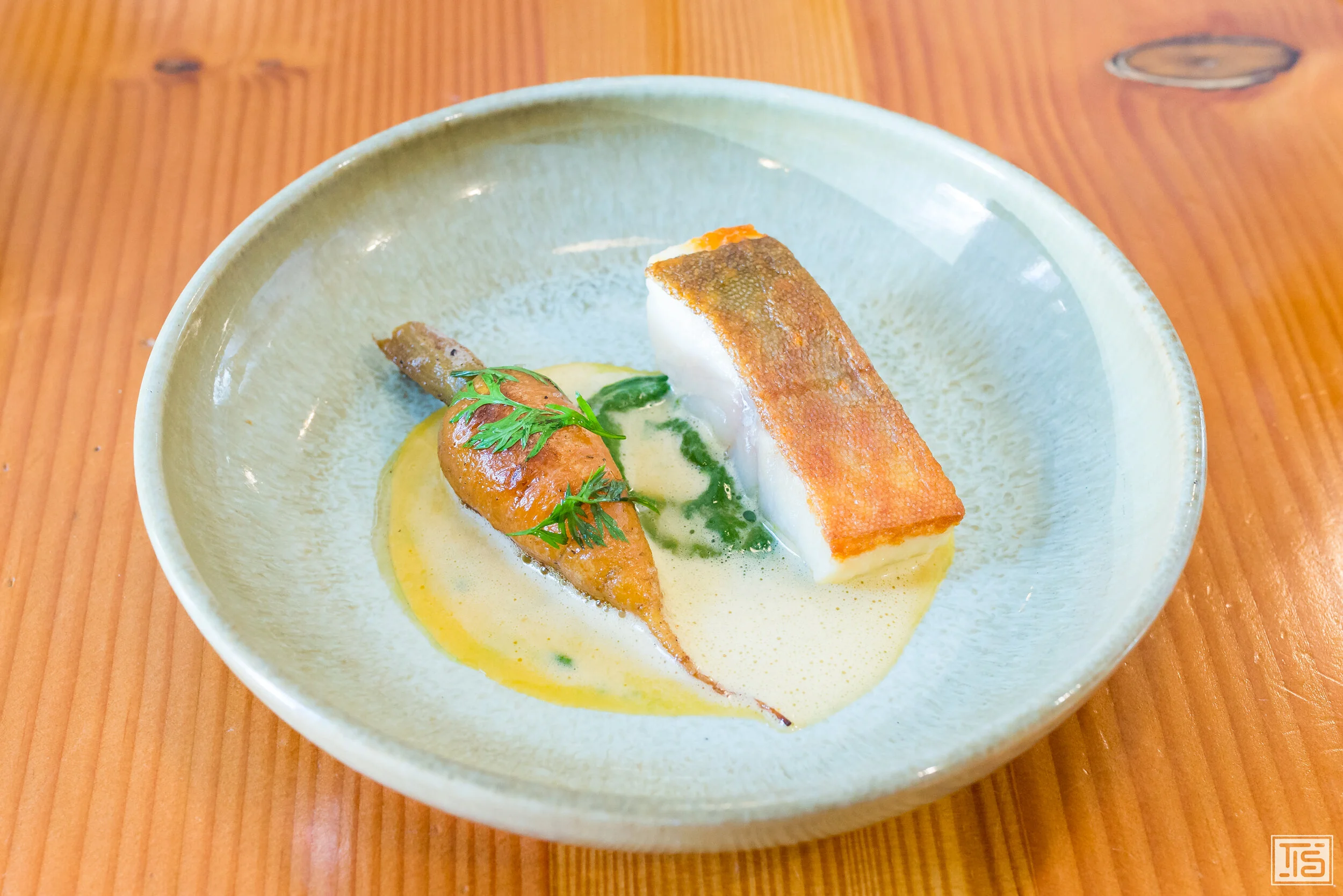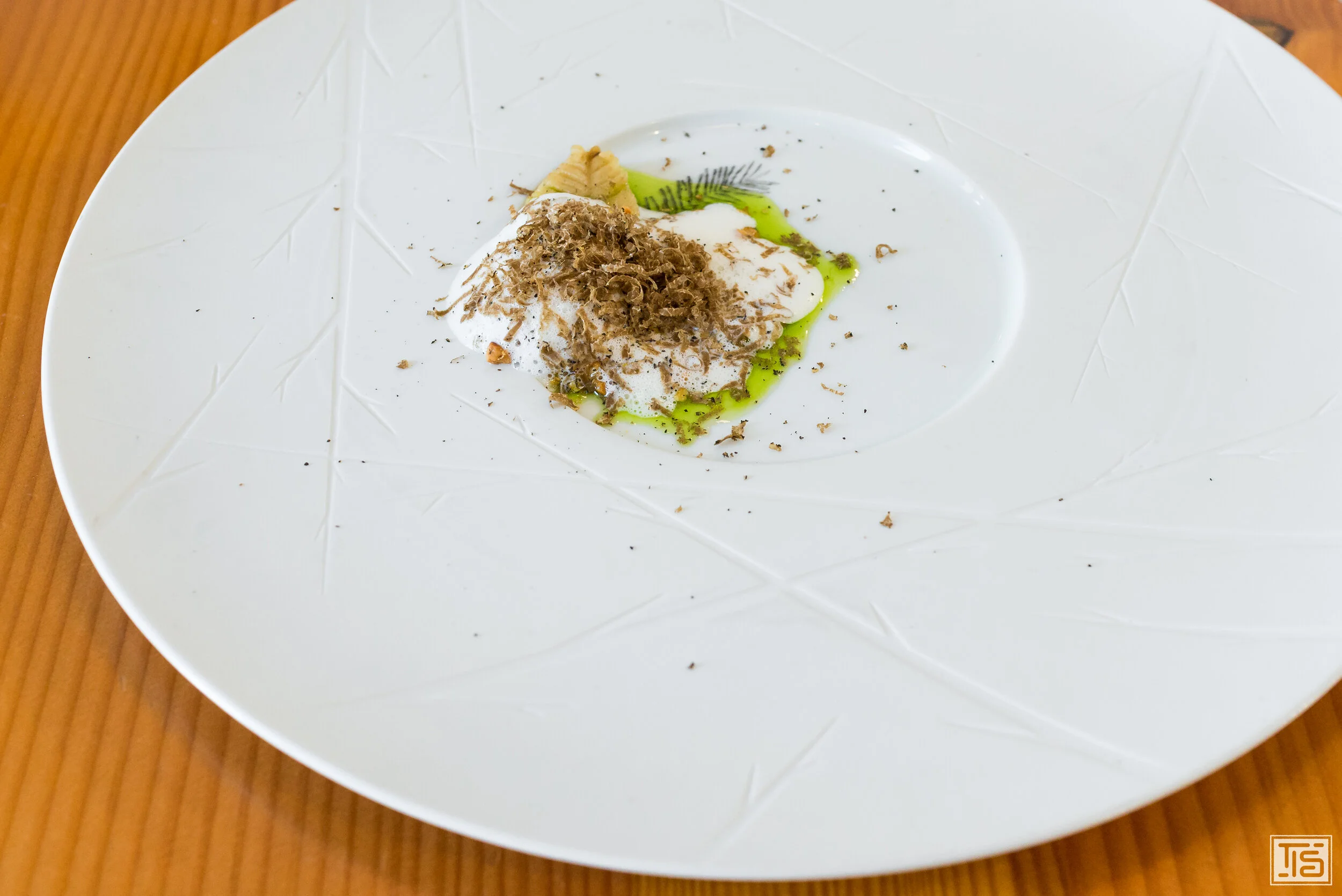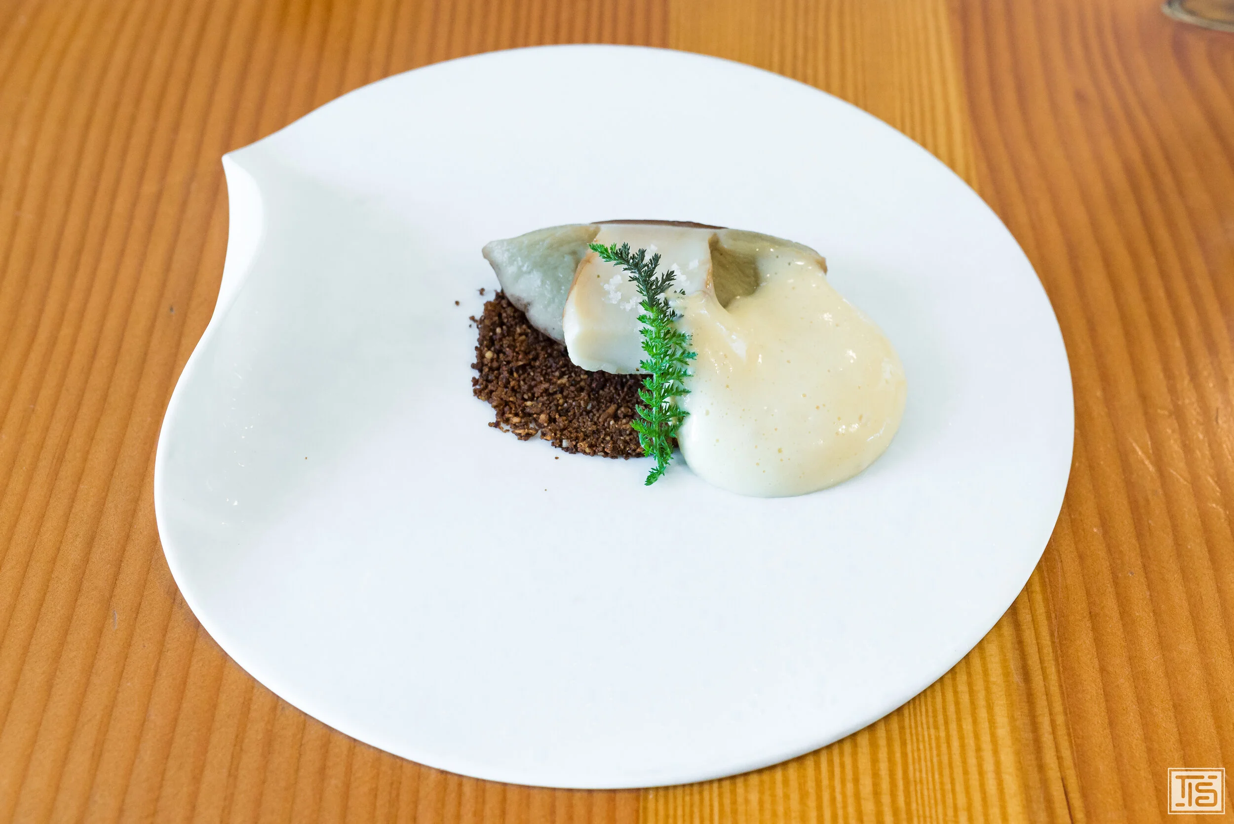 Weiter geht’s mit Topinambur, Trüffel und Haselnuss. Klingt nach einer Wohlfühlkreation, die zum Tellerablecken animiert. Ziemlich genau das ist sie auch. Im Mittelpunkt steht ganz klar die Nussigkeit, die allen drei Hauptkomponenten innewohnt. Dahinter verbirgt sich allerdings noch viel mehr. Das erdige Umami und die Komplexität der Trüffeln sowie die subtile Gemüsesüsse der Jerusalem Artischocke. Alle Schichten nahtlos miteinander verwoben. Obwohl das an sich schon sehr gut ist, braucht es zwingend einen Gegenpol, der verhindert, dass man in beliebige Gefälligkeit abdriftet. Diesen Part übernimmt ein hervorragendes Kräuteröl, das die nussige Phalanx aufbricht und dadurch genügend Kontrast reinbringt und die Balance sicherstellt.