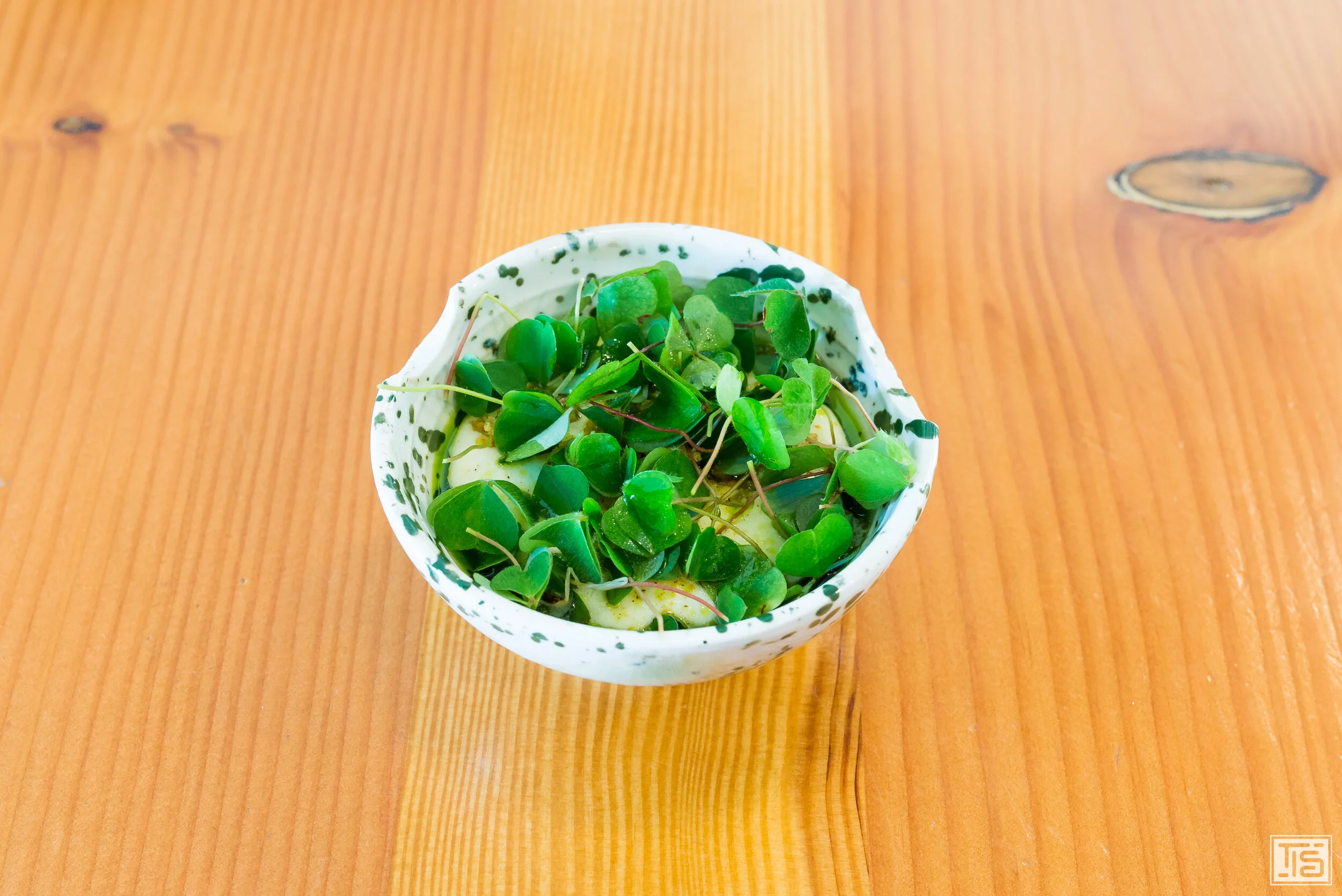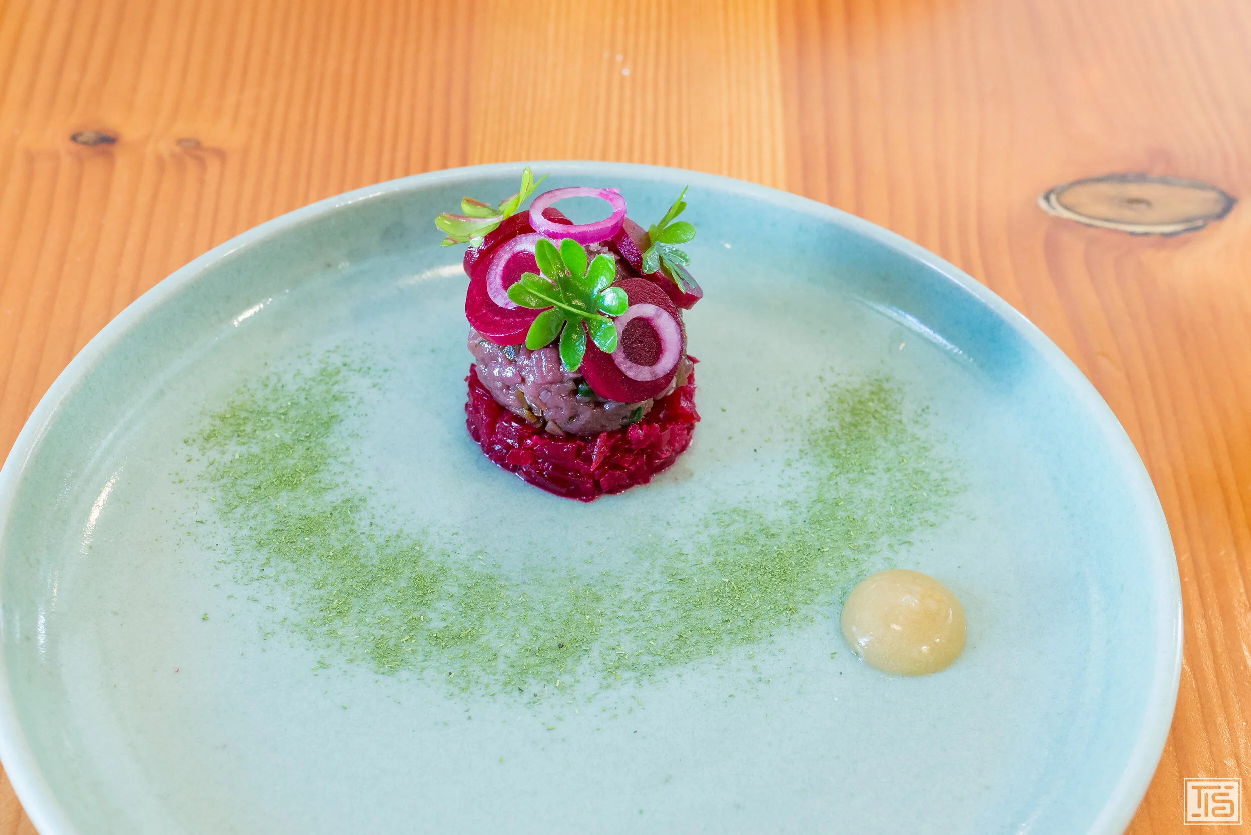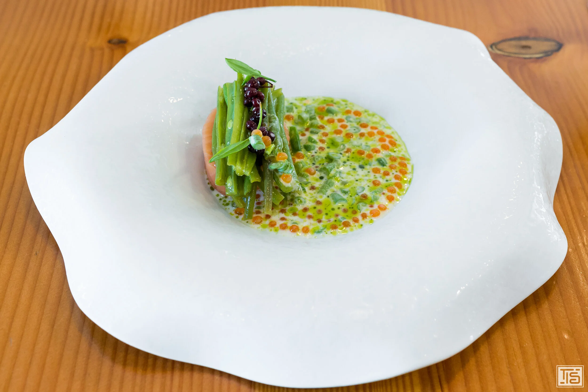 Weiter geht’s mit Topinambur, Trüffel und Haselnuss. Klingt nach einer Wohlfühlkreation, die zum Tellerablecken animiert. Ziemlich genau das ist sie auch. Im Mittelpunkt steht ganz klar die Nussigkeit, die allen drei Hauptkomponenten innewohnt. Dahinter verbirgt sich allerdings noch viel mehr. Das erdige Umami und die Komplexität der Trüffeln sowie die subtile Gemüsesüsse der Jerusalem Artischocke. Alle Schichten nahtlos miteinander verwoben. Obwohl das an sich schon sehr gut ist, braucht es zwingend einen Gegenpol, der verhindert, dass man in beliebige Gefälligkeit abdriftet. Diesen Part übernimmt ein hervorragendes Kräuteröl, das die nussige Phalanx aufbricht und dadurch genügend Kontrast reinbringt und die Balance sicherstellt.