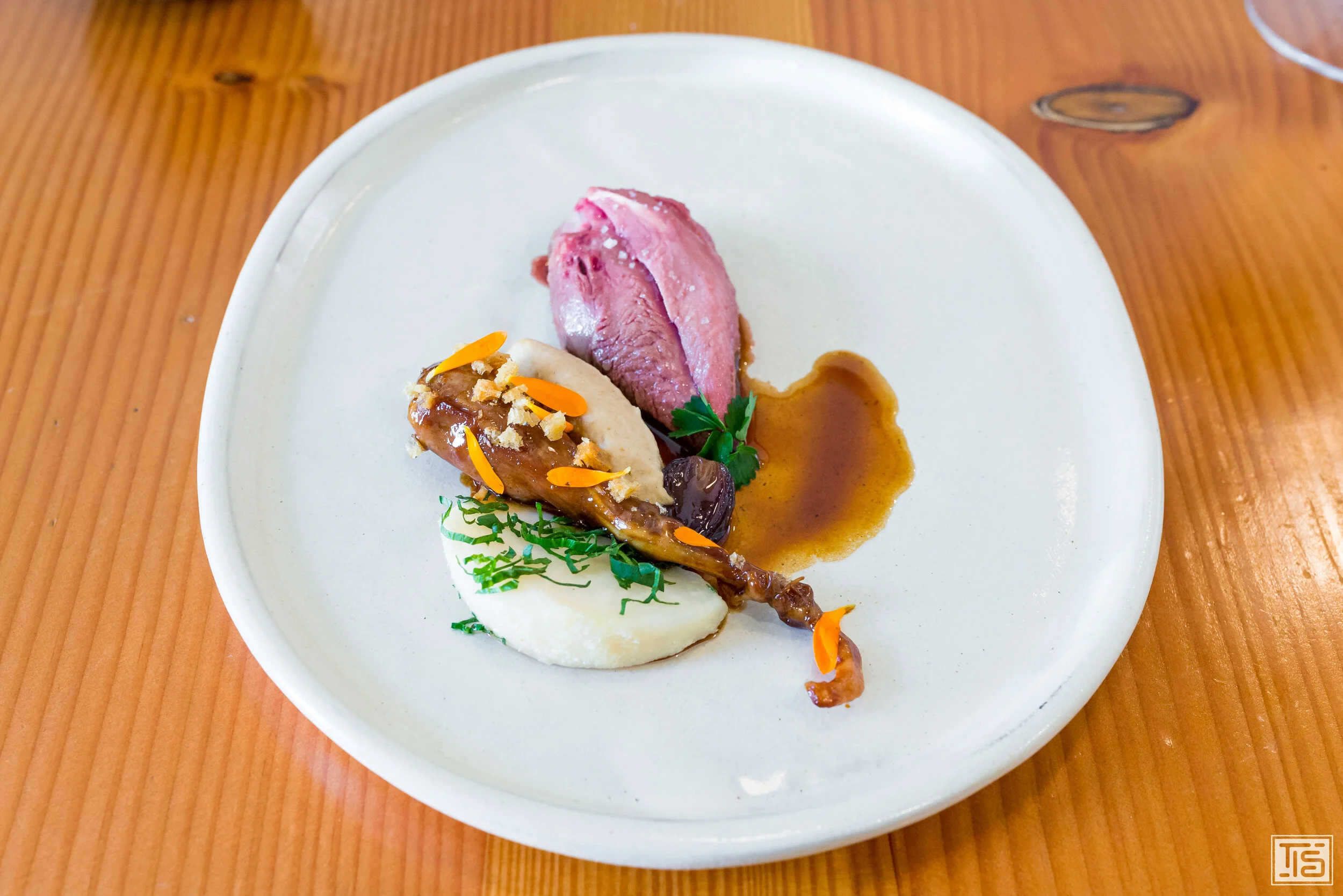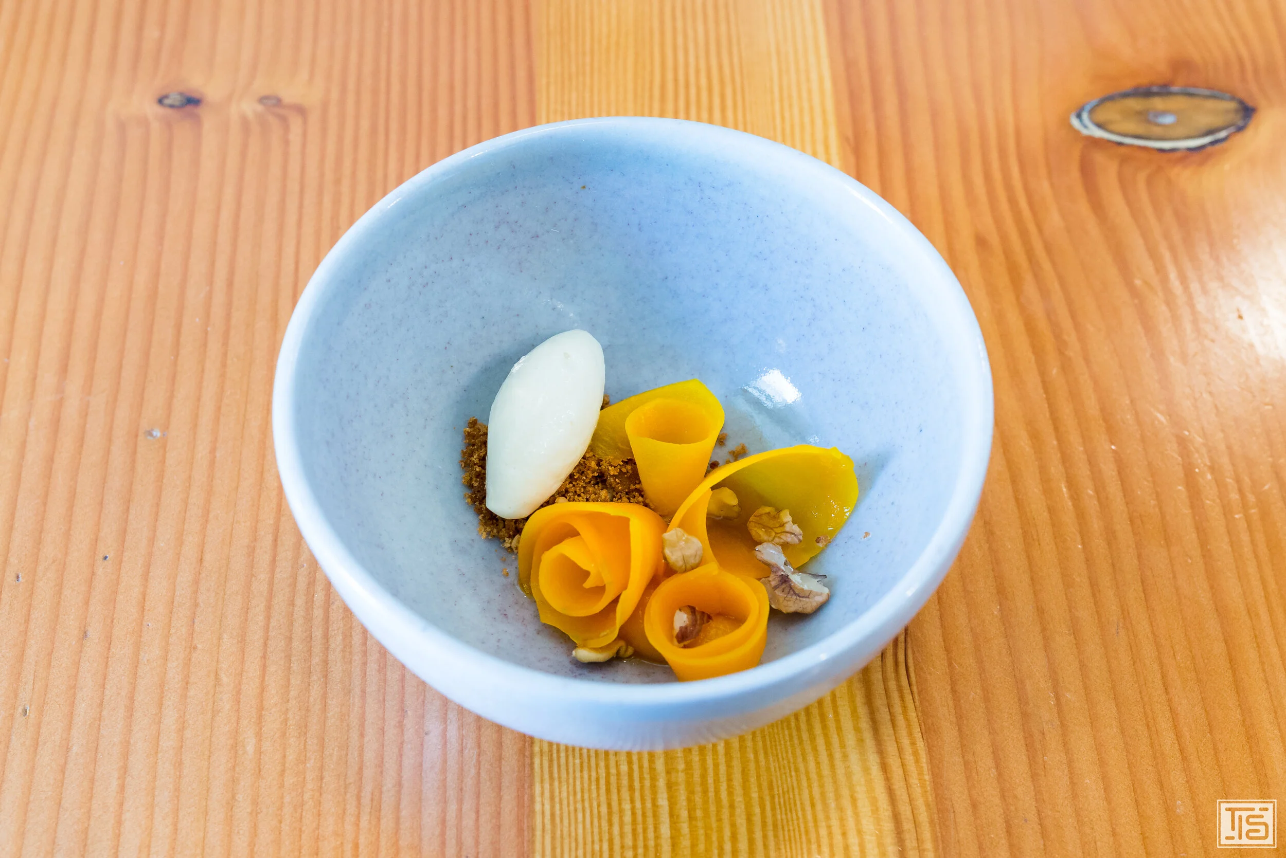 Nach so einem grandiosen Gericht geht es der Saibling mit Karotte und Tomatensaft vom letzten Jahr etwas gemächlicher an. Der Grundton ist, für ein Fischgericht eher ungewöhnlich, ziemlich erdig. Das rührt vor allem von der stattlichen Karotte her, die nicht sehr süss ist und dadurch eher an eine Rübe erinnert und ein herbstliches Gefühl aufkommen lässt. Doch auch die hervorragende Sauce schlägt in eine ähnliche Kerbe. Von der Frische der Tomaten ist nach einem Jahr nur noch wenig übrig, dafür steht ihr würziges, tertiäres Umami im Vordergrund. Allerdings wohnt der Sauce auch genügend Säure inne, um sowohl den Fisch ins richtige Licht zu rücken, indem sie dafür sorgt, dass er nicht von der Wucht überlagert wird, als auch ein wenig aufzulockern, damit das Ganze nicht zu plump daherkommt.