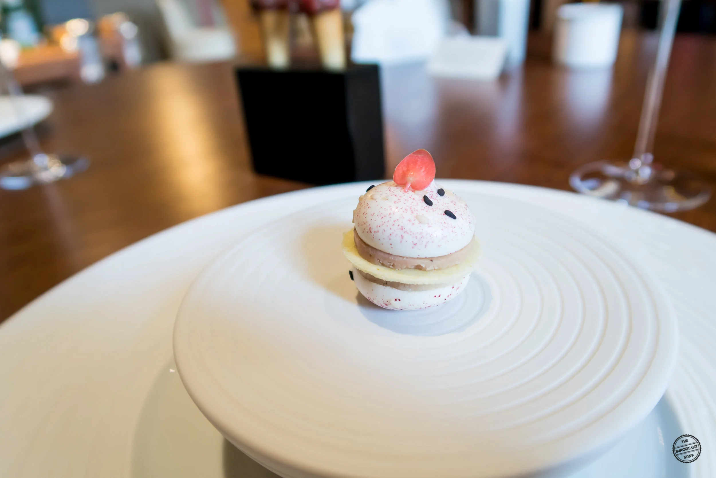 Ein Macaron mit Entenleber, Räucheraal und grünem Apfel ist aromatisch wuchtig, dennoch leicht und lässt jedes einzelne Element zur Geltung kommen, so dass ein fein ausbalanciertes Geschmacksbild entsteht. Klasse.