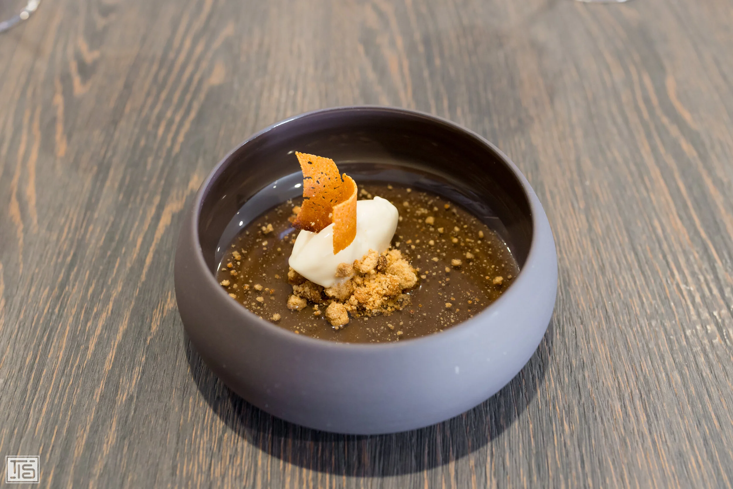 Von einem ganz anderen Kaliber ist Deklination der Karotte. Aus dem Wurzelgemüse macht Germanier ein mit Kümmel aromatisiertes Glacé, einen Biscuit, packt Stücke von fermentierter Karotte dazu und lässt am Tisch noch eine mit Ingwer abgeschmeckte Jus angiessen. Auch wenn der Gesamteindruck relativ süss ist, driftet man dank der präsenten Schärfe des Ingwers und der kräftigen, orientalischen Kümmelnote nie in plumpe Belanglosigkeit ab. Auch das Texturspiel zeigt sich relativ abwechslungsreich und trägt zusätzlich zum guten Gelingen bei. Man kann beileibe nicht von einem unvergesslich guten Gang sprechen, doch in Summe ist das stimmig zusammengestellt, gut umgesetzt und zeigt diese gewisse Liebe zum Detail, die man man in einem solchen Restaurant erwartet.