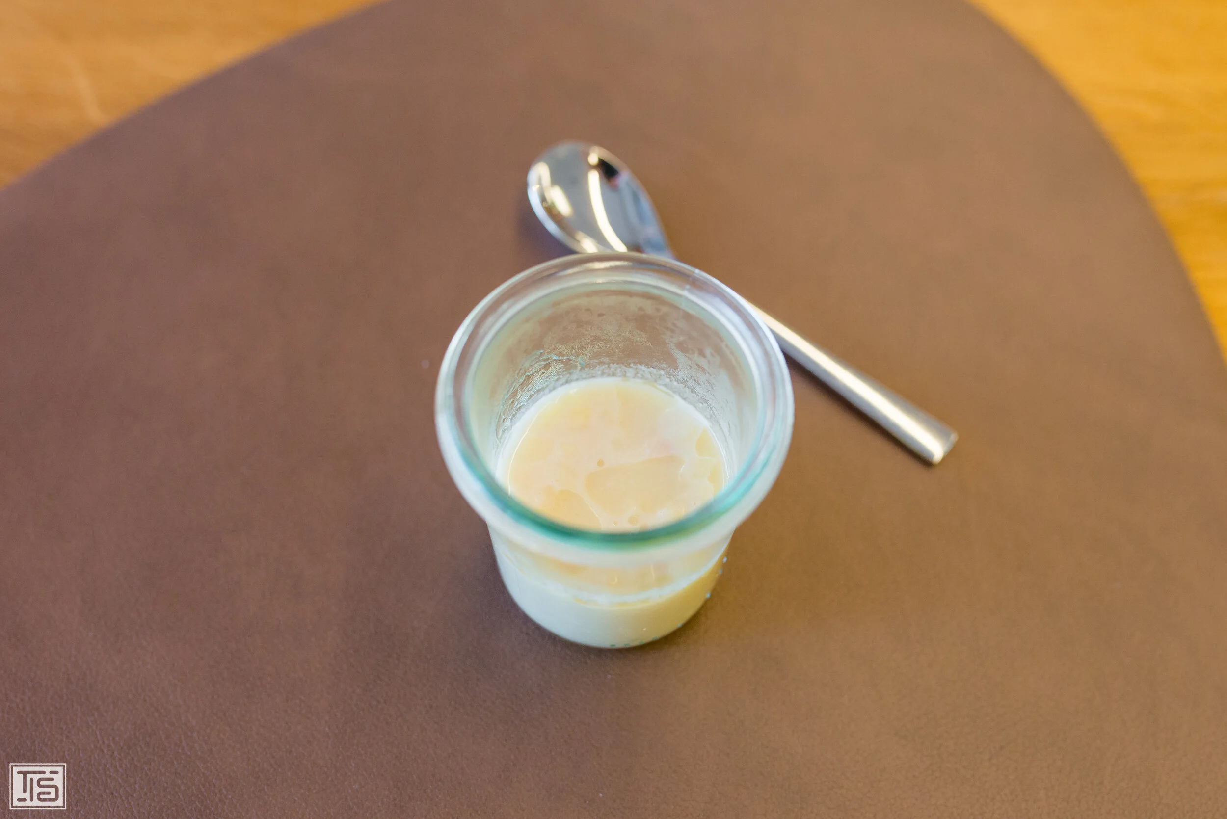 Von der sommerlichen Côte d’Azur geht’s direkt zurück ins herbstliche Deutschland. Kalbszunge, geräucherter Aal, rote Bete, Meerrettich und Dill ist zwar erwartungsgemäss eher auf der deftigen Seite, kann aber dennoch mit der für Grom typischen Finesse aufwarten. Anders gesagt, es ist nicht plump und mächtig, sondern abwechslungsreich und vergleichsweise leicht. Die Geschmackswelt ist klar dunkel, wiederum gekonnt in Rauch gehüllt, fleischig, erdig und kräftig. Für die benötigte Balance auf dem Teller sorgt die angenehm belebende Schärfe des Meerrettichs sowie die kühl-grüne Anis-Kräuterigkeit des Dills (von dem es gerne ein bisschen mehr sein dürfte). So gut der Hauptteller bereits ist, der eigentlich Höhepunkt dieses Gangs ist die Bouillon, die im doppelwandigen Espressoglas ihre einschneidende Hitze gut bewahrt hat. Was diese paar Schlucke an wundersam tiefer Komplexität entfalten, entbehrt eigentlich jeglichem weiterführenden Versuch einer Beschreibung. Unfassbar gut. Nur schon hierfür hat sich der Trip nach Aasen gelohnt.