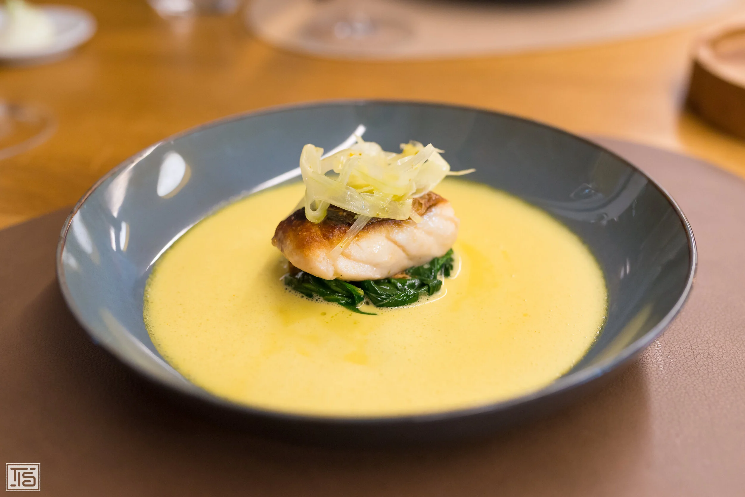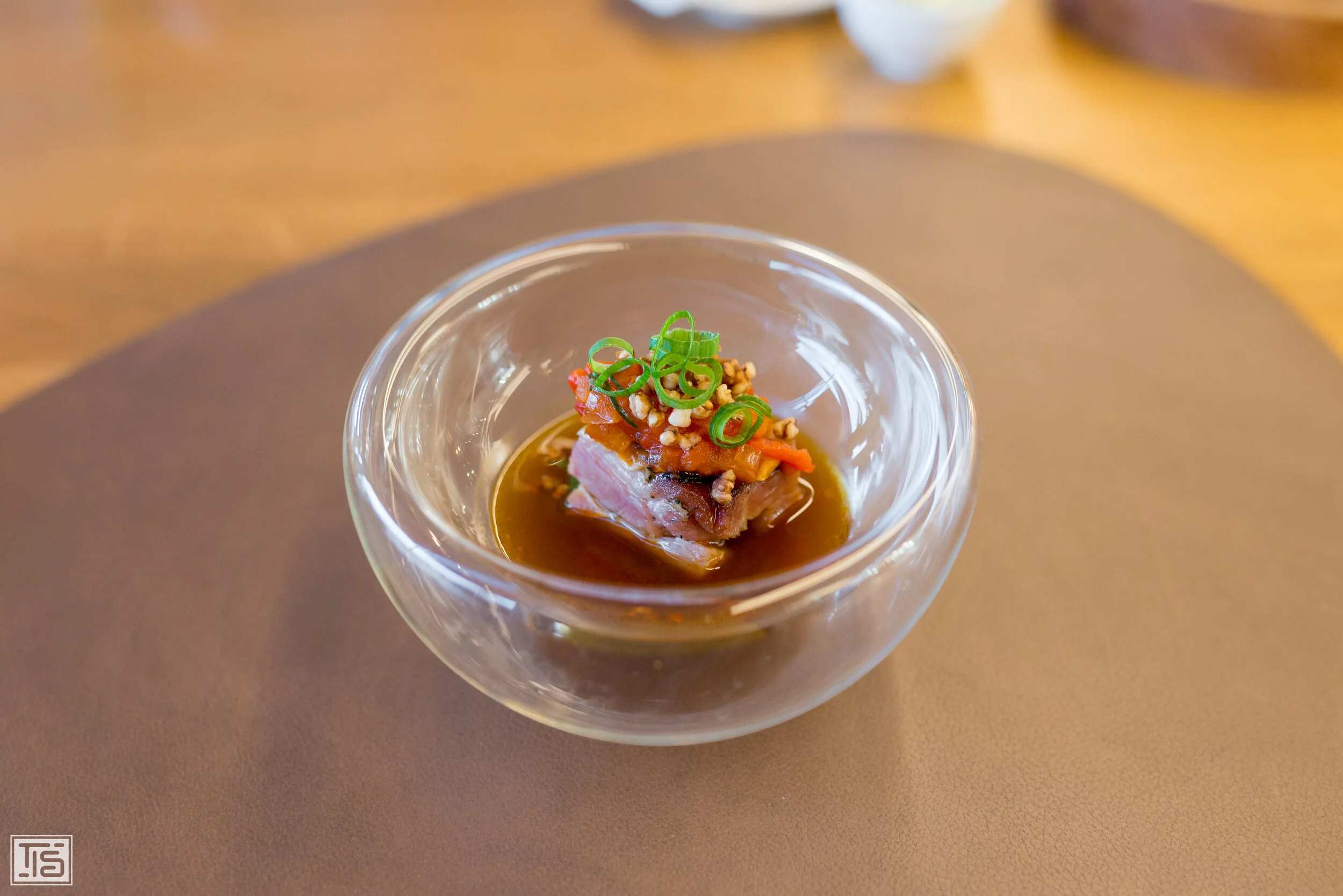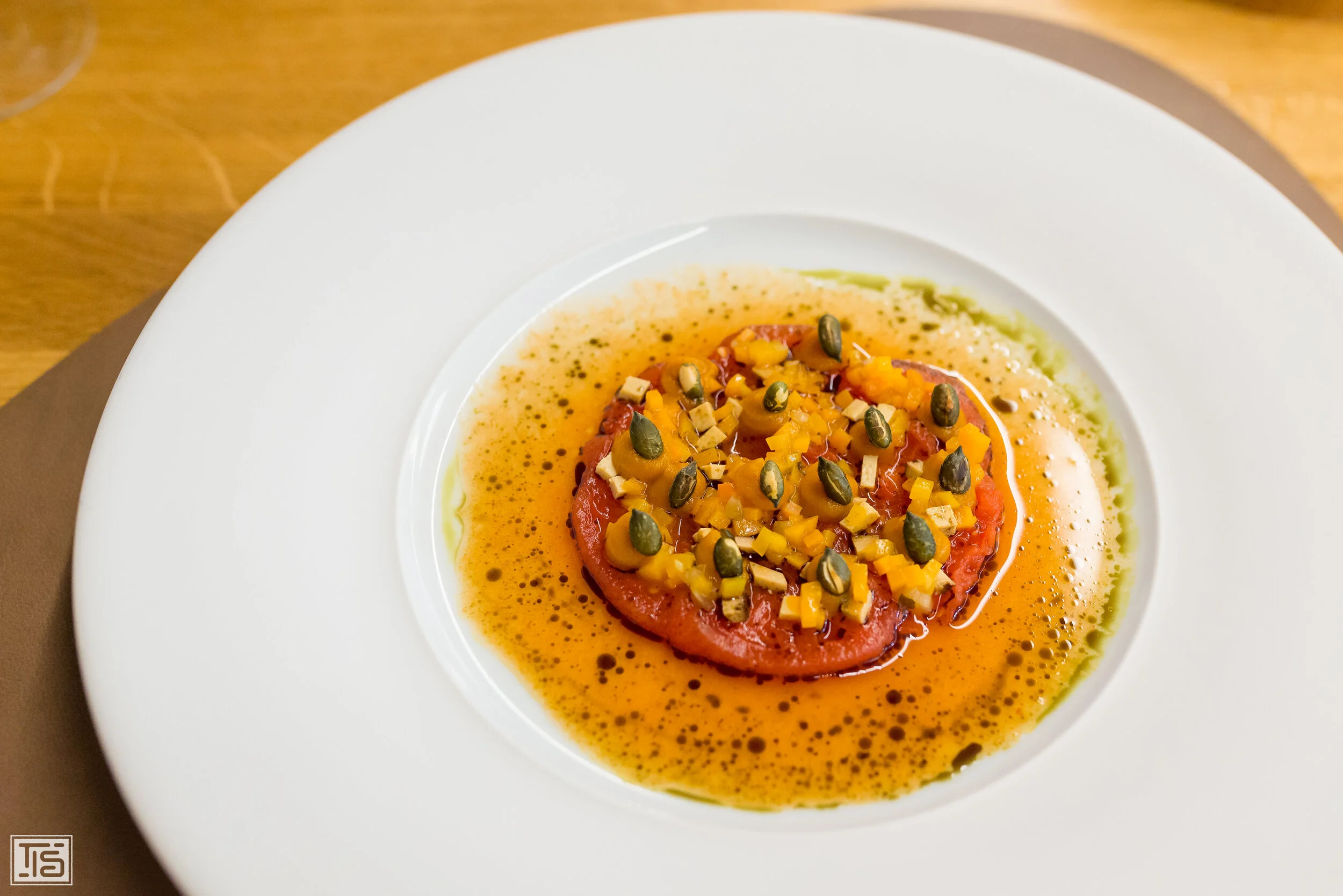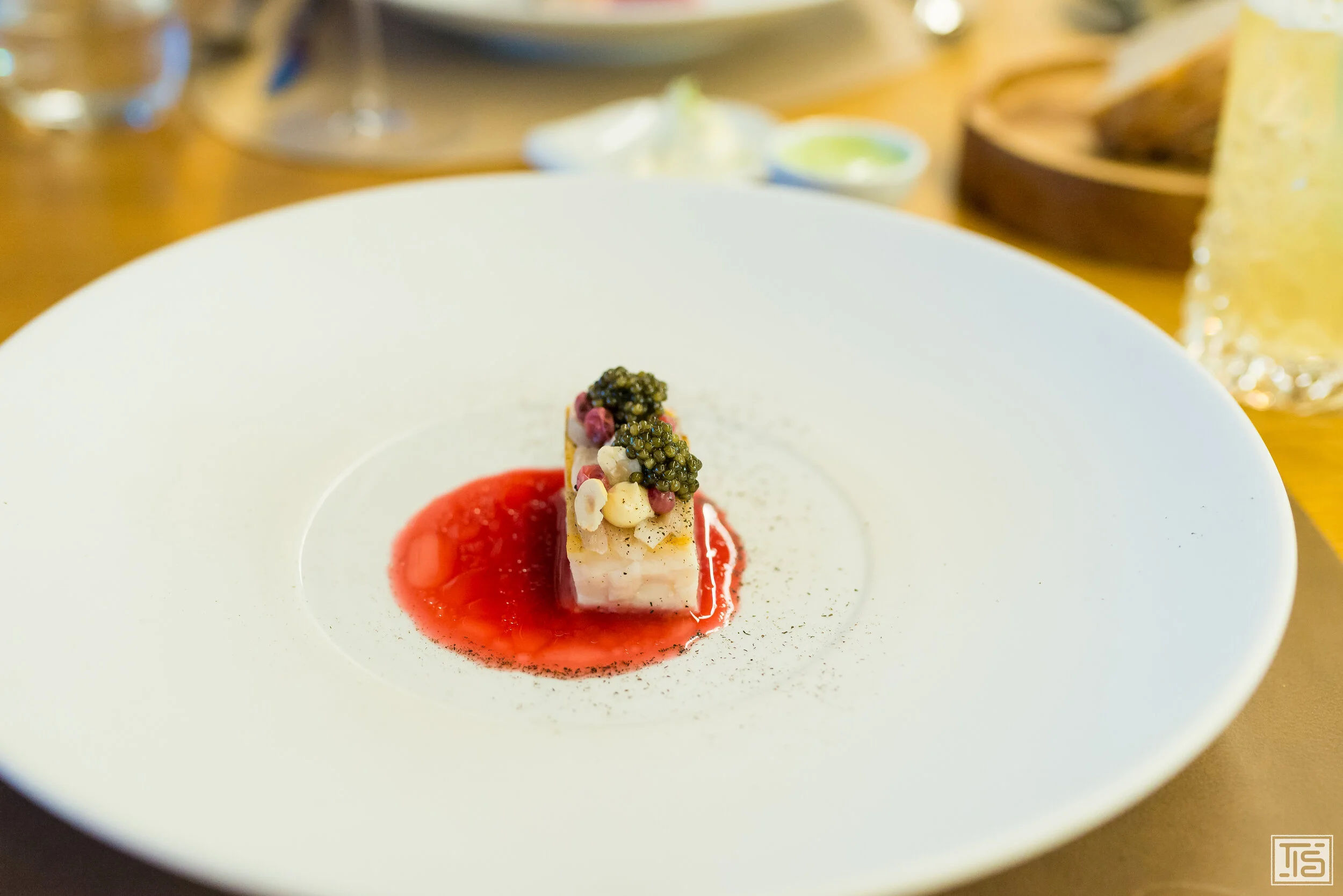 Weiter geht’s vegetarisch mit einer Ochsenherztomate, die mit Tomaten-Ponzu, mariniertem Butternusskürbis und geräuchertem Tofu kombiniert wird. Klingt beim Annoncieren erstmal sehr gewöhnungsbedürftig, erweist sich jedoch bereits bei der ersten Gabel als unerwartetes Glanzstück. Die Tomate fungiert hier quasi als Fleischersatz, wird gustatorisch klar in den Mittelpunkt gerückt und wartet mit einer selten gekosteten Intensität und reichlich natürlichem Umami auf. Während der deklinierte Kürbis eine subtil-vegetabile Süsse sowie etwas Nussigkeit und Crunch (durch die Kerne) beisteuert, sorgt der Tofu einmal mehr für subtile Räuchernoten. Man könnte denken, dass sich diese Aromatik nach dem dritten Teller in Folge abgenutzt hat, doch Grom geht mit diesem durchaus schwierigen, da oftmals falsch eingesetzten und dadurch penetranten Geschmack, geradezu exemplarisch um. So eingesetzt, kann es eine Kreation um eine zusätzliche Dimension erweitern und für spannende Akzente sorgen. Genau das geschieht hier. Entscheidend für den sehr guten Gesamteindruck ist jedoch die Ponzu, die durch ihren herben Säureunterbau und die intrinistische Komplexität alles optimal zusammenführt.