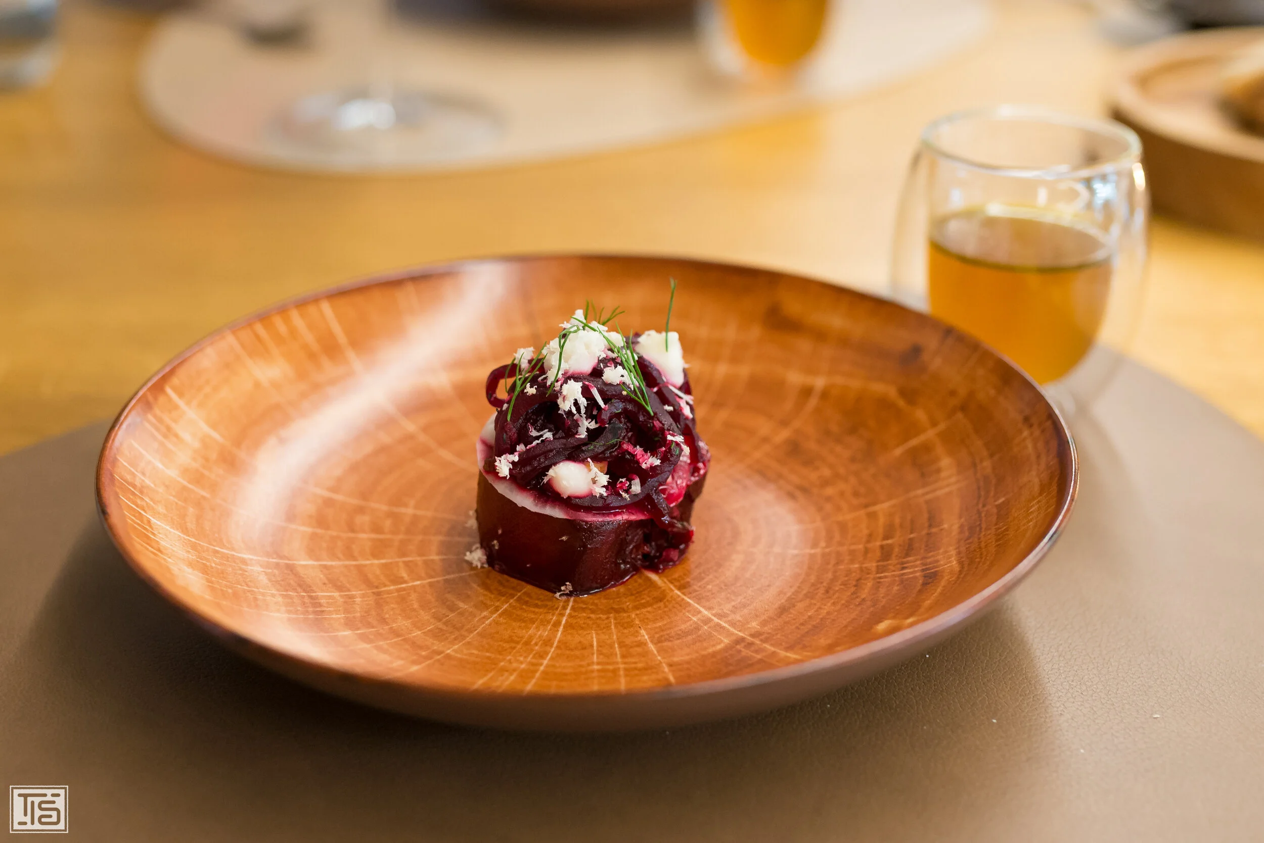 Das zweite Amuse Poltinger Lammbauch, Mispel-Paprika-Kompott und Buchweizen setzt nach der tollen Suppe direkt ein frühes Ausrufezeichen. Saftiger, zarter, hocharomatischer Lammbauch, der seinesgleichen sucht. Ein veritables Produkthighlight, das dank der kongenialen Mitspieler ins perfekte Licht gerückt wird. Eine fruchtige Süsse macht sich bemerkbar, der eine herbe Säure gegenübersteht. Dazu eine rauchige Aromatik, eine erdige Nussigkeit und zu guter Letzt eine grandiose Jus, die alle Elemente perfekt zusammenführt. Wow! Besser geht es nicht. Würde man Michelinsterne für einzelne Teller vergeben, dieser würde locker zwei bekommen. Unfassbar lecker und eine Schande, dass es so schnell vorbei ist. Niklas Grom eröffnet mir angesichts meiner offensichtlichen Begeisterung, dass diese Kreation im vorangegangenen Menü als Gang und nicht nur als Gruss aus der Küche serviert wurde. Wie gerne hätte ich hiervon eine richtig grosse Portion gegessen.