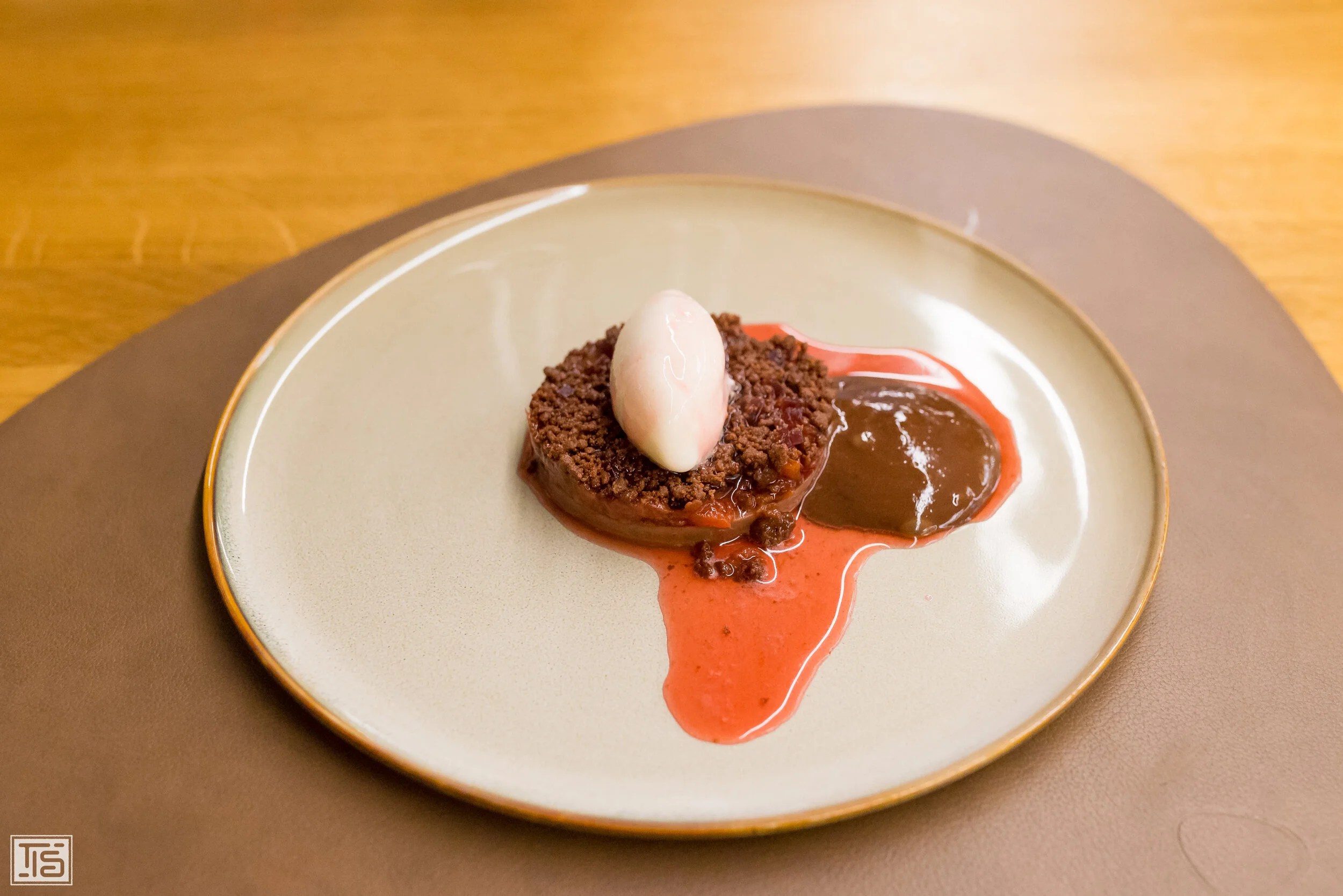 Aus eingemachten Zwetschgen, Earl Grey, einem Riesling-Trauben-Sorbet und dunkler Schokolade besteht das einzige Dessert des Abends. Obschon sowohl die Zwetschgen als auch das Sorbet grundsätzlich genügend Geschmack und vor allen Dingen Säure mitbringen, um der Schoki beikommen zu können, schaffen sie es in diesem Fall nicht. Letztere ist schlicht zu üppig portioniert, womit es sich schwierig gestaltet, auf dem Löffel bzw. im Mund eine richtig harmonische Einheit zu bilden. Der berühmt-berüchtigte Death by Chocolate hat hier mal wieder zugeschlagen. Geschmacklich macht diese Kombo Sinn und ist durchaus ansprechend, allerdings muss noch etwas an der Feinabstimmung gearbeitet werden.