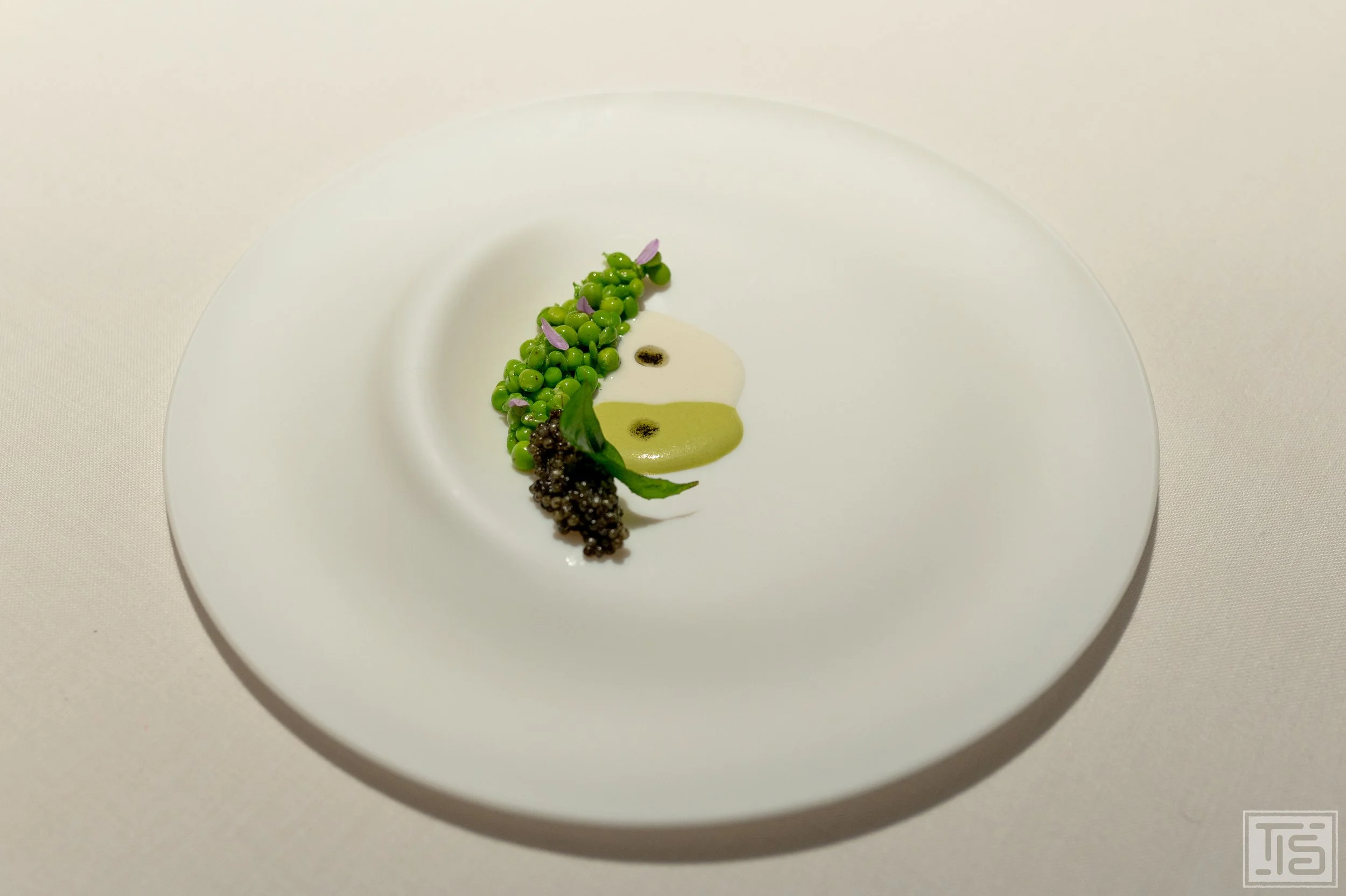 Optische Reminiszenzen an Yin und Yang wecken die Erbsen aus Zamora mit Kaviar aus dem Tandoor mit iberischem Schweinefett, Pistazien, Jalapeño und Macadamia-Kokosnuss-Meerrettich-“Ajoblanco”. Alle Komponenten im Detail herauszuschmecken, gelingt hier nicht. Der Fokus liegt auf fetter Nussigkeit, jodigen Grillaromen und knackiger Gemüsesüsse. Wie fast alle bisherigen Gerichte wird auch dieses von einer subtilen Schärfe getragen. Angesichts der vewendeten Produkte wirkt diese Kreation erstaunlich zurückgenommen, fast schon zart. Einerseits köstlich, andererseits werde ich jedoch das Gefühl nicht los, dass man hier noch mehr rausholen könnte. Es ist wohl gerade die Harmonie, die den Spannungsbogen etwas abfallen lässt. Durch ein disruptives Element oder nur eine pointierter eingesetzte Schärfe könnte aus diesem sehr guten ein grossartigter Teller werden.