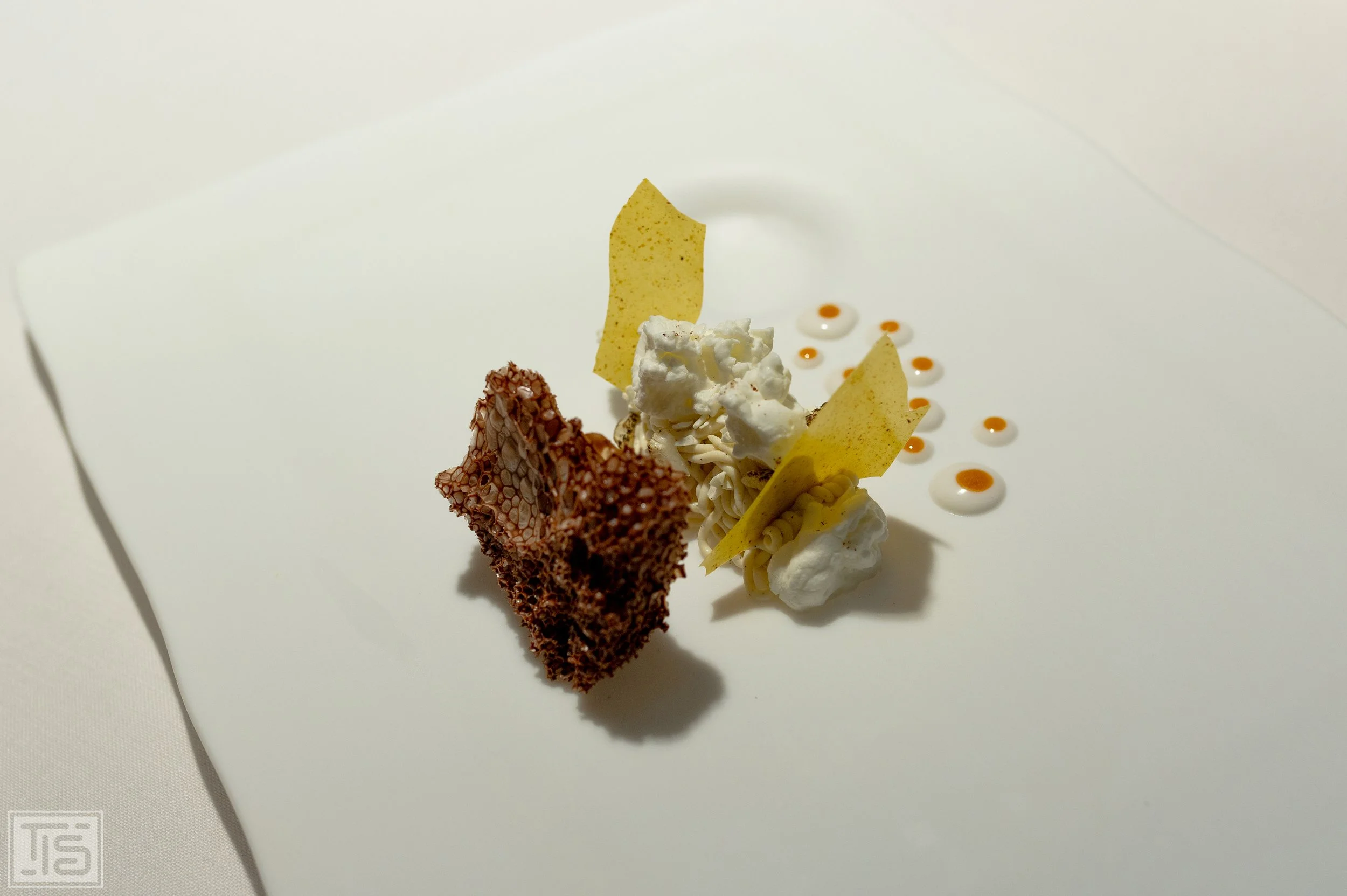 Das Skellet eines Entenkopfs ist kein Zufall, rückt man beim nächsten Gang doch teilweise eher ungewöhnliche Teile des Federviehs ins Scheinwerferlicht. Die gegrillte Entenleber dürfte den meisten Gästen geläufig sein. Das oben aufliegende und in Entensaft marinierte Entenhirn hingegen eher nicht. Die beiden Innereien liegen in einer Sauce aus grüner Tomate und Serrano Chili Pfeffer Gazpacho, die mit Bergamotte aromatisiert wurde. Die Leber ist ganz hervorragend, zart, rauchig und süsslich. Dazu passt die abermals exzellente Gazpacho vortrefflich. Auch das glasierte Hirn in der Mitte harmoniert geschmacklich mit dem Rest und profitiert ebenfalls von der säurebetonten und subtil scharfen Sauce. Allerdings ist die Textur nicht so ganz nach meinem Geschmack. Es lässt mich Bries denken, das nicht lange genug gegart wurde und deshalb noch etwas schleimig ist. Die ausgebackenen Zungen, treffenderweise auf dem Schnabelknochen angerichtet, bieten kurzweiligen Knusperspass, fallen ansonsten aber nicht weiter auf. Das alles ist zwar gut - die Sauce und die Leber sogar sehr gut - aber weit weniger aufregend oder gar schockierend, als man vielleicht annehmen würde.