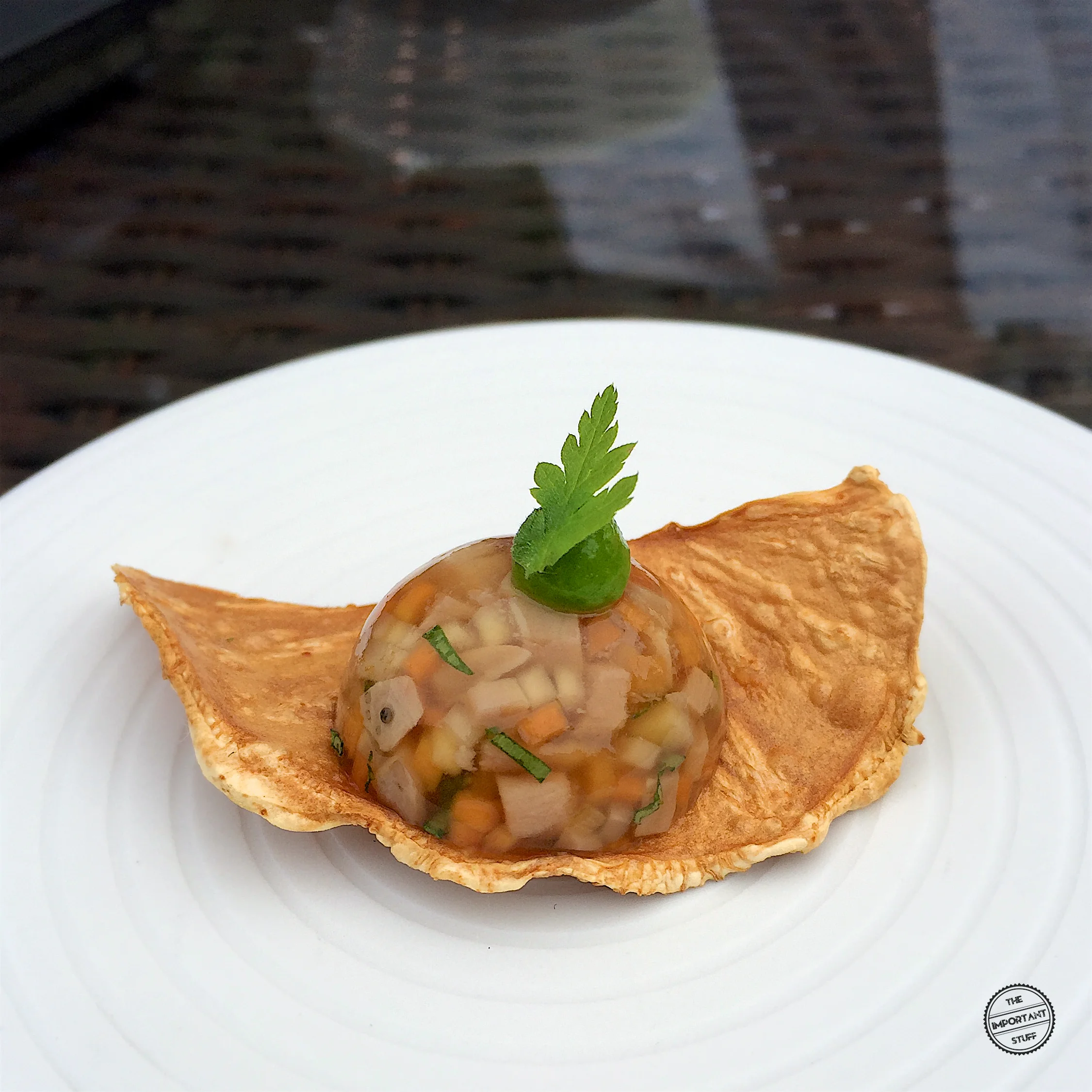 Der Hauptgang der Amuses überzeugt durch einen wunderbar krossen Chip sowie eine wuchtige, äusserst delikate Sülze. Das Handwerk bei der Sülze ist bemerkenswert. Die Konsistenz ist absolut perfekt, die Aromen optimal austariert. Sehr gut.