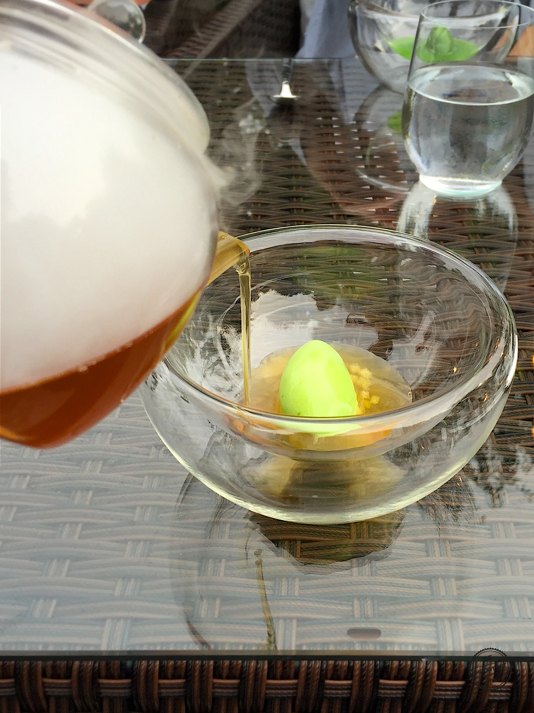 Ein ungewöhnlicher Zwischengang wird vor dem Start des eigentlichen Menüs aufgetischt. Man kennt natürlich das oft vor dem Hauptgang servierte Sorbet. Ein Zwischengang dem ich mit wenigen Ausnahmen (z.B. bei Sven Elverfeld im dreifach besternten Aqua) relativ wenig abgewinnen kann. Doch dieses Sorbet heute macht absolut Sinn. Zuerst mal natürlich weil es so lecker ist. Und es wird seinem Zweck als "Zungenreiniger" absolut gerecht. Die Kombination aus säuerlichem Apfel mit dezent eingearbeitetem Korianderaroma wirkt kühlend und erfrischend. Dazu gesellt sich ein Apfeleistee, der mit spürbarem Tannin den Speichelfluss anregt. Eine sehr gelungene Idee und äusserst schmackhaft.