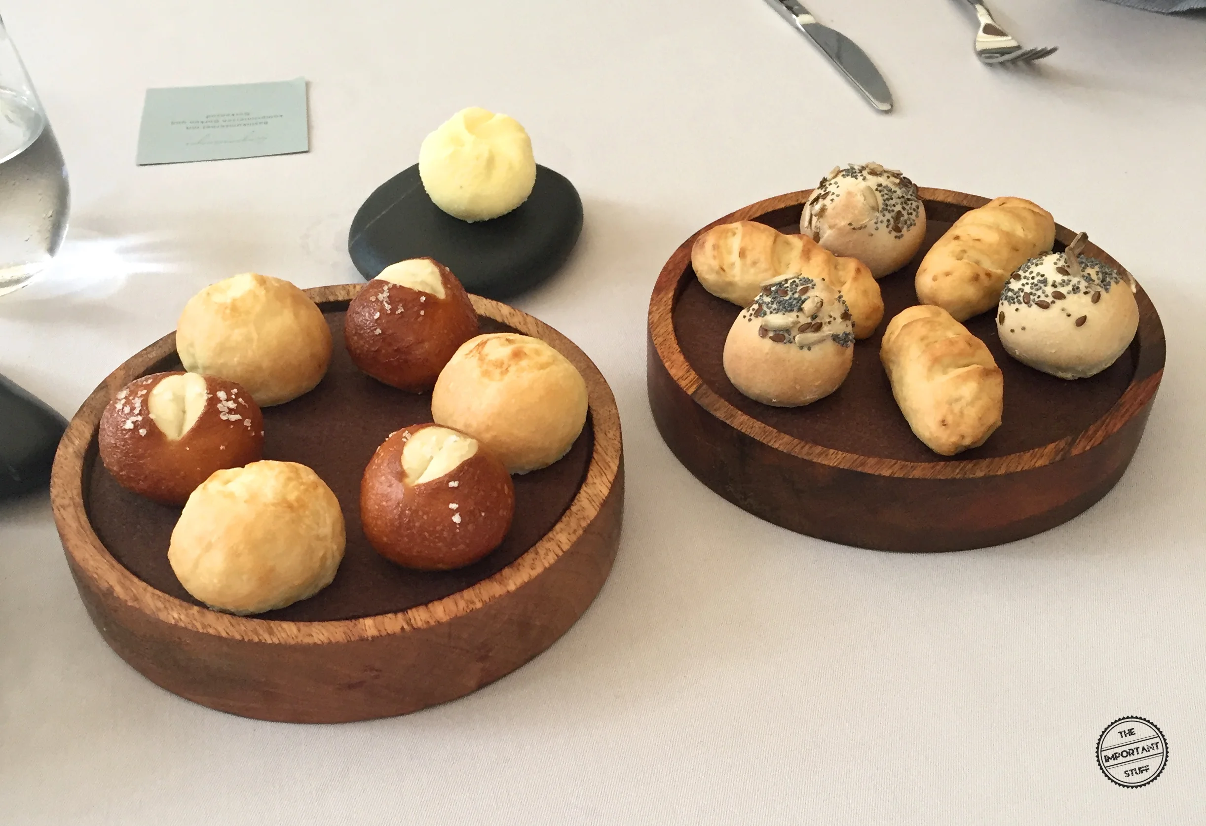 Vor dem ersten Gang wird eine Auswahl hausgemachter Brötchen aufgetischt. Die haben es in sich. Die Gebäcke sind noch warm, fluffig und absolut umwerfend im Geschmack. Sie sind allesamt so gut, dass ich mich davon abhalten muss, sie restlos zu vertilgen. Das ist eines der besten Brotensembles, das ich seit langem serviert bekommen habe. Köstlich.
