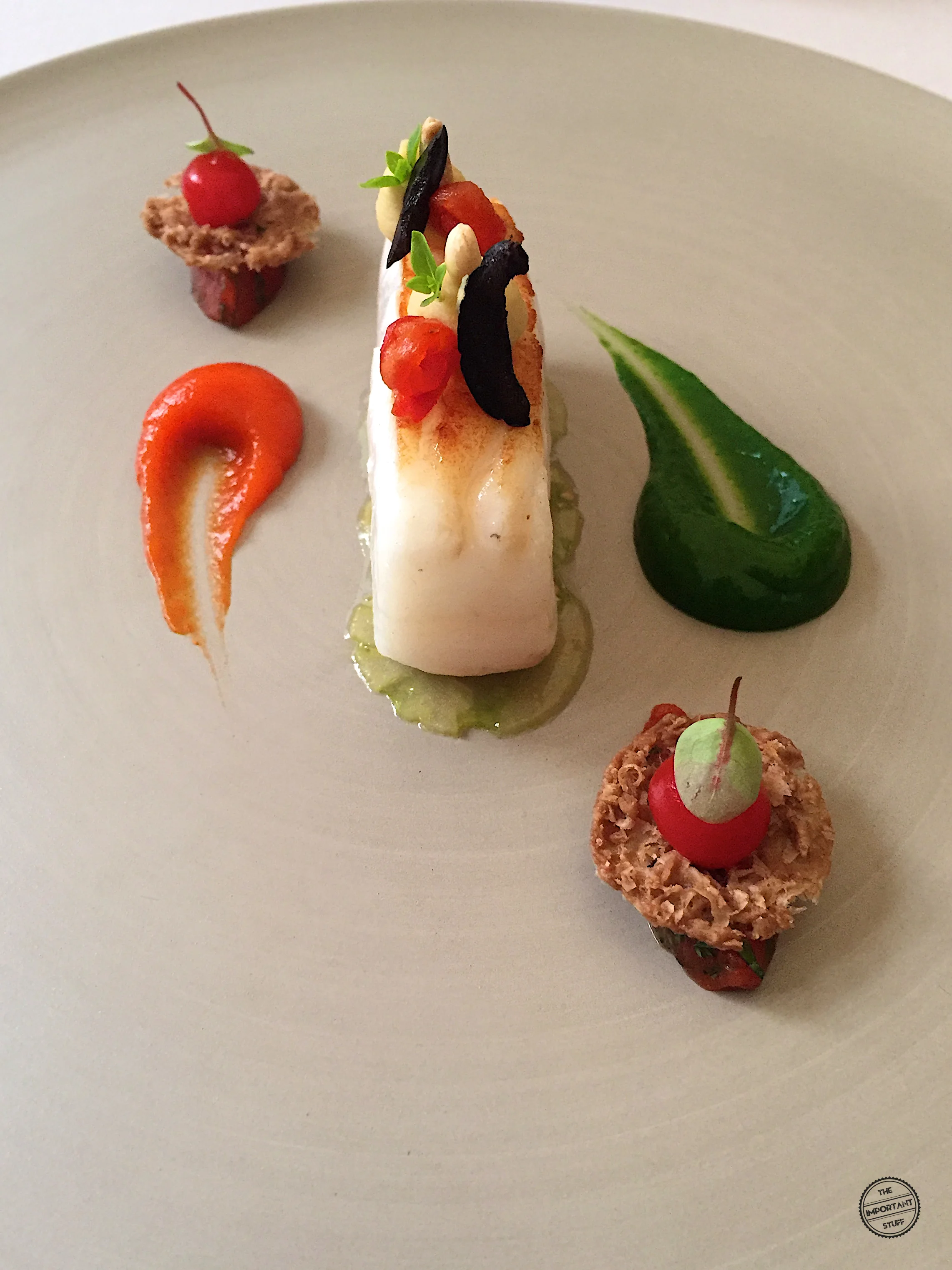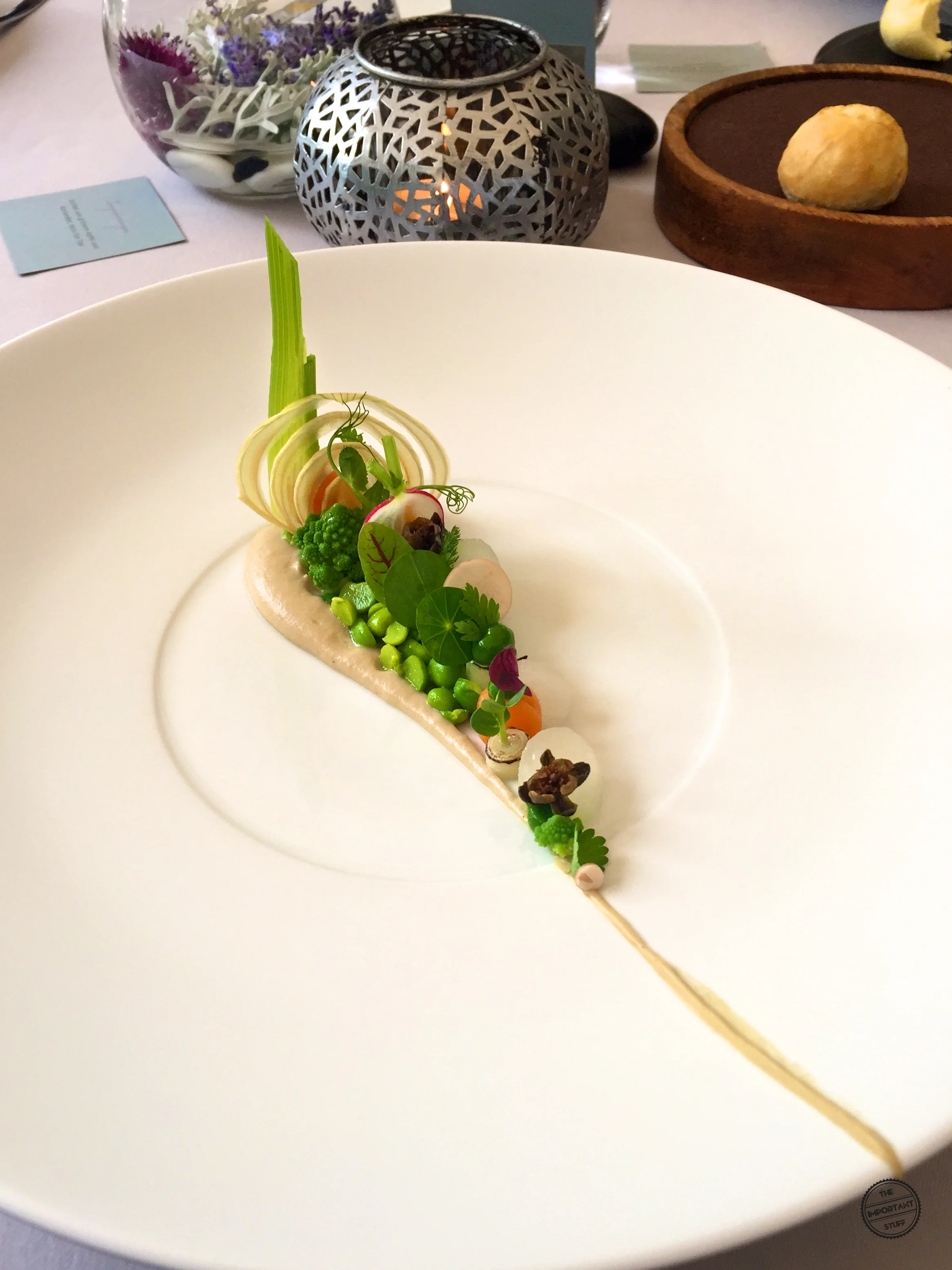 Beim Eröffnungsgang wird optisch einiges geboten. Wunderhübsch. Der Geschmack steht der Optik in nichts nach. Die marinierten, frischen und gepickelten Gemüse wie Erbsen, Fenchel, Navetten, Rettich, Karotten und viele mehr, strotzen nur so vor sonnengeküsster Frische. Die vielen tollen Gartenbewohner werden durch eine angenehm bittere Artischockencrème kongenial zusammengebracht. Dazu gesellen sich noch diverse Kräuter aus dem Restaurantgarten, die zusätzliche Frische und Komplexität ins Spiel bringen. Eine Petersiliencrème sorgt als vegetabil-grünes Element für zusätzliche gustatorische Abwechslung. Lediglich die frittierten Kapern hätten für meinen Geschmack etwas präsenter ausfallen dürfen. Dennoch: ein vegetarischer Teller, wie er besser kaum sein könnte. Und eine hohe Messlatte für die kommenden Gänge.
