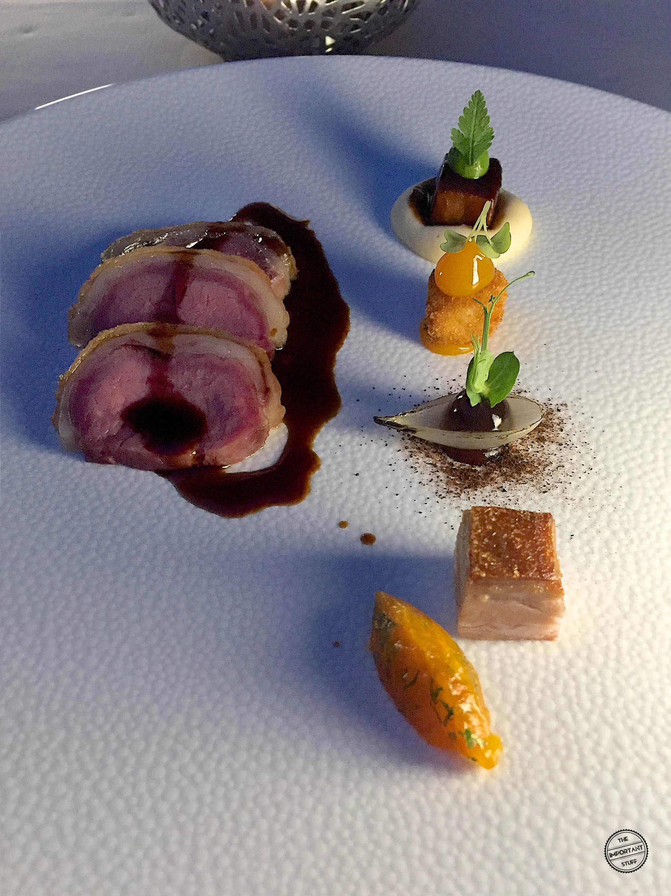 Eine schneeweisse Tranche Steinbutt französischer Provenienz wird mit allerlei Aromen aus dem Mittelmeerraum kombiniert. Besonders gut schmeckt dieses Gericht vor allem dann, wenn Hummus mit auf der Gabel landet. Wie beim vorherigen Gang ist der orientalische Einfluss auch hier stimmig und verhilft der ansonsten eher braven Kombination zu höheren Weihen. Das Zusammenspiel des toll abgeschmeckten Hummus mit den nach Sonne duftenden Tomaten, dem leicht pikanten Peperonipüree und dem hocharomatischen Basilikumpüree ist grosse Klasse. Einen gewissen Punch in Form von Salzigkeit und Bitterkeit durch die Oliven vermisse ich jedoch ein wenig. Generell sind die einzelnen Komponenten, mit Ausnahme des Hummus, etwas zu zaghaft gewürzt. Ich bin kein grosser Freund von viel Salz in meinem Essen, doch ich denke, hier hätte das eine oder andere Flöckchen Fleur de Sel durchaus helfen können, den Teller noch besser zu machen.