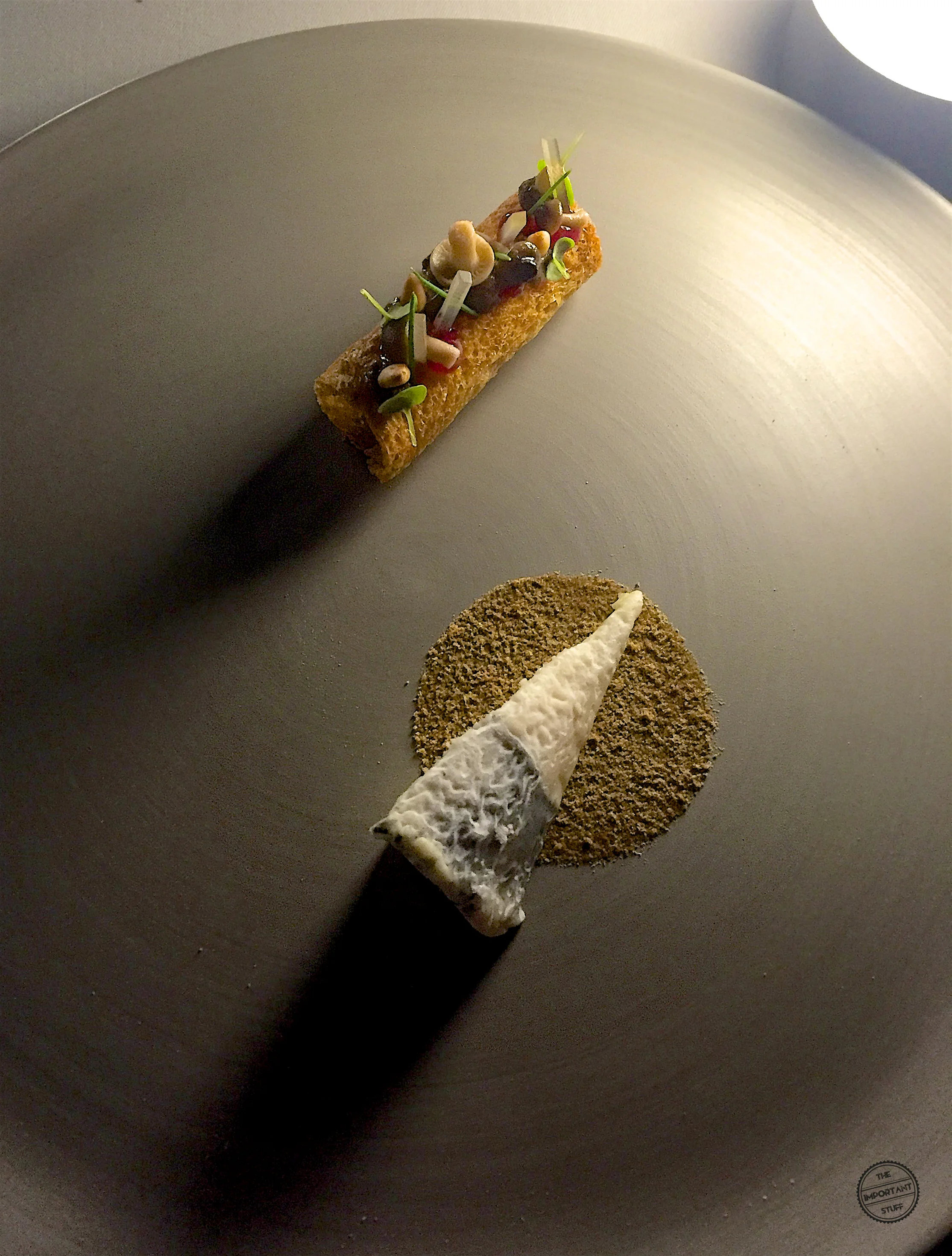 Immer wieder erstaunt es mich aufs Neue, wenn heutzutage noch ein Sponge in einem Menü auftaucht. Dieses Relikt aus den molekularen Küchenrevolutionszeiten schmeckt im schlechtesten Fall nämlich nach ziemlich genau gar nichts. Lustigerweise werde ich vor allem in der Schweiz immer wieder positiv von solchen Überbleibseln vergangen geglaubter Küchentage überrascht (z.B. hier). Auch Speinle bringt es fertig, dass der Schwamm tatsächlich nach Haselnuss schmeckt. Zudem weist er eine angenehme Textur auf, die die weiteren Aromen in Form von Kaffeepulver, Foie-Gras-Parfait und einer Tabakcrème wunderbar miteinander verbindet. Sehr schön.
