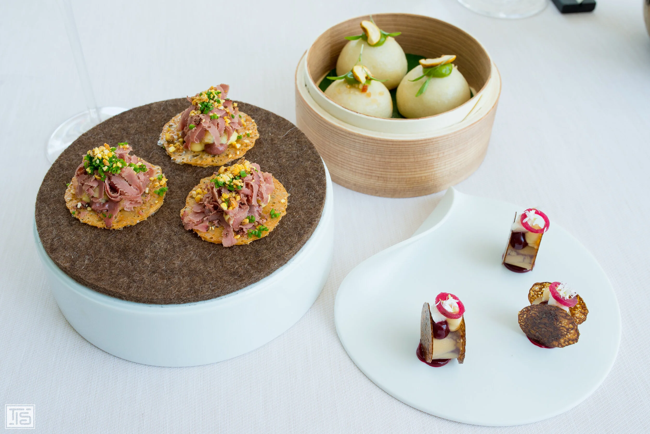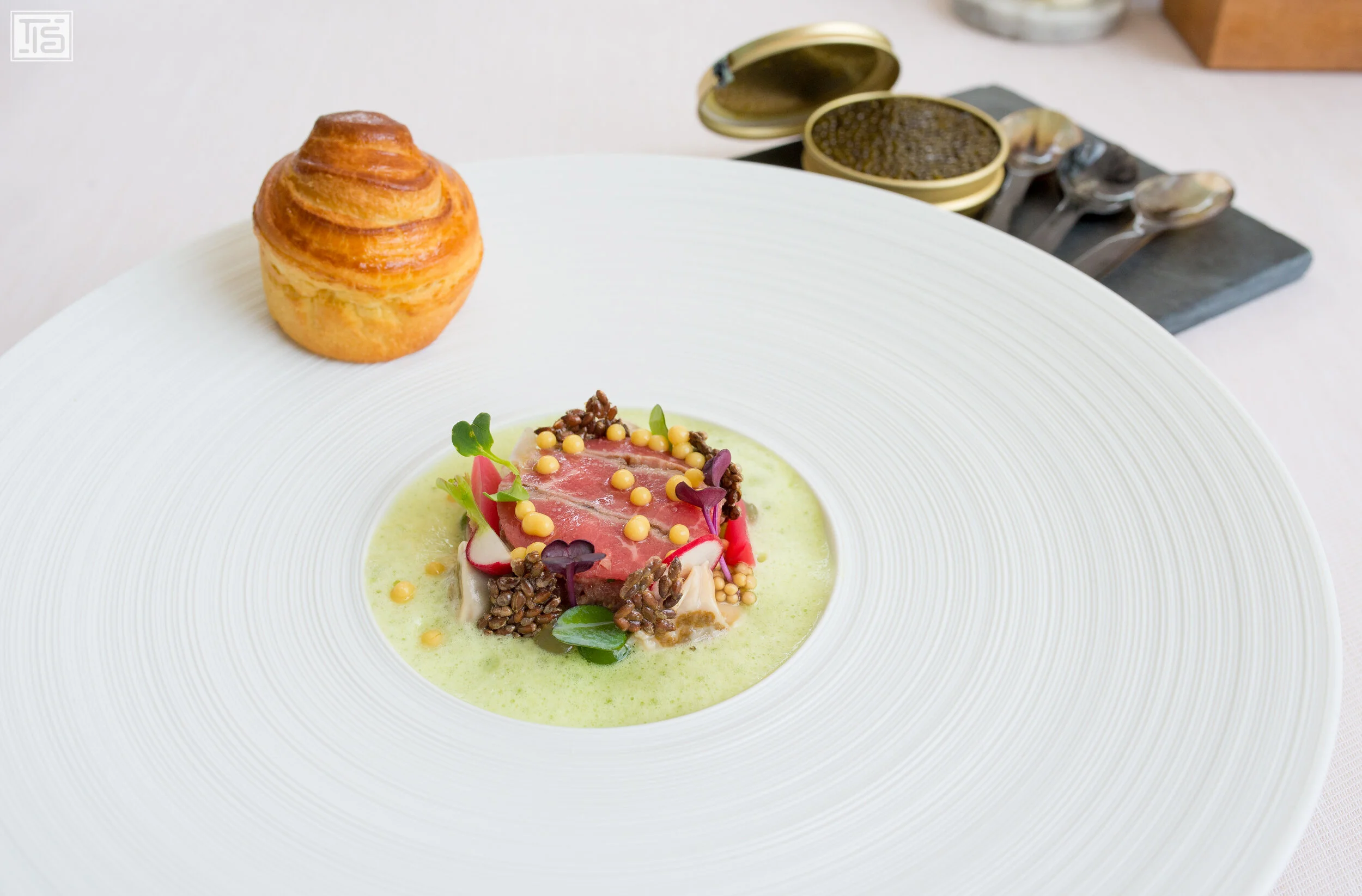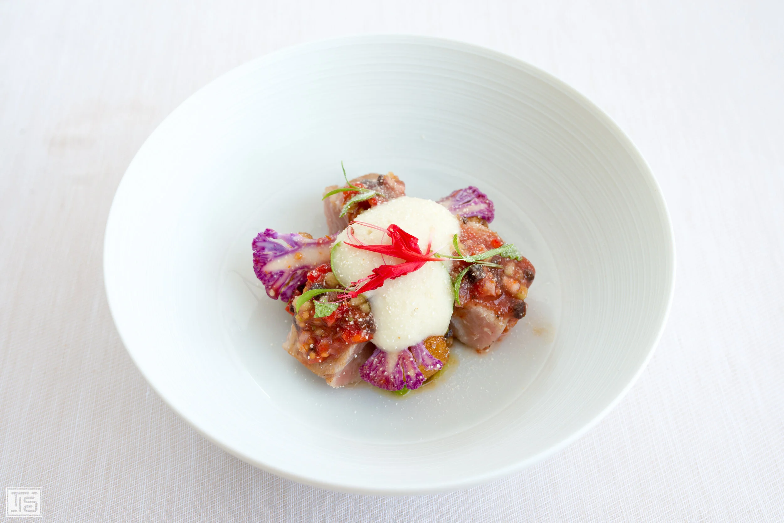 Bauch und Herz vom Balfegó Thunfisch, Blumenkohl, Thai Salsa und Minze sind die Protagonisten von Gang Nummer zwei. Wenn man auf eines der dickeren Stücke des Bauchs beisst, spritzt einem das herrliche Fett des Fischs förmlich im Mund herum. Das hilft der gründlichen Verbindung aller Komponenten und pusht die einzelnen Aromen noch weiter nach vorne. Das Geschmacksbild zeigt sich grundsätzlich harmonisch, die Salsa sowie die Minze sind ein toll gewählter Konterpart zum Thun. Allerdings hätte ich mir gewünscht, dass gerade die Salsa noch einen Ticken mutiger abgeschmeckt ist. Das könnte das intensive Fleisch locker vertragen. Doch das ist bereits Meckern auf einem Niveau, auf dem es nur noch auf Nuancen ankommt. Einziges wirkliches Manko an diesem Gang ist die, zumindest für mich, viel zu grosse Portion. Aufgrund der Beschaffenheit des Gerichts und dem frühen Zeitpunkt im Menü, hätte mir auch die Hälfte gereicht. Doch ich bin sicher, dass das viele Gäste anders sehen dürften.