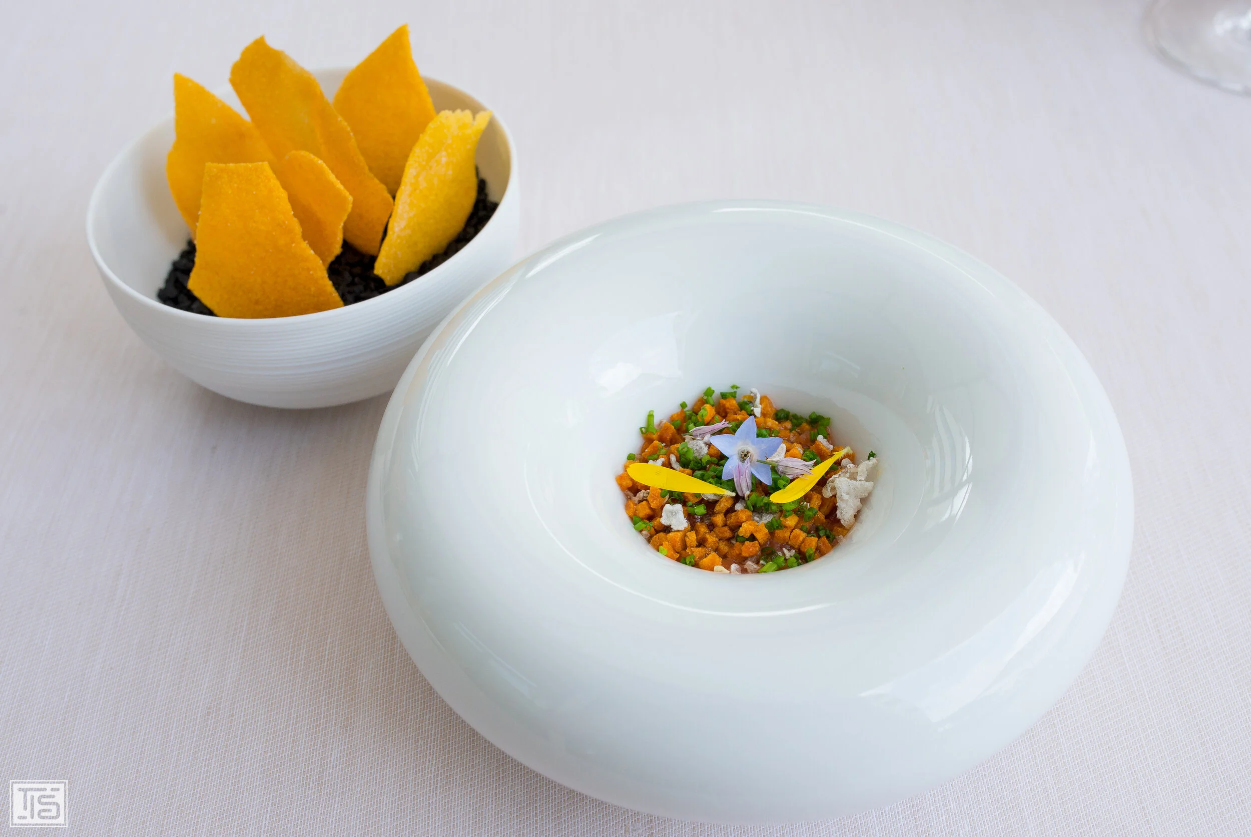 Als Amuse wird eine Ceviche von der Lachsforelle mit Süsskartoffel und Maracuja aufgetragen. Obwohl der Fisch wortwörtlich begraben wurde, ragt er doch aus diesem Ensemble heraus. Heilemann geht bei seinen Produkten absolut keine Kompromisse ein, was sich in diesem Fall in der feingliedrigen Fettigkeit und einem sehr elegant und pur schmeckenden Fleisch äussert. Dazu passt die vorsichtig dosierte fruchtige Säure der Maracuja ebenso exzellent wie die knusprigen Kartoffeln und der zwiebelige Kick des optimal dosierten Schnittlauchs. Letzterer bringt einen dezent rustikalen Touch ins Spiel, der für zusätzliche Spannung sorgt. Sehr schön.