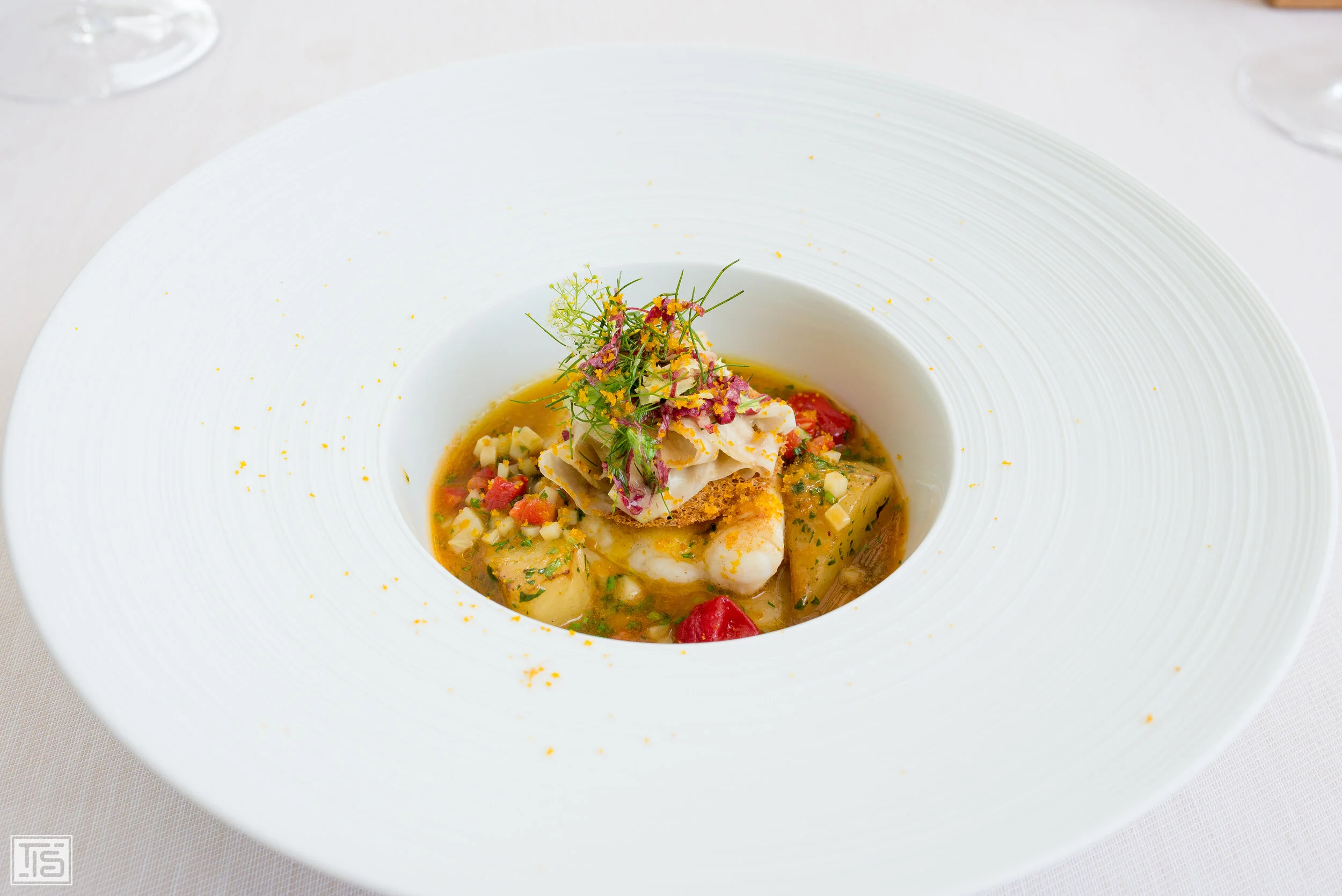 Weiter geht die Fahrt durch die Weltmeere mit Bretonische Seezunge, Artischocke, Bottarga und Escabeche. Bereits die an eine Bouillabaisse erinnernde Optik lässt erahnen, dass es sich hierbei um einen molligen Wohlfühlteller höchster Güteklasse handeln könnte. Der Eindruck täuscht nicht, wie der erste Bissen direkt zeigt. Und auch der Vergleich mit der provenzalischen Fischsuppe hinkt nicht. Es ist viel los hier, und es fühlt sich zeitweise so an, als ob auf meinen Papillen ein wildes Rodeo geritten wird. Das rührt in erster Linie von der pointierten Säure sowie der durchaus markanten Würzung - inklusive dem heftigen Umami-Sturm des Bottarga - her, die dem Ganzen einen herrlich rustikalen Unterbau verleihen. Dennoch zeigt sich das Arrangement höchst elegant, dank des saftig-noblen Plattfischs und vor allen Dingen den zarten Bitternoten der Artischocke, die alles wunderbar zusammenbringt.
