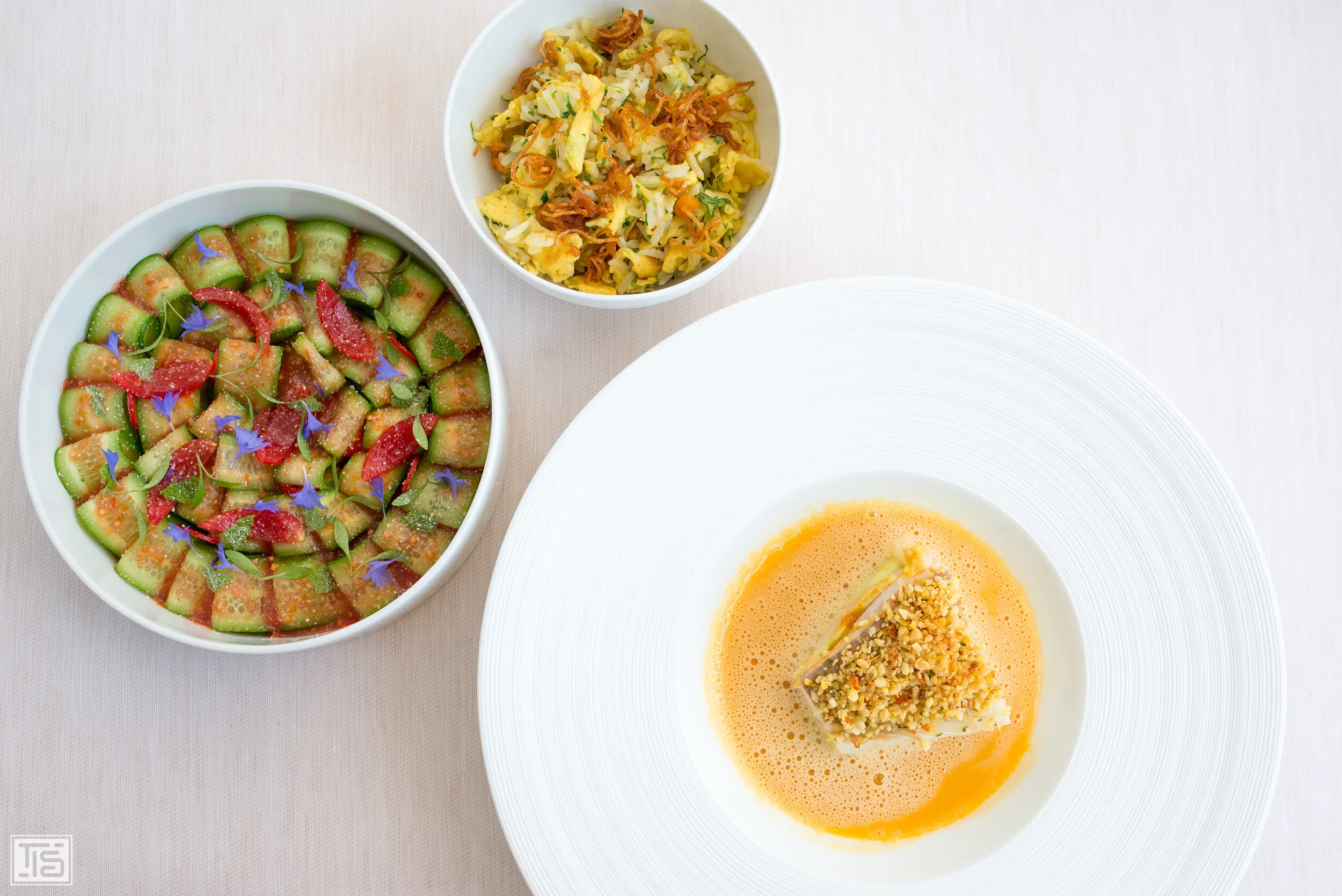 Sommelier und Restaurantleiter Stefano Petta präsentiert als nächstes einen Steinbutt, im Ganzen gegart, der zur Fertzigstellung direkt zurück in die Küche wandert. Einer meiner absoluten Lieblingsfische, was die Vorfreude gleich nochmals steigen lässt. Als der Butt auf dem Teller seinen Weg zurück zum Tisch findet, ordentlich zurecht geschnitten, wird auch der Rest vorgestellt. Der Fisch wird mit Kaisergranat gefüllt und mit rotem Curry, Spicy Gurkensalat und Fried Rice serviert. Die Vorliebe des Chefs für die Küche Thailands wird spätestens jetzt für alle erkennbar. Doch in kaum einem Restaurant im Land des Lächelns wird man wohl jemals so eine verdammt gute Sauce serviert bekommen. Alle Merkmale einer typisch komplexen roten Curry-Sauce sind da, jedoch in einen Fine Dining-Kontext versetzt. Dieses Elixir zeigt feinste Saucier-Kunst, ist hochelegant, tief, vielschichtig und passt absolut perfekt zum Butt. Der wiederum ist trotz seiner kleinen Grösse von enorm hoher Qualität und absolut perfekt gegart. Die Füllung mit einer Farce aus Langoustinen ist eine tolle Idee, die das Gericht zusätzlich verbessert und eine dezente maritime Süsse einstreut. Der knackig-frische Gurkensalat dazu erweist sich als perfekter Partner, umso mehr, wenn man die Temperaturen mit in Betracht zieht. Einzig den Reis dazu brauche ich nicht unbedingt. Abgesehen davon eine weitere Kreation aus der Ecco Küche, die in die Hall Of Fame gehört. So unfassbar gut.