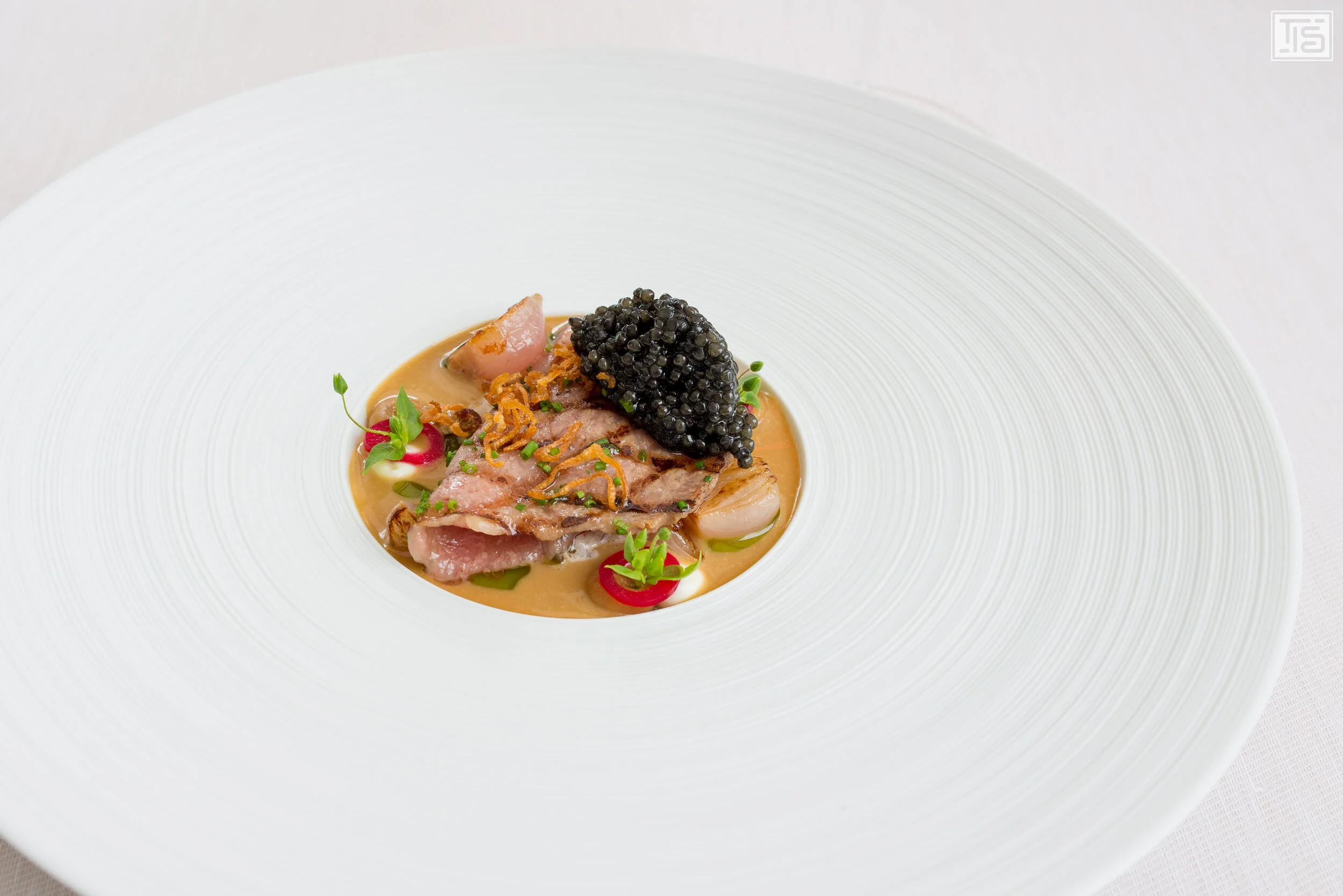 Ein alter Bekannter ist das gegrillte Carpaccio vom japanischen Wagyu Entrecôte “Kagoshima” mit Zwiebeln, Sauerrahm und erneut einer gesunden Dosis Kaviar. Was soll man hierzu bloss sagen, ausser: grossartig! Heilemanns Produktfanatismus zeigt sich auch hier wieder eindrücklich. Und auch seine Fähigkeit, Luxusprodukte erster Güteklasse mit bescheidenen, alltäglichen Produkten zu einem packenden und absolut köstlichen Ganzen zu formen. In diesem Fall ist vor allen Dingen das Wechselspiel der einzelnen Komponenten faszinierend. Heisses, halbrohes Fleisch mit kühlem Rahm. Beides natürlich ordentlich fettig und dadurch ein optimales Vehikel für den Kaviar, um seine jodige Salinität voll zu entfalten. Zusätzlich profitiert das schwarze Gold auch von der Süsse der Zwiebel, die für eine Extra-Dimension sorgt und gleichzeitig die Brücke zurück zum Rahm schlägt. Ganz, ganz grosses Kino.