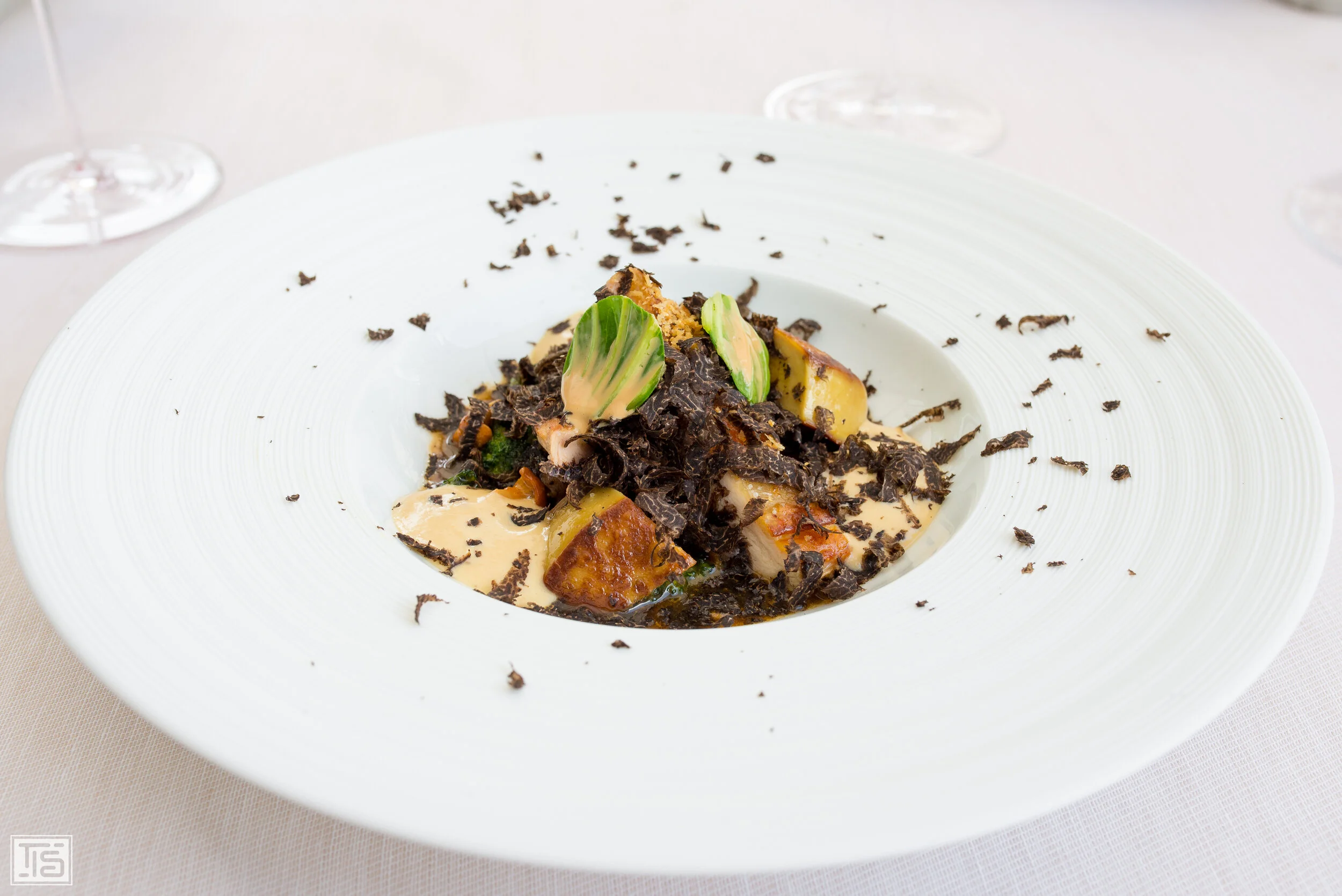 Beim Hauptgang Miéral Perlhuhn „Selection Alfred von Escher“, wilder Brokkoli, Yuzu und australischer Wintertrüffel zeigt Heilemann, dass er im Herzen ein zutiefst klassischer Koch ist. Kein Wunder, wenn man lange Zeit in der legendären Traube Tonbach verbracht hat wie er. Das äusserst sich zwar auch sonst im Verlaufe eines Menüs, z.B. an den herrlichen Saucen, doch in diesem Fall schreit alles förmlich Haute Cuisine française. Das Huhn des wohl weltweit renommiertesten Züchters aus Bresse ist wie zu erwarten von schlichtweg perfekter Qualität und ebenso makellos zubereitet. Dazu eine wunderbare Sauce, der durch die Verwendung der japanischen Zitrusfrucht gekonnt etwas mehr Nachdruck, Säure und Komplexität verliehen wird. Abgerundet durch etwas knackigen Brokkoli und einen grosszügigen Trüffelregen ergibt das ein zutiefst befriedigendes Erlebnis.
