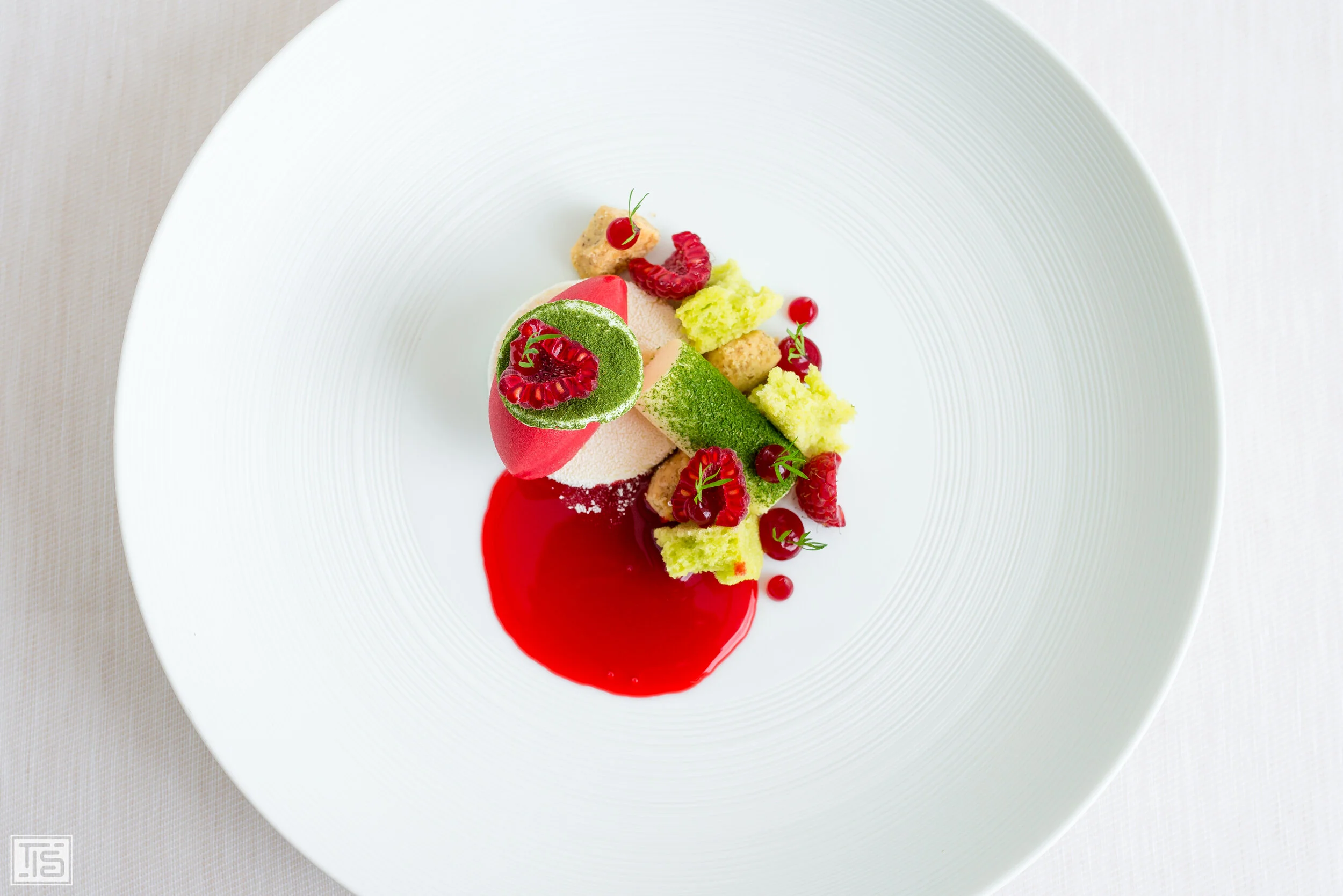 Heilemann tritt für den verbleibenden Teil des Lunchs in den Hintergrund und öffnet den Vorhang für seinen Pâtissier André Siedl. Er stellt sich mit einem Arrangement aus Felchlin Opus Blanc Schokolade, Himbeere und Dill vor. Dill ist ein wiederkehrendes Thema in Siedls Kreationen. Im Gegensatz zu den Kollegen aus dem ganz hohen Norden reizt er das Thema von Kräutern und Gemüse im Dessert aromatisch jedoch nicht auf Teufel komm raus aus, sondern nutzt wie in diesem Fall den Dill eher als Würzelement. Denn geht man der Struktur dieses Arrangements auf den Grund, landet man, ähnlich wie bei Heilemann, in der Klassik. Das fein ziselierte Zusammenspiel von süsser Schokolade der angesehenen Innerschweizer Schokoladenmanufaktur und sommerlich fruchtiger Beere ist genau das: klassisch. Aufgesprengt und in die Moderne geführt durch den Einsatz des eigentümlich würzigen, herben und mit dezenten Anisnoten ausgestatteten Dills, der aus einem sehr guten ein absolut superbes Dessert macht.