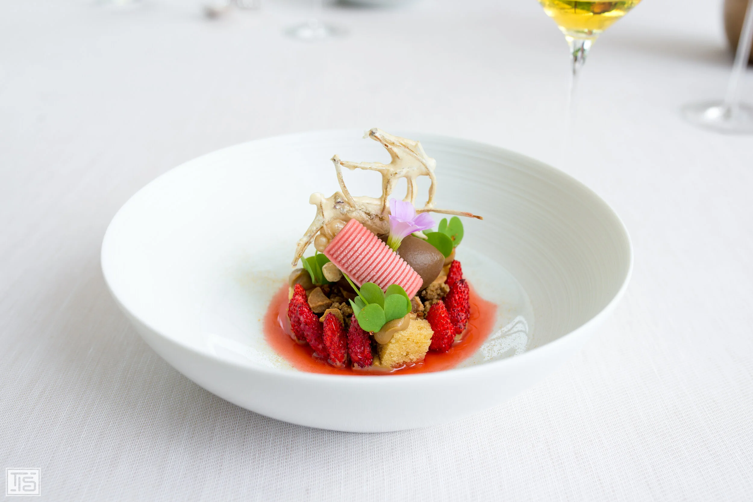 In eine ganz ähnliche Kerbe schlägt die Walderdbeere mit Felchlin Bionda Schokolade, Süssholz und rotem Sauerklee. Das Duett von Schokolade und fruchtiger Beere ist allerdings in diesem Fall merklich süsser, was an der im Vergleich zu den Himbeeren zuvor markant tieferen Säure der Erdbeeren liegt. Dieses quasi fehlende Element bringt Siedl mit dem Sauerklee wieder ins Spiel, der für einen richtig wachrüttelnden Kick sorgt und diese Kreation auf seinen immens leichten Flügeln trägt. Sommer pur. In Summe erneut ein sehr gelungenes Dessert, das allerdings nicht ganz die Höhen des Vorgängers erreicht.