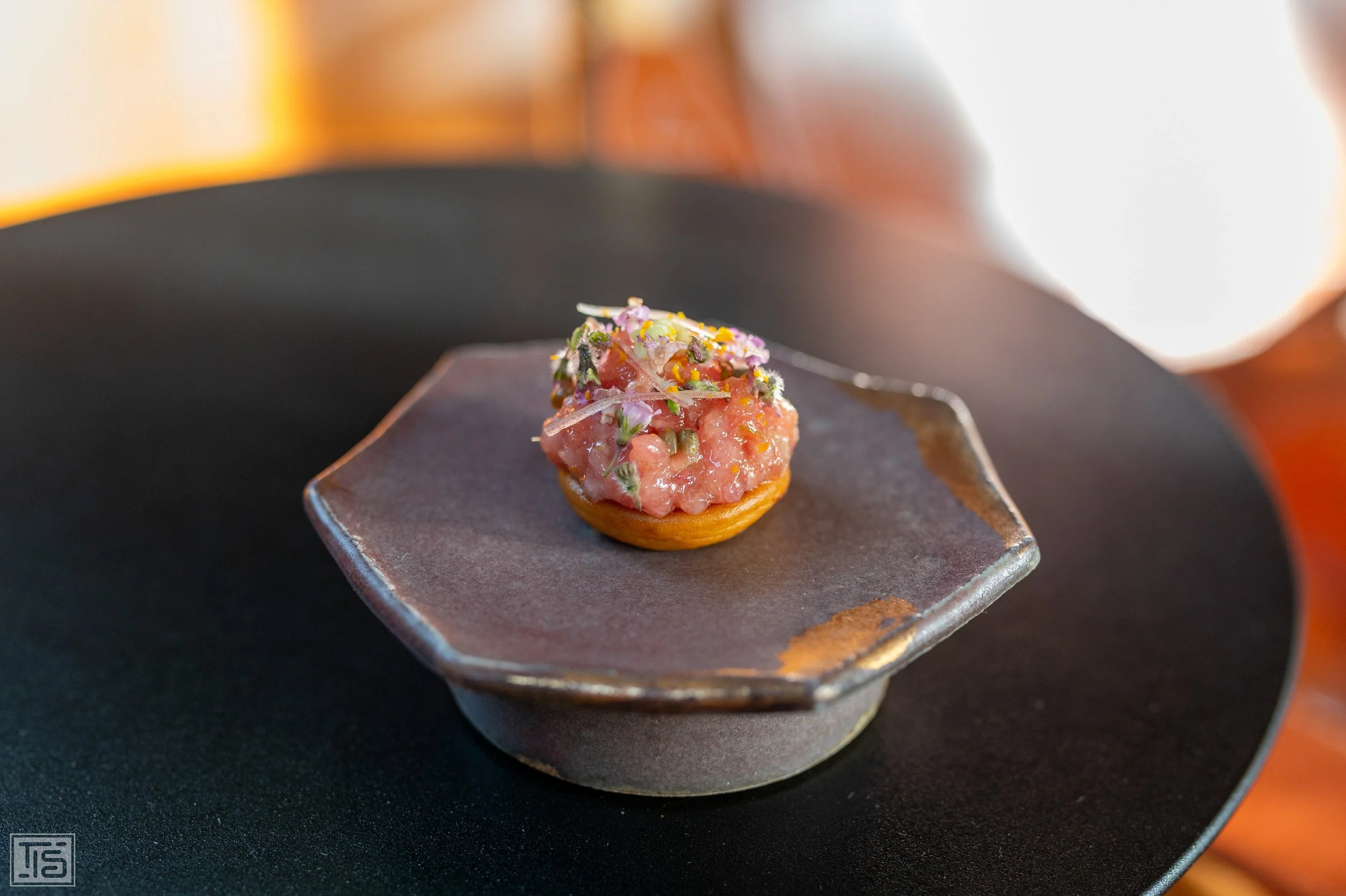 Ungleich komplexer wird es beim Blini mit Otoro, Myoga und Wasabi. Wie der opulente Thunfischbauch durch die zitrische Frische vom japanischen Ingwer sowie die blumige, wohldosierte Schärfe vom Wasabi ausbalanciert wird, zeigt ein enormes Feingespür für Proportionen. Durch den Blini entsteht zusätzlich etwas Kaubedarf, was die floralen Noten des Wasabi hervortreten lässt. Grandios.
