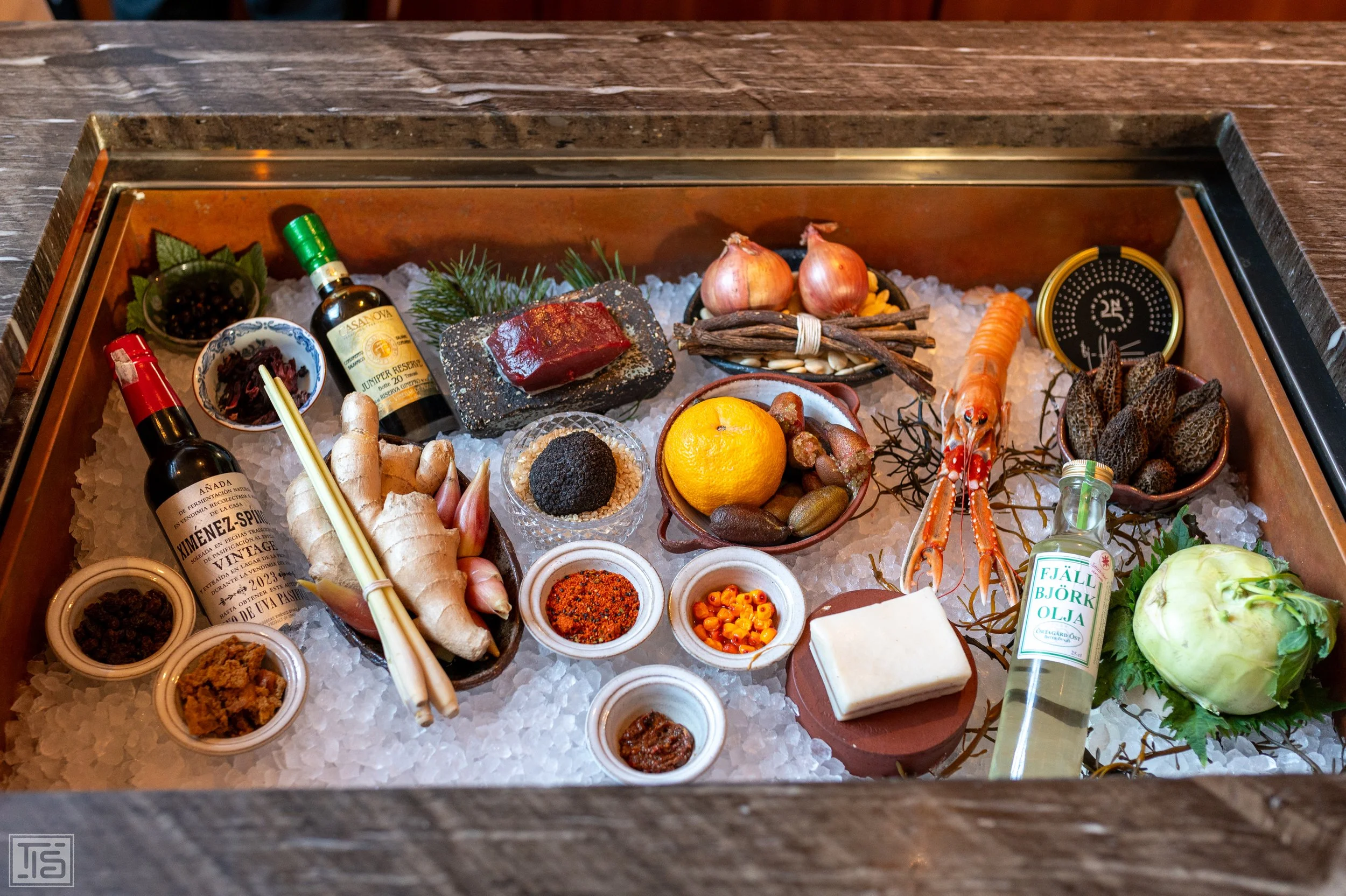Nach einem starken Auftakt werde ich nun an den Küchentresen begleitet. Hier werden die meisten Zutaten, die sich im heutigen Menü wiederfinden, auf Eis präsentiert und durch einen der Köche kurz erläutert. Frantzén war zwar nicht der Erste, der die Produkte so zur Schau gestellt hat, dürfte das aber zumindest für europäische Fresser salonfähig gemacht haben.
