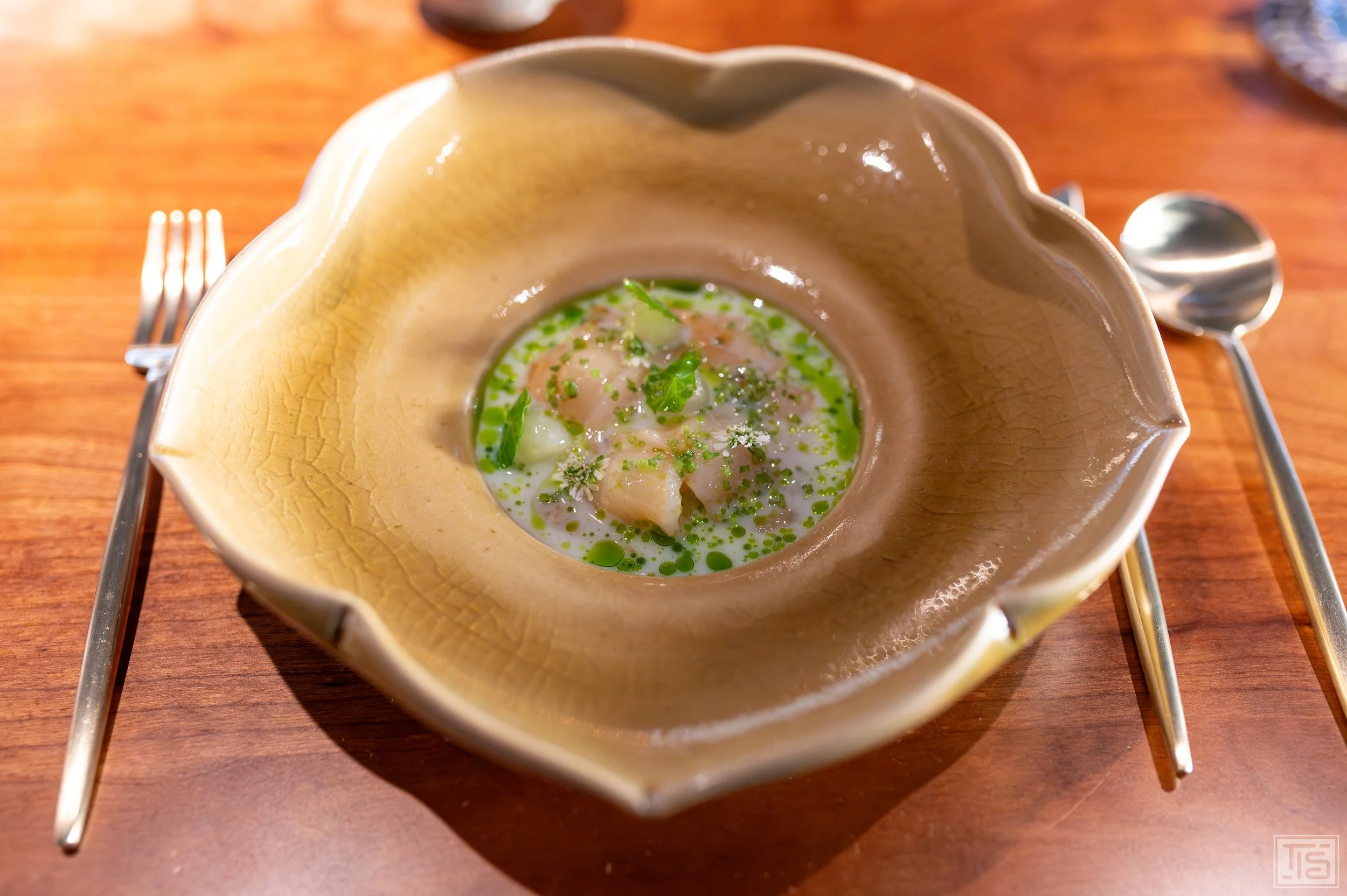 Mit Kaisergranat, Nishiki Reis, Yuzu und Galgant folgt ein weiteres Signature-Gericht des Hauses. Man mag es kaum glauben, aber als diese Kreation seinerzeit das erste Mal in den einschlägigen Blogs die Runde machte, wurde das als neues Kapitel im Fine Dining gesehen. Man tauchte tief in die Metaebene ab und stellte Fragen wie: Darf man einen edlen Kaisergranat frittieren? Darf man ihn ohne Besteck servieren, um ihn von Hand durch die Sauce zu ziehen? Ein Gericht in einem (damals) Zwei-Sterne-Restaurant, das aus lediglich drei Komponenten besteht? Erscheint aus heutiger Sicht geradezu lächerlich, war aber vor über 10 Jahren noch ein grosses Thema. Wie dem auch sei: ich kenne diesen Klassiker nur zu gut und muss leider festhalten, dass er etwas von seinem Glanz verloren hat. Das liegt vornehmlich an handwerklichen Unzulänglichkeiten. Bereits als ich die Langoustine hochhebe, spüre ich das Fett an meinen Fingern. Nicht ein erwartbar dünner Film, sondern Tropfen. Als ich reinbeisse, läuft mir das Fett übers Kinn. Frühere Iterationen kamen, bis auf einen sanften Fettfilm auf den Fingern (dafür ist die Fingerschale da) saftig aber Aussen fast trocken daher. Durch das (zu) viele Fett verändert sich auch der Geschmack und rückt die maritime Süsse vom ansonsten makellosen Kaisergranat ein wenig in den Hintergrund. Selbst die hervorragende Sauce zum Tunken aus aufgeschlagener Beurre Noisette, Galangal und Yuzu hilft da nur bedingt. Gleichzeitig zeigt diese technische Unsauberkeit auch die Achillesferse solch japanisch reduzierter Kreationen. Wenn auch nur eine Komponente nicht perfekt ausgeführt ist, beeinträchtigt das den Genuss in einem Masse, der fast unausweichlich in einer leisen Enttäuschung mündet.