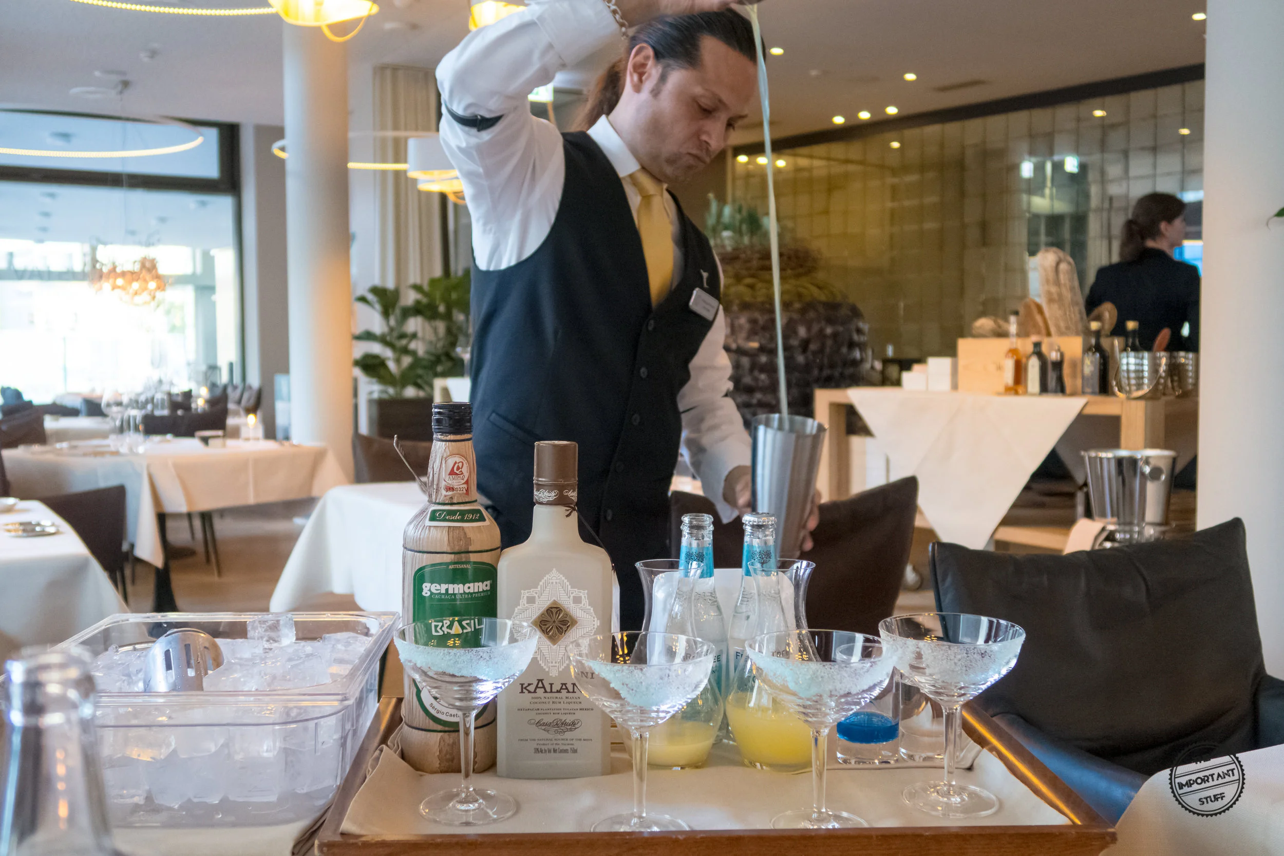 Wie angenehm es ist, eine anständige Bar im Haus zu haben, zeigt sich unmittelbar nachdem ich es mir mit meiner Begleitung am Tisch bequem gemacht habe. Chef de Bar Armando Archundia rollt mit einem Wagen vor und schlägt zum Aperitif einen Cocktail vor. Ich verzichte, da mir mehr nach Champagner ist, doch mein Gegenüber lässt sich einen Drink mixen. Einen köstlichen noch dazu, wie ich nach einem Probeschluck bestätigen kann. Dieses ganze Szenario erinnert mich an Restaurants wie das Eleven Madison Park, wo ein anständiger Cocktail vor dem Essen, wie in vielen Spitzenrestaurants der USA üblich, beinahe schon zum guten Ton gehört. Es gibt ganz sicher schlechtere Wege in den Abend zu starten.