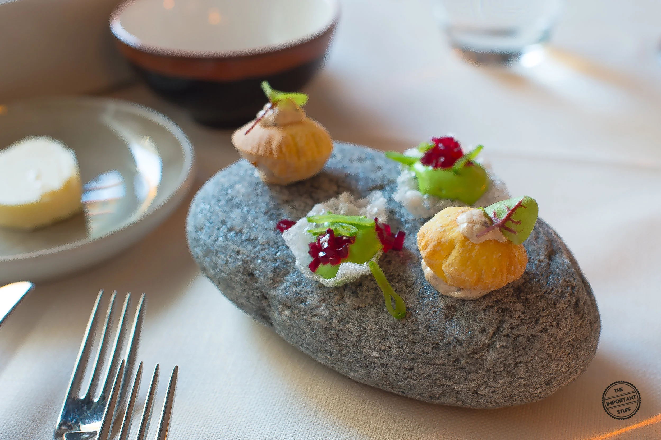 Erste Snacks erreichen den Tisch. Sardisches Brot mit Frischkäse und Tomate ist ein perfekter Einstieg in den Abend. Knusprig, würzig, elegant. Daneben befindet sich ein Tapiokachip mit Erbsencreme, eingelegter Rande und Kefenjulienne. Da spürt man den nahenden Frühling richtig am Gaumen. Sehr gut!
