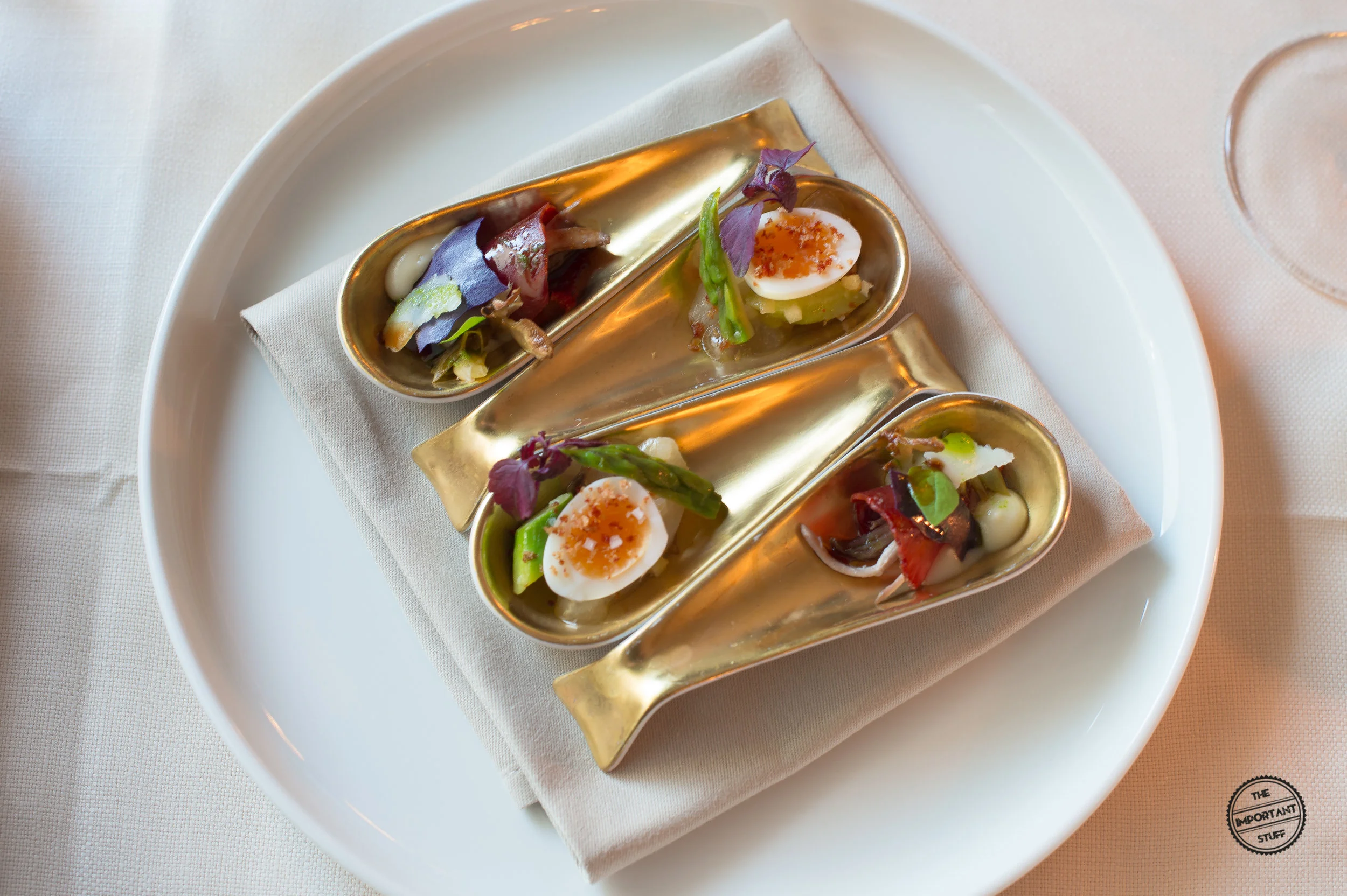 Weiter geht's mit zwei Löffeldegustationen. Ein Wachtelei teilt sich den Platz mit weissen und grünen Spargeln. Ein leckerer Happen, bei dem die tollen Stängel unverfälscht glänzen können. Auf dem zweiten Löffel liegt Lomo Iberico mit einer Kohlrabicreme. Mundfüllend, regelrecht opulent ist dieser kleine Gaumenschmeichler, dabei aromatisch fein austariert.