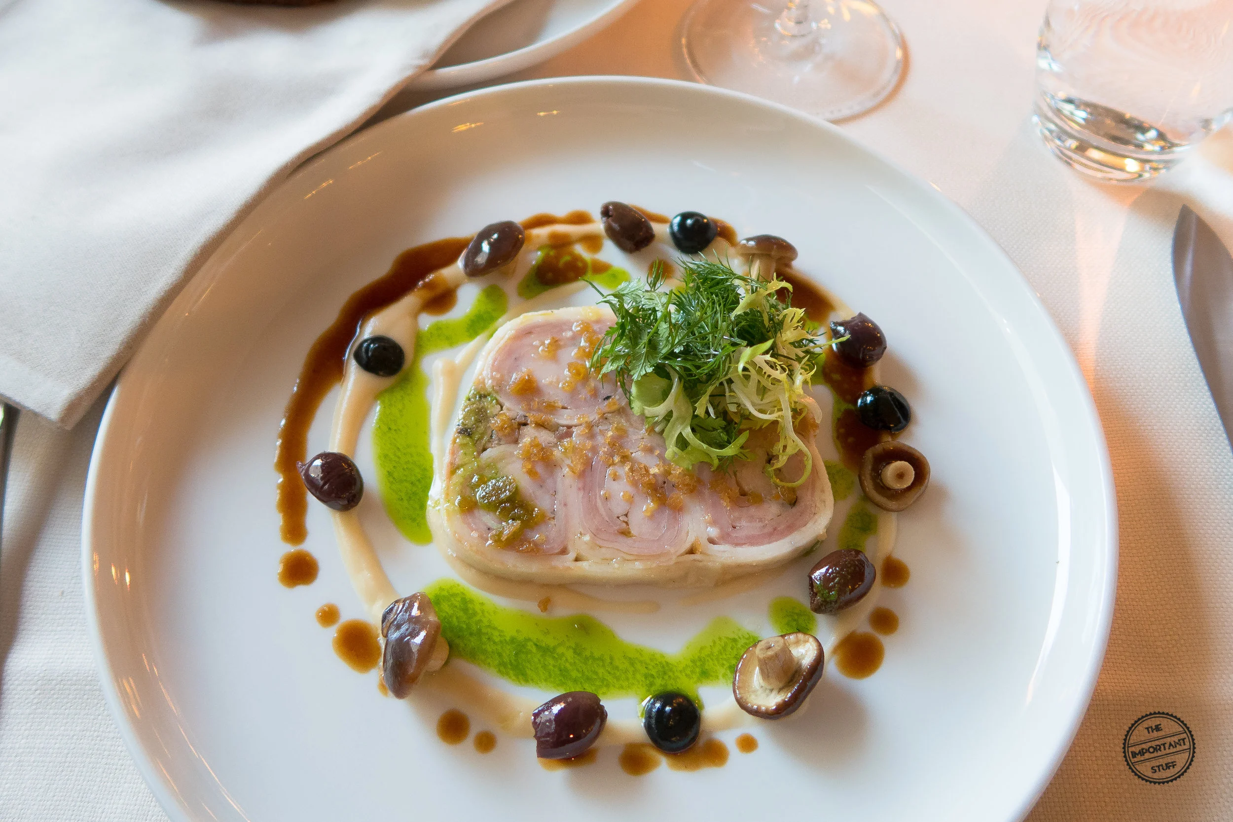 Das Menü startet mit einem Klassiker Colaiannis: Kaninchenterrine mit eingelegten Pilzen, weisser Bohnencreme und geröstetem Bauernbrot. Diese leider immer seltener anzutreffende, klassische Präparation zieht mich vom ersten Bissen an in ihren Bann. Die fleischige Wucht, der es bei aller Kraft nicht an Noblesse fehlt, wird durch die passenden Begleiter schön akzentuiert, ohne dass sich die Beilagen in den Vordergrund drängen. So kann man sich voll und ganz auf das Pressfleisch einlassen, die verschiedenen Schichten erschmecken. Hier mal etwas Püree dazu, eine der Saucen, da ein eingelegter Pilz oder etwas Salat zur Abwechslung. Ein himmlischer Auftakt. Würde nicht noch ein komplettes Menü auf mich warten, könnte ich einem Supplement nicht widerstehen.