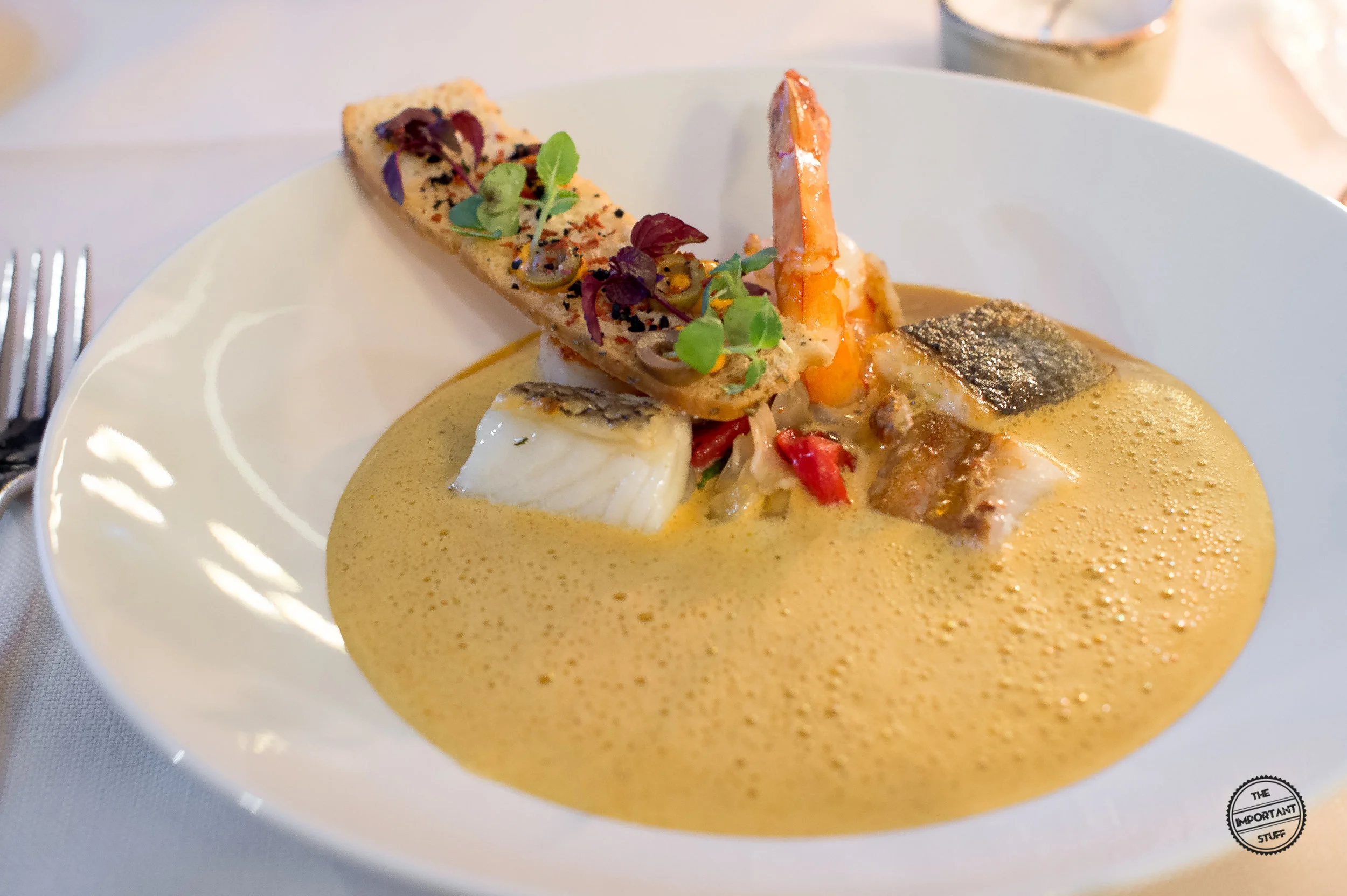 Mit der Bouillabaise Gustav, Allerlei aus dem Meer, Brotchips und Rouille erreicht ein weiterer Klassiker des Hauses den Tisch. Die tiefrote Fischsuppe verströmt einen betörenden Duft, der mich augenblicklich an einen Hafen in Südfrankreich transportiert, an dem gerade die Fischer den Tagesfang reinbringen. Wundervoll, wenn nur schon der Geruch eines Gerichts solche Emotionen auslösen kann. Die Suppe schmeckt dann auch ganz hervorragend - aber nur bis etwa zum vierten Löffel. Ab dann verwandelt sich die zu Beginn als angenehm intensiv und kräftig empfundene Suppe mit jedem zusätzlichen Löffel weiter in ein kleines Salzmonster. Ich bin diesbezüglich sicher etwas zarter besaitet, als viele andere Esser. Doch auch meine Begleitung, die grundsätzlich eine grössere Vorliebe für salzige Speisen pflegt als ich, empfindet die Suppe zunehmend als zu salzig. Dadurch verliert die Bouillabaisse leider auch etwas ihrer Finesse. Dennoch ein sehr guter Gang - vor allem auch dank der abwechslungsreichen und qualitativ hochwertigen Meeresprotagonisten, die in der Suppe schwimmen.