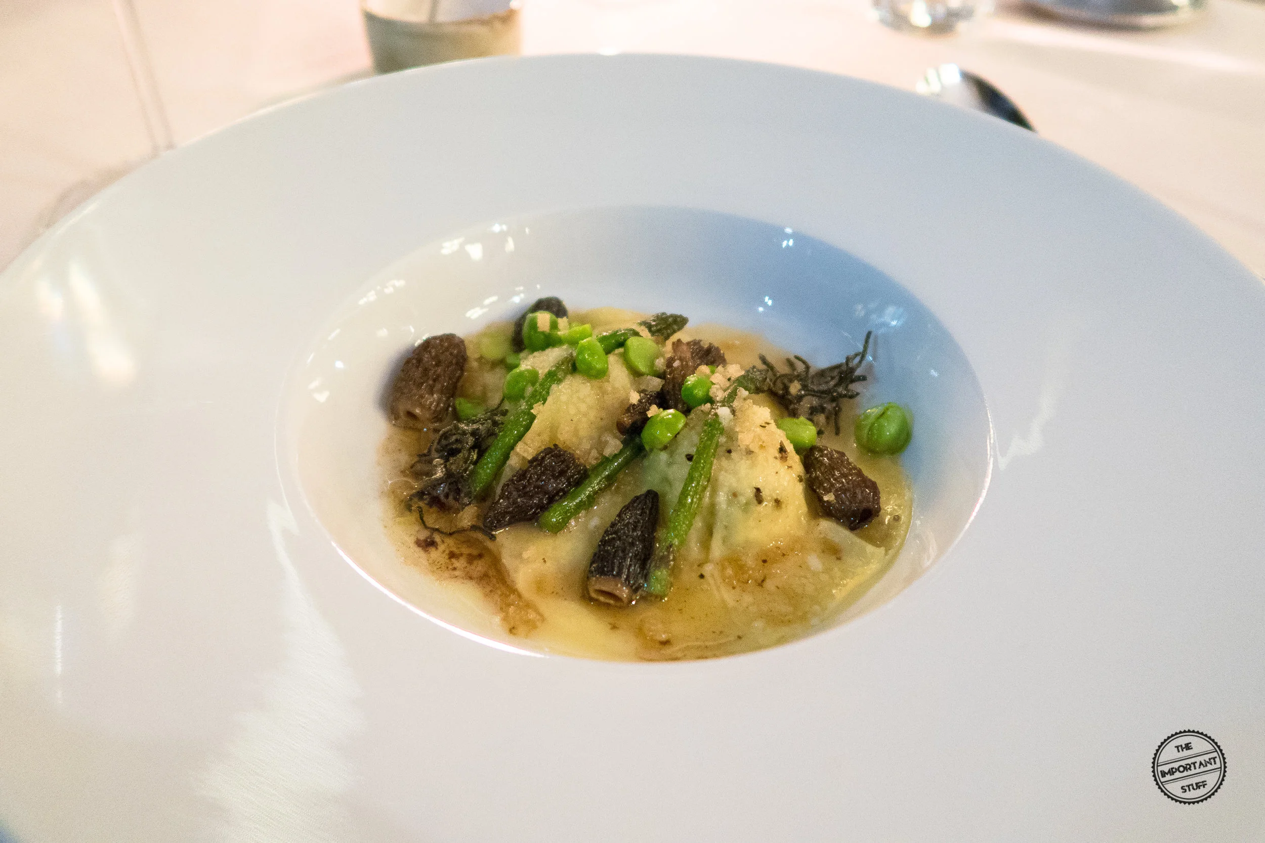 Ravioli mit Spargel, Ricotta, Parmesan, Salbeibutter und Morcheln schielt nun zum ersten Mal merklich in Richtung Heimat des Chefs. Der dünne, delikate Pastateig zeugt von jahrelanger Erfahrung - die klassische Kombination von Salbeibutter und Käsefüllung wird ergänzt durch etwas gebratenen Spargel sowie einige frische Morcheln. Geschmacklich ist das Ganze eigentlich einwandfrei, jedoch überlagert die grosszügig portionierte Kräuterbutter die delikaten Aromen der anderen Komponenten auf dem Teller nach einigen Gabeln etwas zu stark. Wie bei der Bouillabaisse zuvor, fehlt es auch hier auf Dauer ein wenig an Raffinesse.