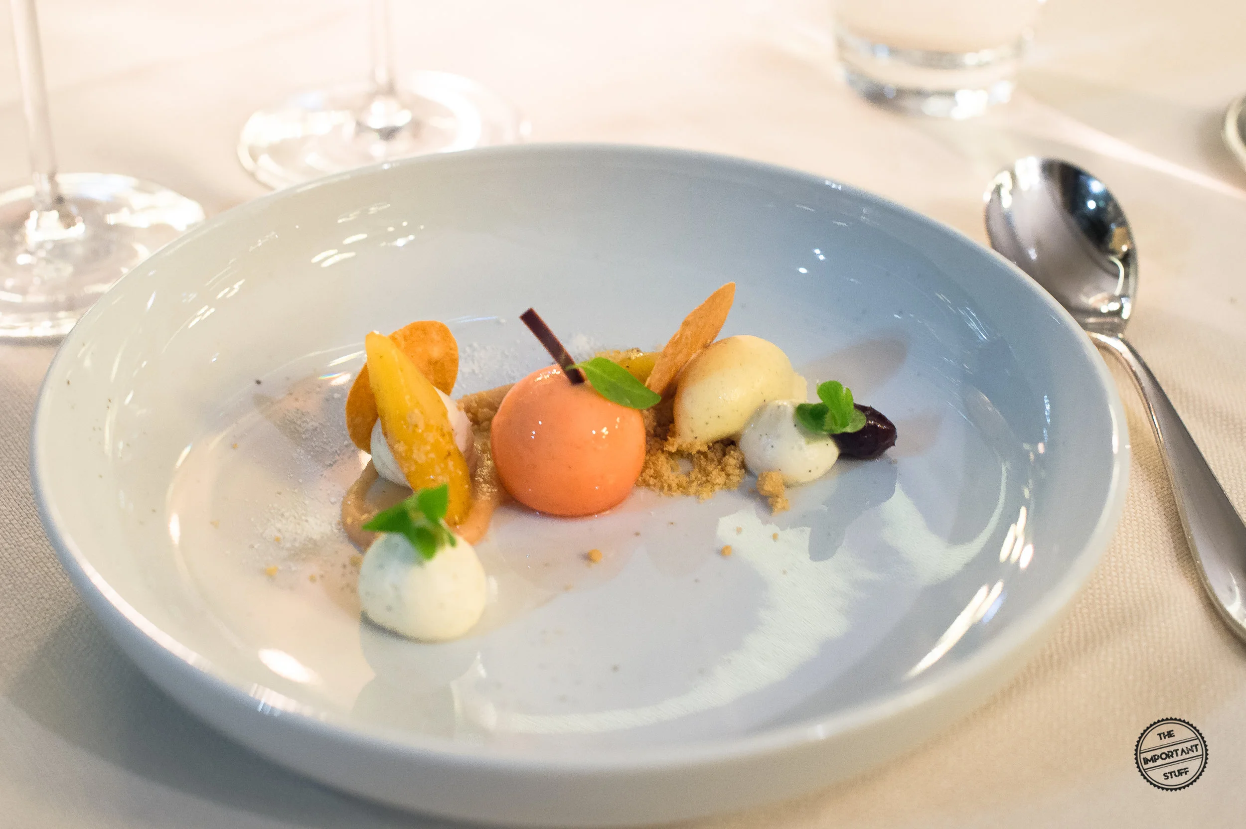 Das erste Dessert ist ein dekonstruierter Apfelkuchen mit Vanilleglace, der enorm von der Separierung der Kuchenelemente profitiert. So ergibt sich die Möglichkeit, sich seinen eigenen Apfelkuchen neu zusammenzubasteln. Wer beispielsweise keine Rosinen in seinem Dessert mag, kann sie hier einfach weglassen. Wenn man sich mal seine Wunschgabel zusammengestellt hat, überzeugt dieses Ensemble durch eine ungewöhnlich anmutende Frische, gepaart mit einer Leichtigkeit, die man sonst in so einem vollmundigen Geschmacksbild eher selten findet. Ausgezeichnet!