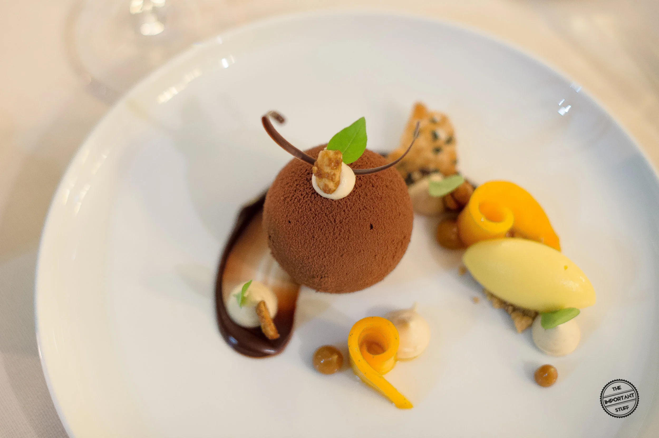 Schokolade, Erdnuss, Karamell mit Fleur de Sel und Kalamansi befriedigt zum Schluss auch noch allfällig vorhandene Schokogelüste. Die geschickt eingesetzte Kalamansi sorgt dafür, dass diese Süssspeise nicht allzu schwer daherkommt, wenngleich man das Gericht sicherlich als füllig und füllend bezeichnen kann. Doch dank der schön abgestimmten Proportionen und den willkommenen Säurespitzen der Zitrusfrucht macht sich weder Langeweile breit, noch meldet sich die eigentlich schon starke Sättigung zu Wort. So ist das Dessert im Nu verputzt.