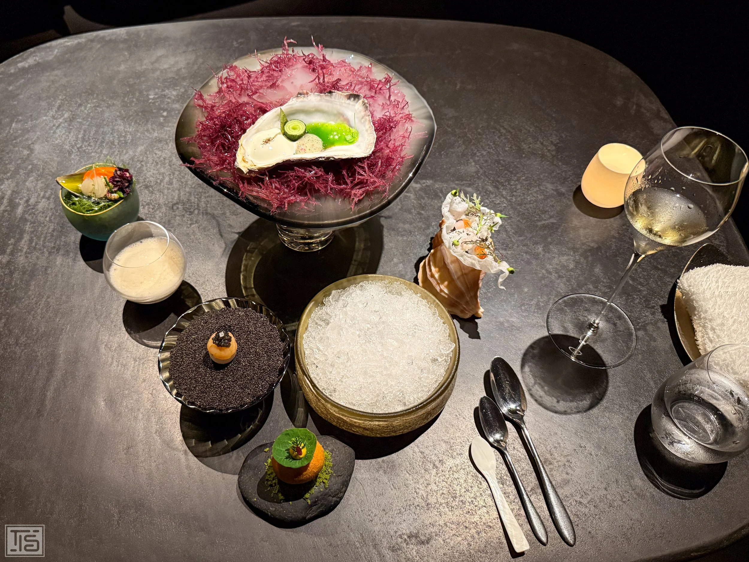Es geht ans Meer. Genauer gesagt an die Felsenküste. Trockeneis hüllt den Tisch in kühlen Nebel. Als er sich verflüchtigt, widme ich mich erst der Auster aus Hiroshima mit Gurke und Joghurt. Herrlich saftig, frisch und vollmundig. Vertraut wirkend zwar, durch das Joghurt aber doch mit einem andersartigen Twist. Links oben liegt eine stattliche Miesmuschel, ebenfalls aus Hiroshima, die mit Rakkyo (gepickelte japanische Lauchzwiebel) und Quinoa kombiniert wird. Die Säure und Knackigkeit der eingelegten Zwiebel kontrastiert die fleischige, kräftige Muschel, während der Quinoa deren Nussigkeit aufnimmt und für zusätzlichen Crunch sorgt. Sehr schön. Im Becher liegt eine grosszügige Portion Murasaki-Seeigel aus Hokkaido. Getoppt wird die maritime Köstlichkeit von einem Brokkolipüree und Meerwasserschaum. Der milde, bittersüssliche Kohl erweist sich als ebenso überraschender wie passender Partner für die jodig-süsslichen Gonaden, während der salzige Schaum deren Herkunft aus den reichhaltigen Gewässern rund um die nördlichste japanische Insel betont. Weiter geht’s mit einem kühlen Türmchen. Den Boden bildet eine Scheibe Rettich, darauf ein Bällchen von Spot Shrimps, getoppt von Kaviar. Ich bin aufgrund der oftmals etwas schleimigen Textur kein Freund von rohen Garnelen. Aber diese hier sind so knackig, als wären sie frisch dem Meer entsprungen. Unglaublich süss, saftig und mild jodig. Ein Eindruck, der durch den perfekt dosierten Kaviar optimal verstärkt wird, was am Gaumen den Anschein erweckt, als ob man eine herrlich frische Meeresbrise geniesst. Als ebenso resoluter wie passender Gegenspieler bringt der Rettich Balance in diesen Happen. Ein harmlos aussehendes Currybällchen ist mit Shirako (Fischmilch) gefüllt. Dieser wohltuend warme Happen könnte nicht besser sein: hauchdünne, krachend knusprige Hülle, cremige Füllung, wohldosierte Currywürze. Grandios! Zu guter Letzt gibt es einen ebenso gelungenen, luftig-leichten Cracker, der mit roher Flunder und Heringsrogen belegt ist. Das Thema Meer schliesst sich damit auch kongenial. Immer wieder kranken stark konzeptionell geprägte kulinarische Reisen bereits thematisch – und wenn nicht dort, dann spätestens bei der Umsetzung. Doch Yoneda ist offensichtlich der Typ "ganz oder gar nicht". Das Thema zieht sich durch jede Kreation. Die einzelnen Kreationen sind abwechslungsreich, nehmen dabei doch Bezug aufeinander. Das Wichtigste: Jeder Bissen ist einfach köstlich.