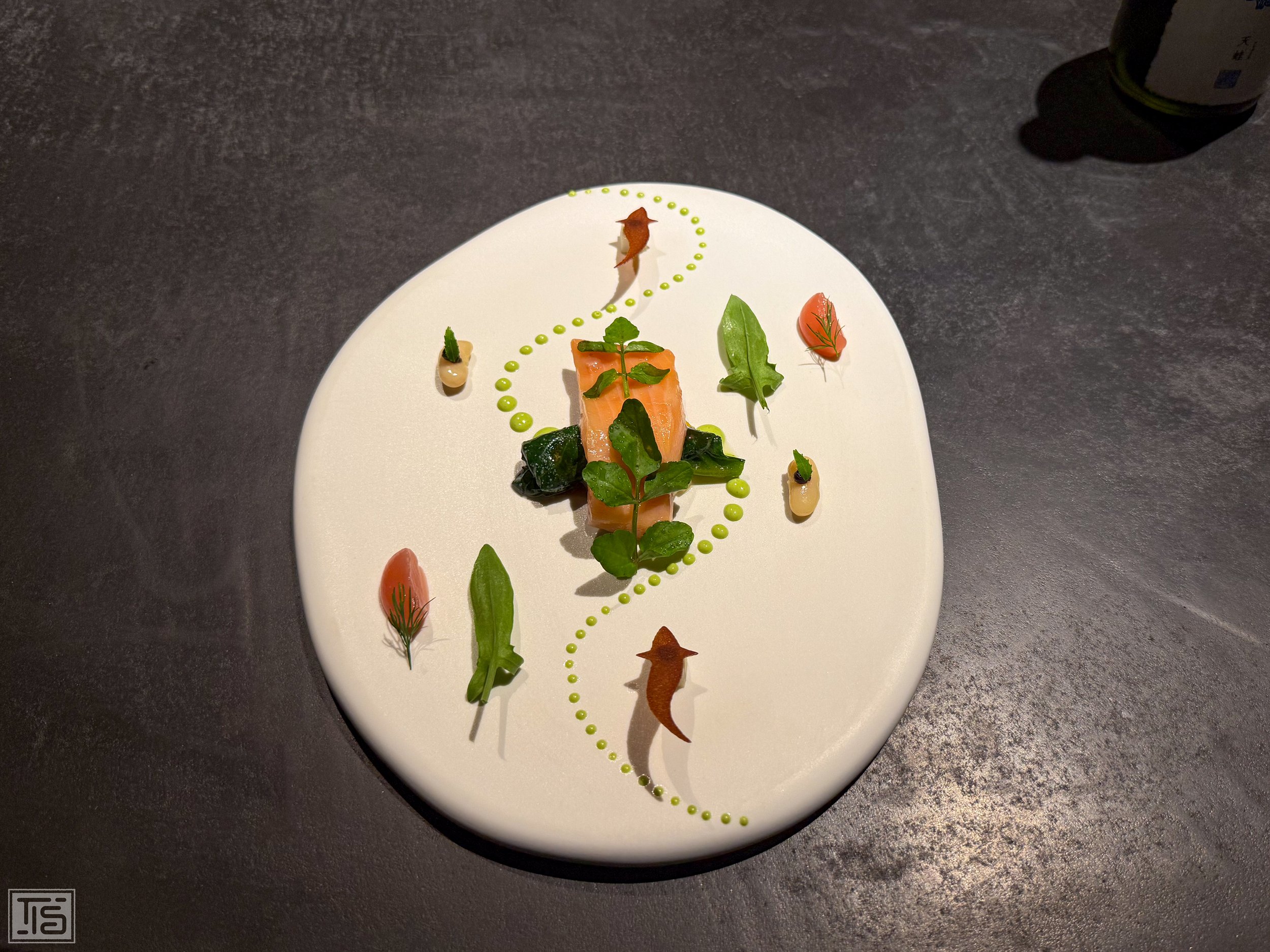Von der Küste geht es weiter in den Fluss. Aus dem fliessenden Gewässer stammt der Kirschlachs, der sich zwischen Hatcho-Miso, Apfel und Sauerampfer den Weg stromaufwärts bahnt. Lachs und Haute Cuisine sind für mich zwei Dinge, die nur in den seltensten Fällen zusammengehören. Dass einer dieser seltenen Fälle in Japan auftritt, dürfte kaum verwundern. Diese Unterart (auch Masu-Lachs genannt) hat nichts mit dem Zuchtabfall zu tun, den man gemeinhin vorgesetzt bekommt. Er zeichnet sich durch ein feines, zurückhaltendes Aroma aus, zarte Fettstränge geben Struktur und Volumen. Man fühlt sich eher an eine hochklassige Forelle aus eiskalten Gewässern erinnert als an Lachs. Wie bezeichnend, dass Masu das japanische Wort für Lachs und Forelle ist. Der Fisch wird bei seiner stilisierten Fortbewegung durch seine Begleiter nicht gestört, sondern fokussiert getragen. Sehr gut. Nicht mehr, nicht weniger.