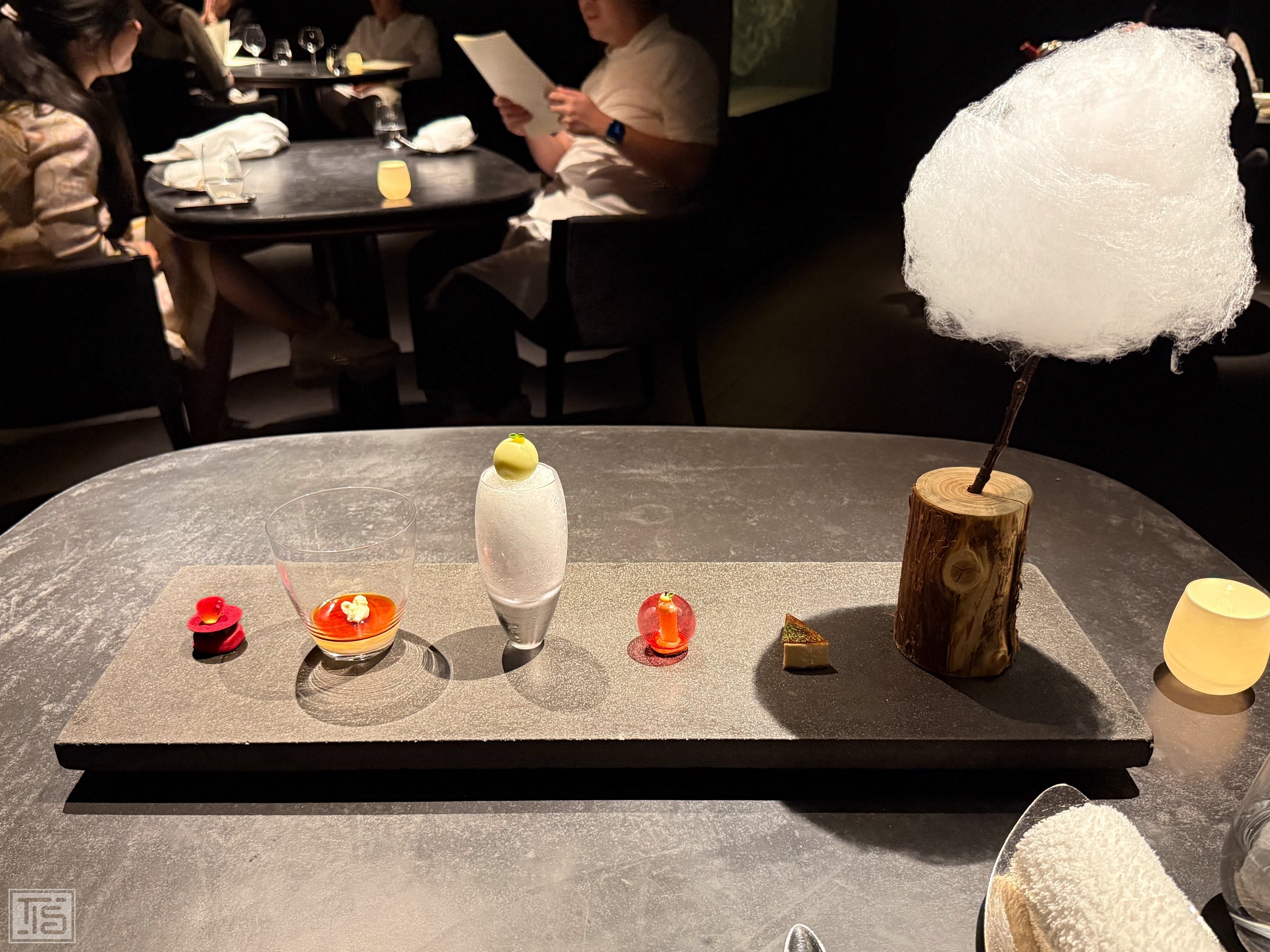 Die Hoffnung sieht Hajime poetisch im Tau. Der präsentiert sich als kleine Portion von mit Kiefer aromatisiertem Granité. Unachtsame Köche driften beim Nutzen dieser diffizilen Zutat schnell in medizinische Gefilde ab, die an billige Saunaaufgüsse in möchtegern-hochklassigen Hotels erinnern, in denen Adiletten vor der Eingangstüre stehen. Fähige Chefs entlocken dem Tannenschössling eine herbe, betörende Frische und erwecken mystische Assoziationen. Mit geschlossenen Augen wähnt man sich tatsächlich auf einem Morgenspaziergang im durch die ersten Sonnenstrahlen wachgeküssten Wald. Unerwartet spektakulär.
