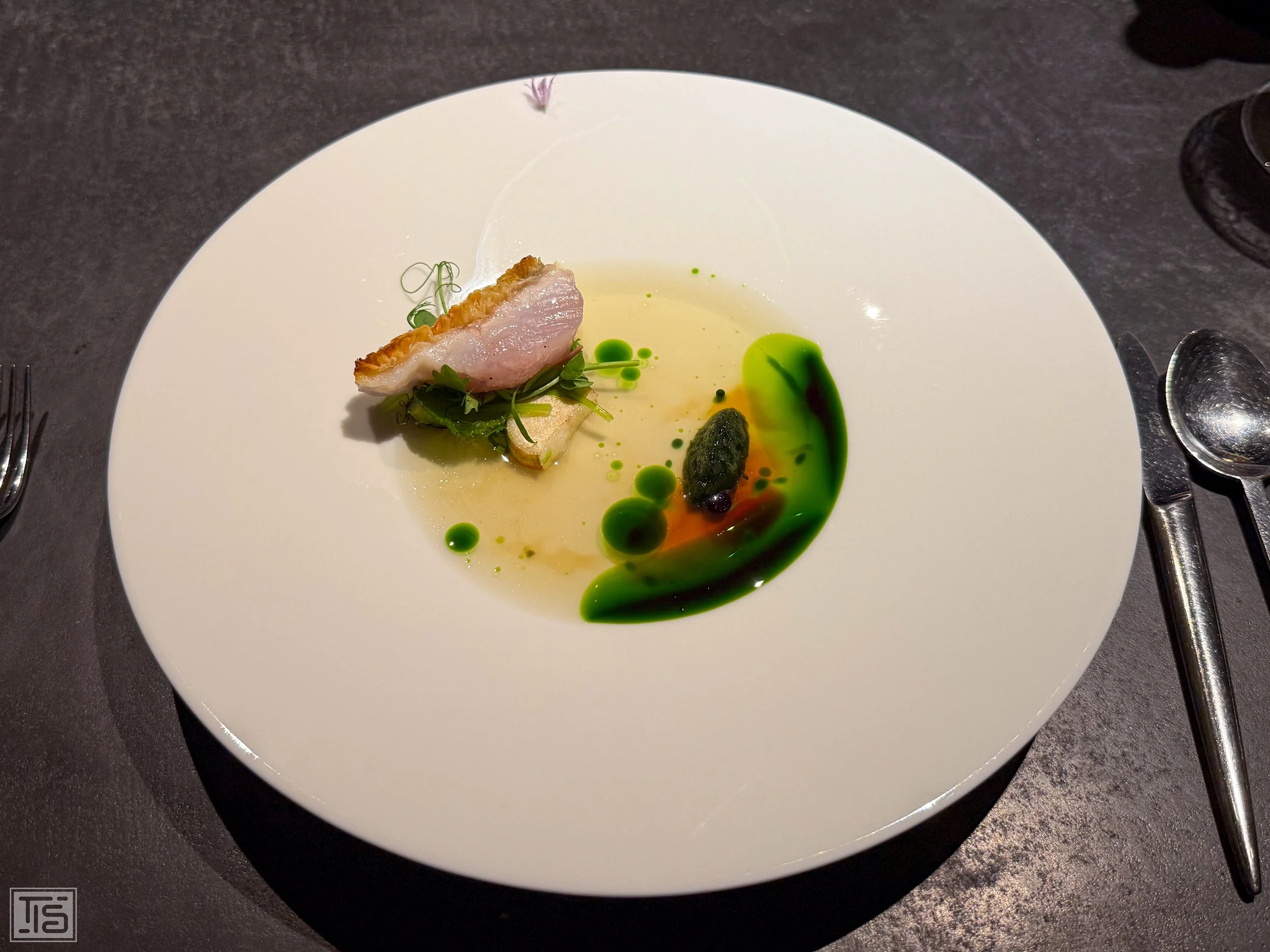 Bei einem solch poetischen Menünamen dürfen auch entsprechende Betitelungen der einzelnen Gänge nicht fehlen. Zum Auftakt begnügt sich der Chef aber noch mit einem simplen "Grün". Die Farbe der Hoffnung wird in diesem Fall von einer sommerlich tiefgrünen Sauce aus Vogelmiere dargestellt. Darunter befindet sich eine Art Flan vom weissen Spargel. Komplettiert wird das Gemüsearrangement durch kräftige, aber wohldosierte Yuzu und einige Blüten. Eine feinsinnige, geradezu zarte Komposition, bei der die Blüten nicht nur aromatisch eine entscheidende Rolle spielen. Reminiszenzen an eine Blume werden wach. Vor dem inneren Auge öffnet sich die Blüte einer Blume. Ihr grosszügiger Duft wird freigegeben, nur um sich dann konzentriert verwoben wieder in sich zu verschliessen. «Grün» ist einerseits eine völlig akkurate Beschreibung dieses reizvollen kleinen Schälchens, kratzt aber andererseits nicht einmal an der Oberfläche. Spektakuläres Understatement.