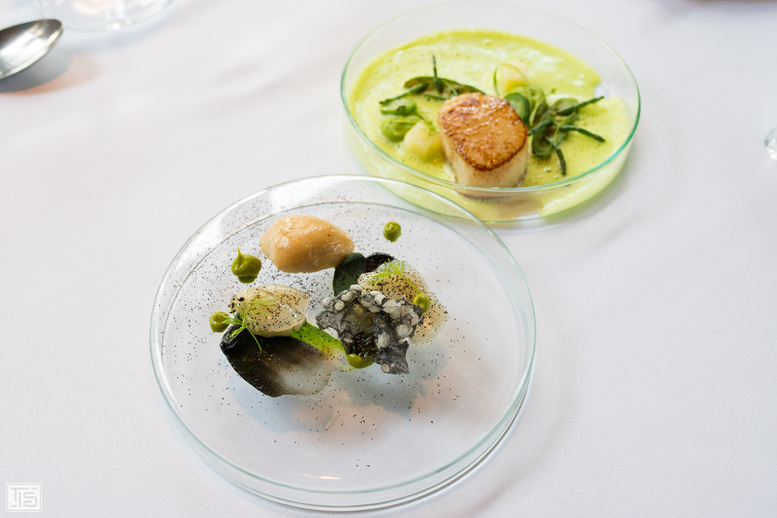 Äusserst hübsch präsentiert sich der erste Gang des Menüs, das es ja eigentlich gar nicht gibt. Die Zutaten Wilder Bachsaibling, Kürbis und Löwenzahn hören sich wenig spektakulär an, entpuppen sich im Miteinander aber als absolut grossartig. Angefangen beim Fisch, der einen solch puren und authentischen Geschmack hat, wie das kristallklare Wasser eines Bergbaches. Was für eine grandiose Qualität! Die Begleitung arbeitet diesem herrlichen Produkt ganz behutsam zu. Sie streut ein wenig Süsse ein, ein bisschen belebende Bitternis und grüne Frische, teilweise auch nur etwas knackige Struktur. Alles, um den Saibling ins bestmögliche Licht zu rücken. Was auch ganz hervorragend gelingt. Nach den bereits vielversprechenden Snacks, ein sehr gelungener Auftakt in den substantielleren Teil des Lunchs.