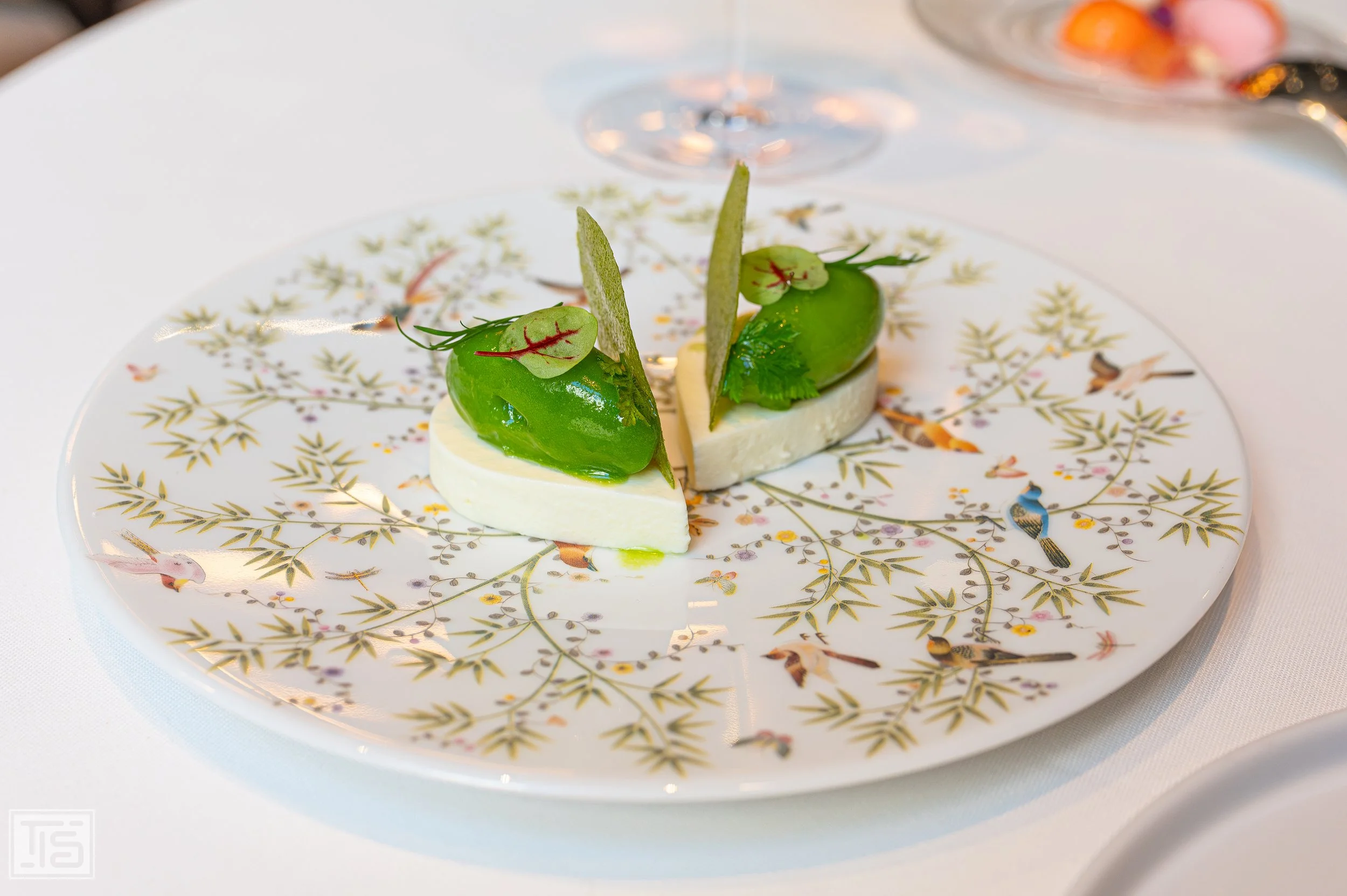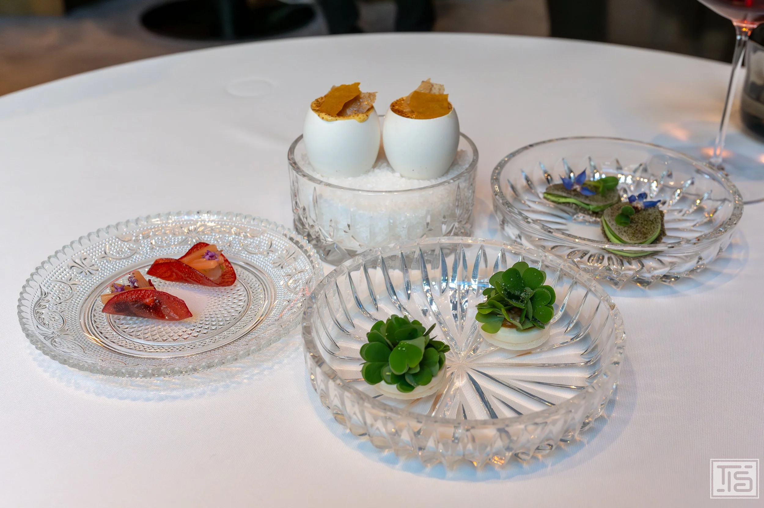 Vier Petitessen zum Teilen bilden den Auftakt: Igniv Ei, Erbse, Milken, Miso - Sauerrahm, Sauerklee - Rhabarber, Zander - Alge, Jalapeño. Jeder einzelne Snack überzeugt durch Akkuratesse, ein differenziertes Geschmacksbild und die augenscheinlich sorgfältige Komposition und Umsetzung. Zusammen bilden sie ein sich im Kreisgang steigerndes Miteinander, das alle Boxen tickt. Ein unaufdringlicher, aber gleichwohl äusserst starker sowie schlüssiger Auftakt und sogleich ein erster Fingerzeig, wohin die Reise heute Mittag gehen wird.