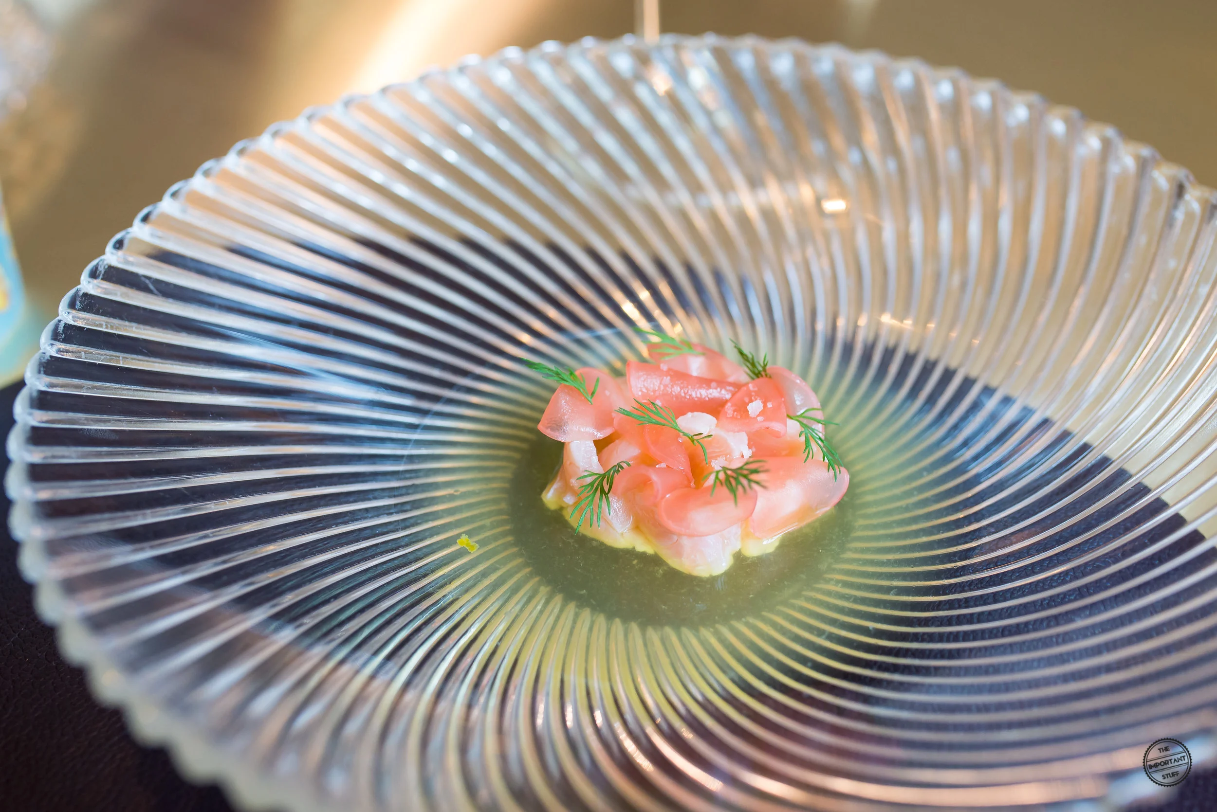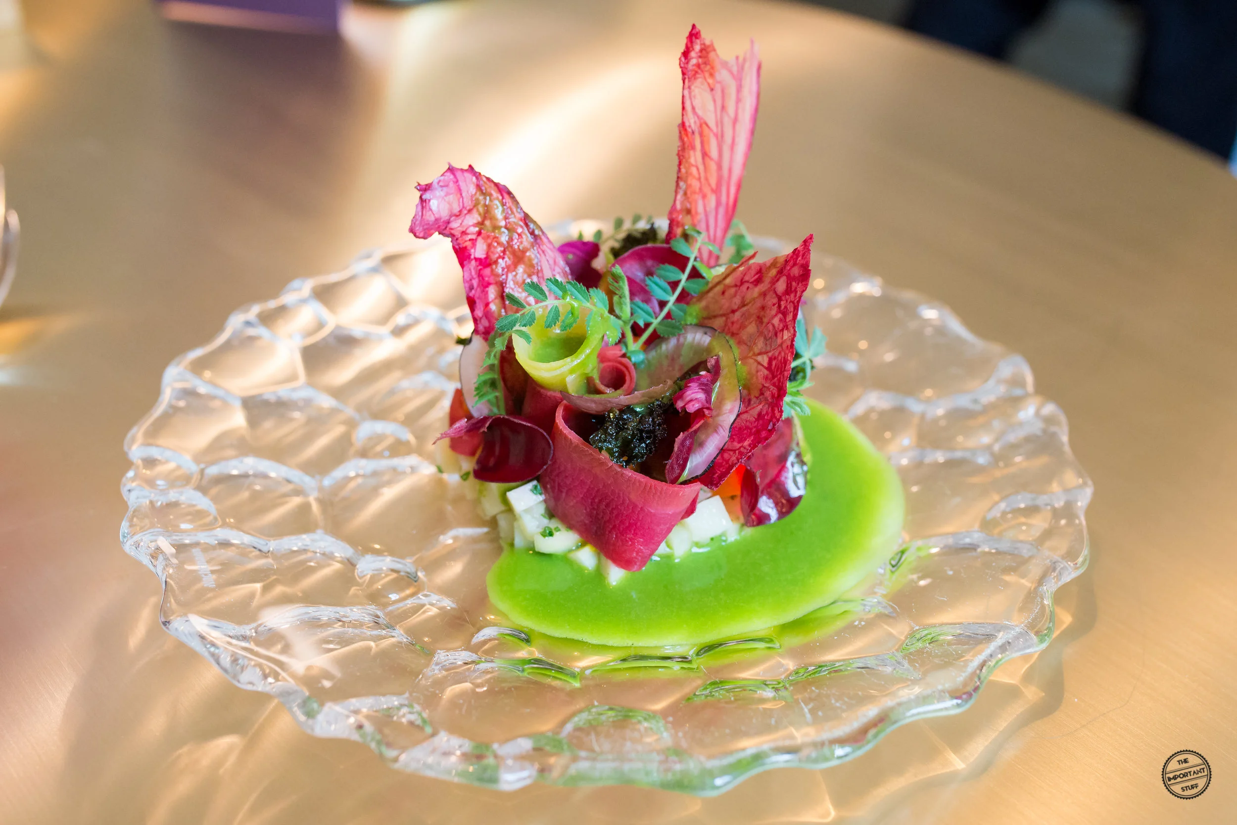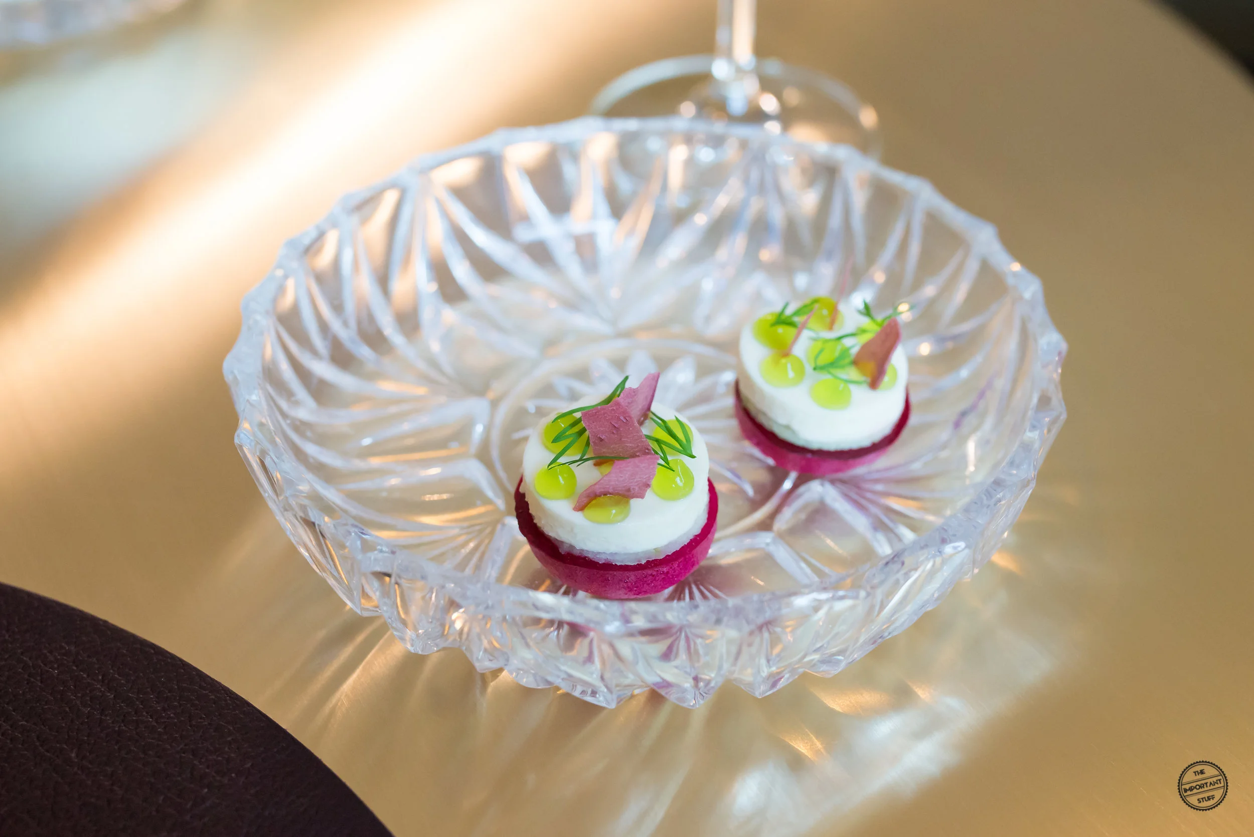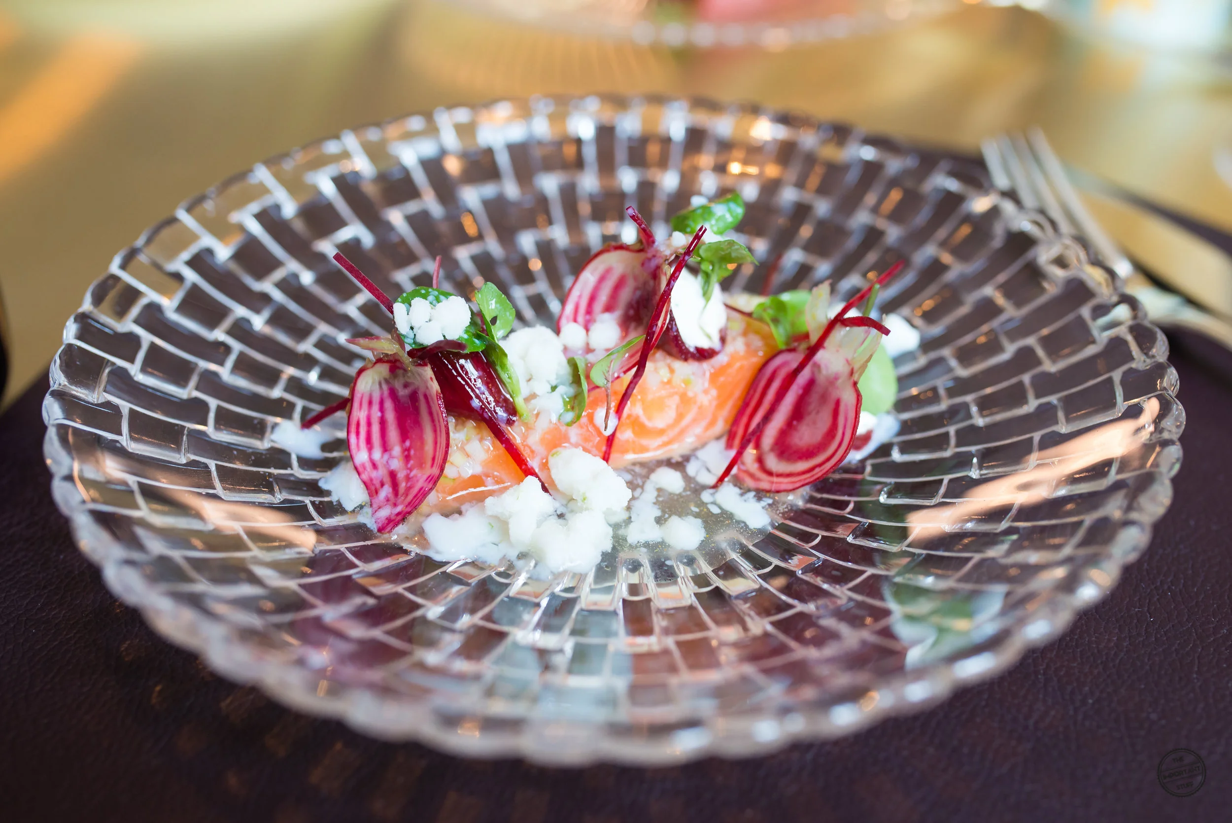 Der erste Gang - es gibt ja nur drei, ausser man entscheidet sich für die Surpise Zusatzgänge - besteht aus sieben (!) Sharing Dishes. Saibling und Rote Bete probiere ich als erstes und finde Gefallen am Zusammenspiel des hochwertigen Fischs und der knackigen, erdig-süssen Bete.