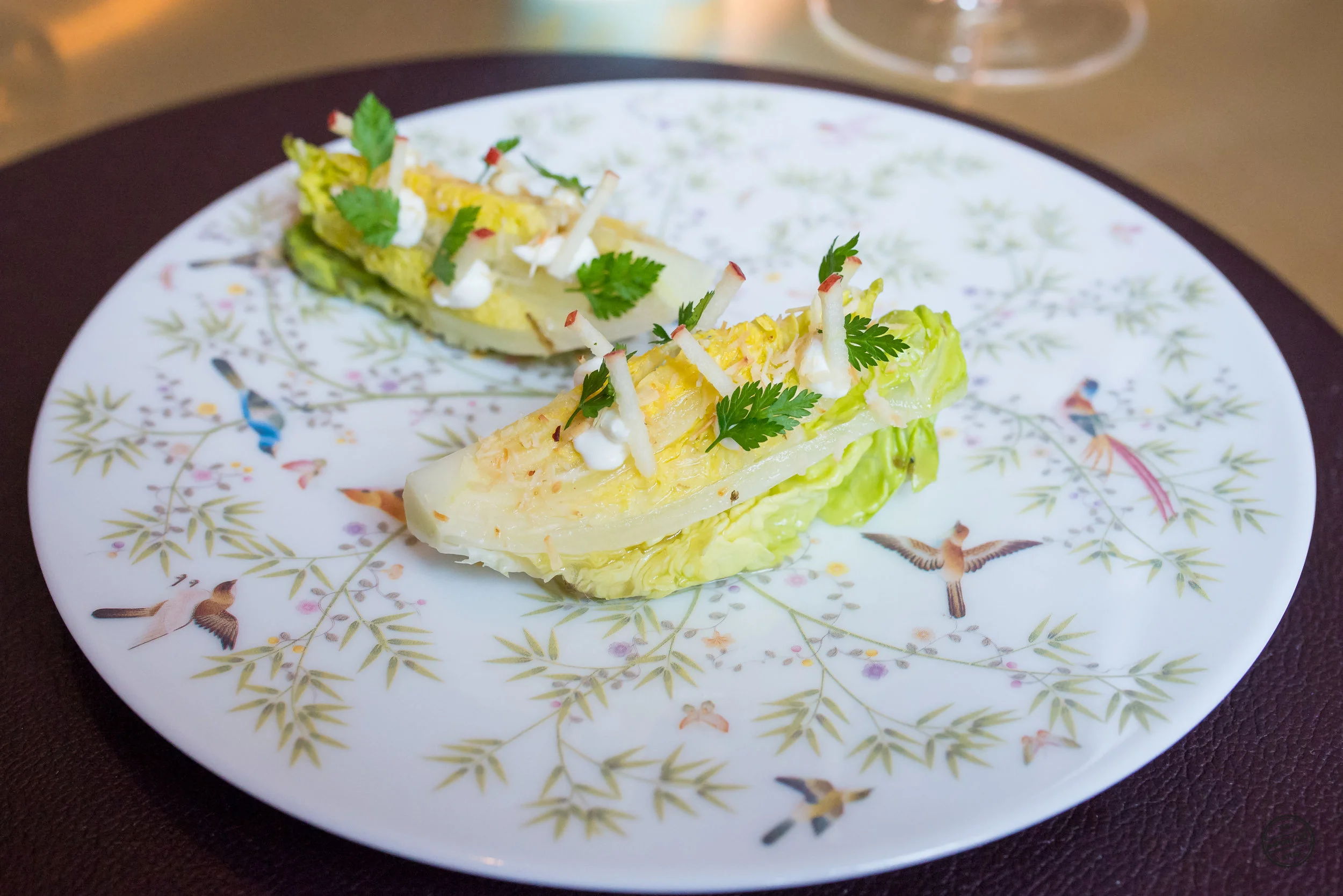 Knackig geht’s weiter mit Kopfsalat mit Apfel. Ich muss es immer wieder erwähnen: wenn man die Möglichkeit hat, solch fantastische Produkte zu präsentieren, dann hat auch ein simpler Salat in der Sternegastronomie seine Berechtigung. Die Küche macht es sich denkbar einfach, und weiss genau dadurch zu überzeugen. Der Crunch und die Frische stehen im Vordergrund, akzentuiert durch den säuerlichen Apfel und die Radieschen. Mann, ist das gut.
