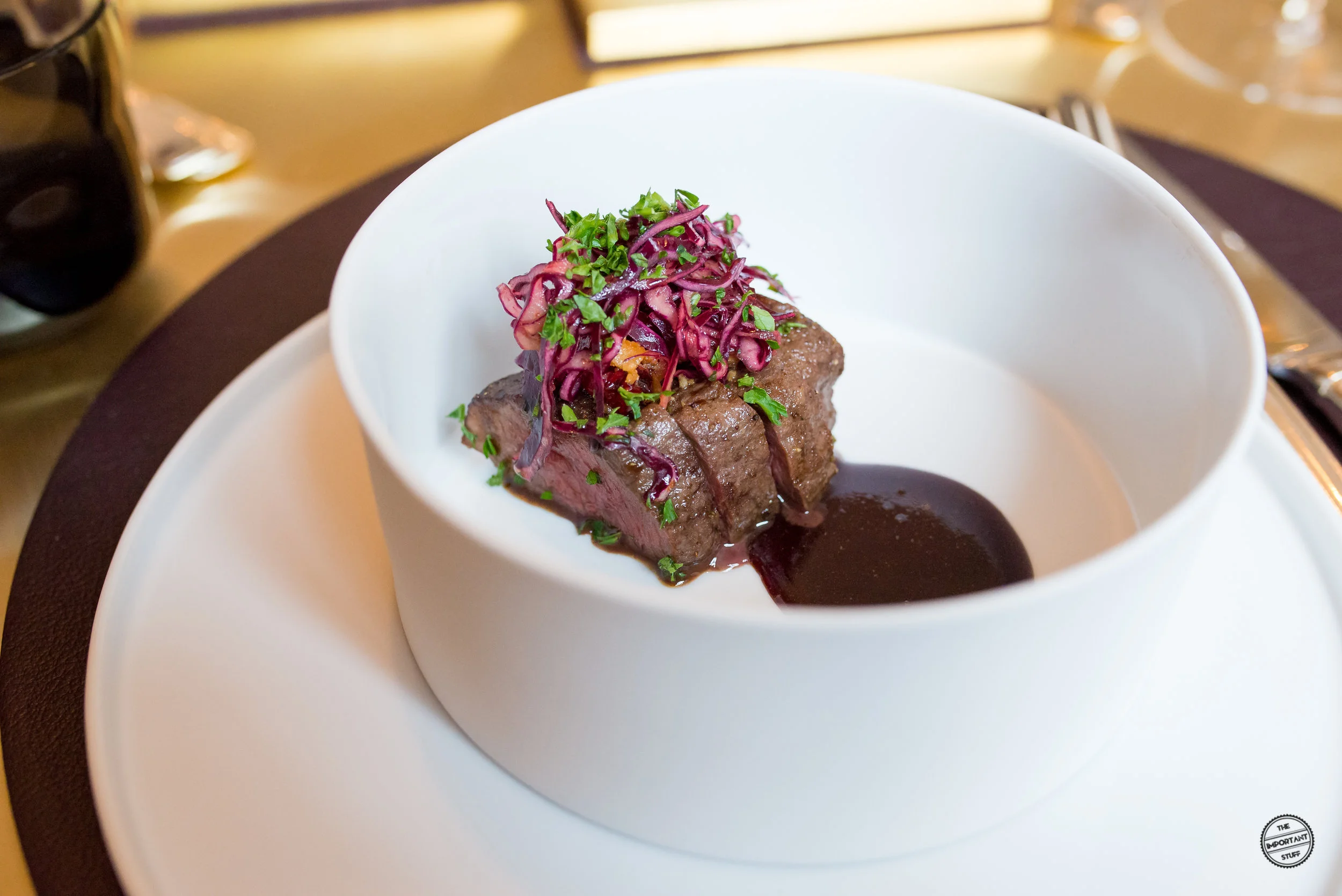 Hirschrücken und Kohl sind die überschaubaren Komponenten des ersten der vier Hauptgang-Teller, dem ich meine Aufmerksamkeit widme. Das kernige Wild ist mit reichlich Geschmack gesegnet, der süsslich-bittere Kohl eine treffende Begleitung dazu. Abgesehen davon, dass das Fleisch einen Ticken zarter sein dürfte, ist es ganz hervorragend.