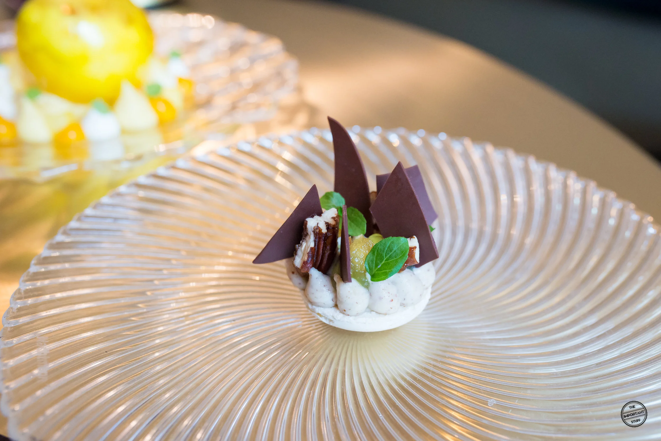 Weiter geht’s mit einem Pekannuss Macaron, das nur vordergründig nussig ist. Auf diesen wenigen Kubikzentimetern ist nämlich ein komplexes Gebilde entstanden, das so gar nichts mit der klebrig-süssen Welt zu tun hat, in der sich die Pekannuss sonst oft wiederfindet. Sehr elegant und leicht, dabei aromatisch fast überbordend opulent und gleichzeitig sehr finessenreich. Klasse.