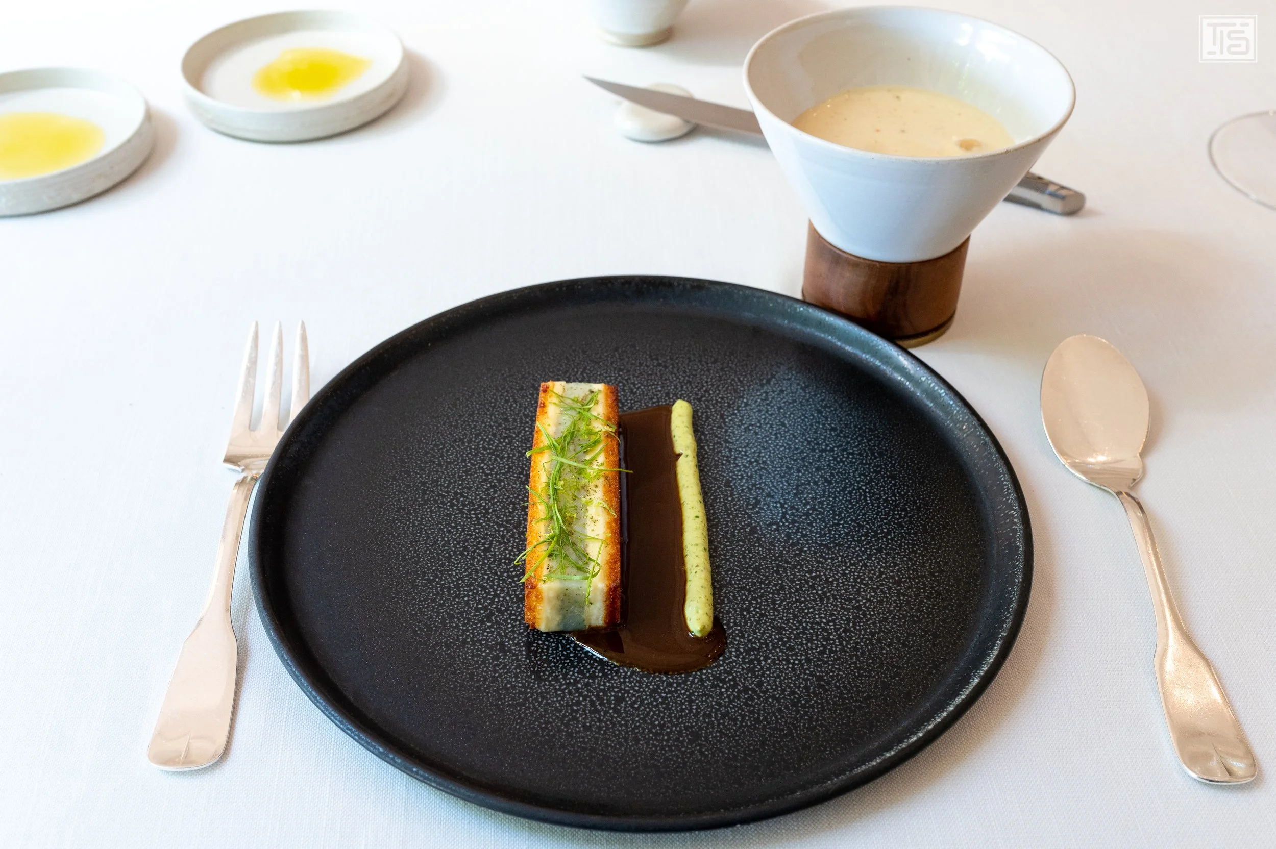 Die Tartine von mediterranen Sardinen mit Crèmeux von getoastetem Brot zählt, wie einige andere Kreationen, die ich heute und auch beim vergangenen Lunch serviert bekommen habe, zu den Klassikern der kurzen aber sehr erfolgreichen Geschichte von Glenn Viel im Baumanière. Für dieses Gericht werden die Sardinen in etwas Olivenöl und Zitrone mariniert, um anschliessend mit einer Art Buttermilchlack und gepulverten Toast überzogen zu werden. Am Tisch wird eine stark reduzierte Sardinenjus angegossen. Ganz nebenbei weist der freundliche Service darauf hin, dass man den knusprigen Kopf mitessen soll. Ein sehr mutig umgesetztes Ensemble, das vor allem auch durch die enorm intensive Jus in eine sehr herb-maritime Richtung gelenkt wird. Das dürfte, bei aller zweifellos vorhandenen Qualität, nicht jedermanns Sache sein. Auch mich holt es in diesem Moment nur bedingt ab. Ich frage mich, ob das besser schmecken würde, wenn es heiss serviert werden würde. Denn das Ganze ist, wohl beabsichtigt, nur lauwarm. Was den Genuss in meinen Augen erheblich schmälert.