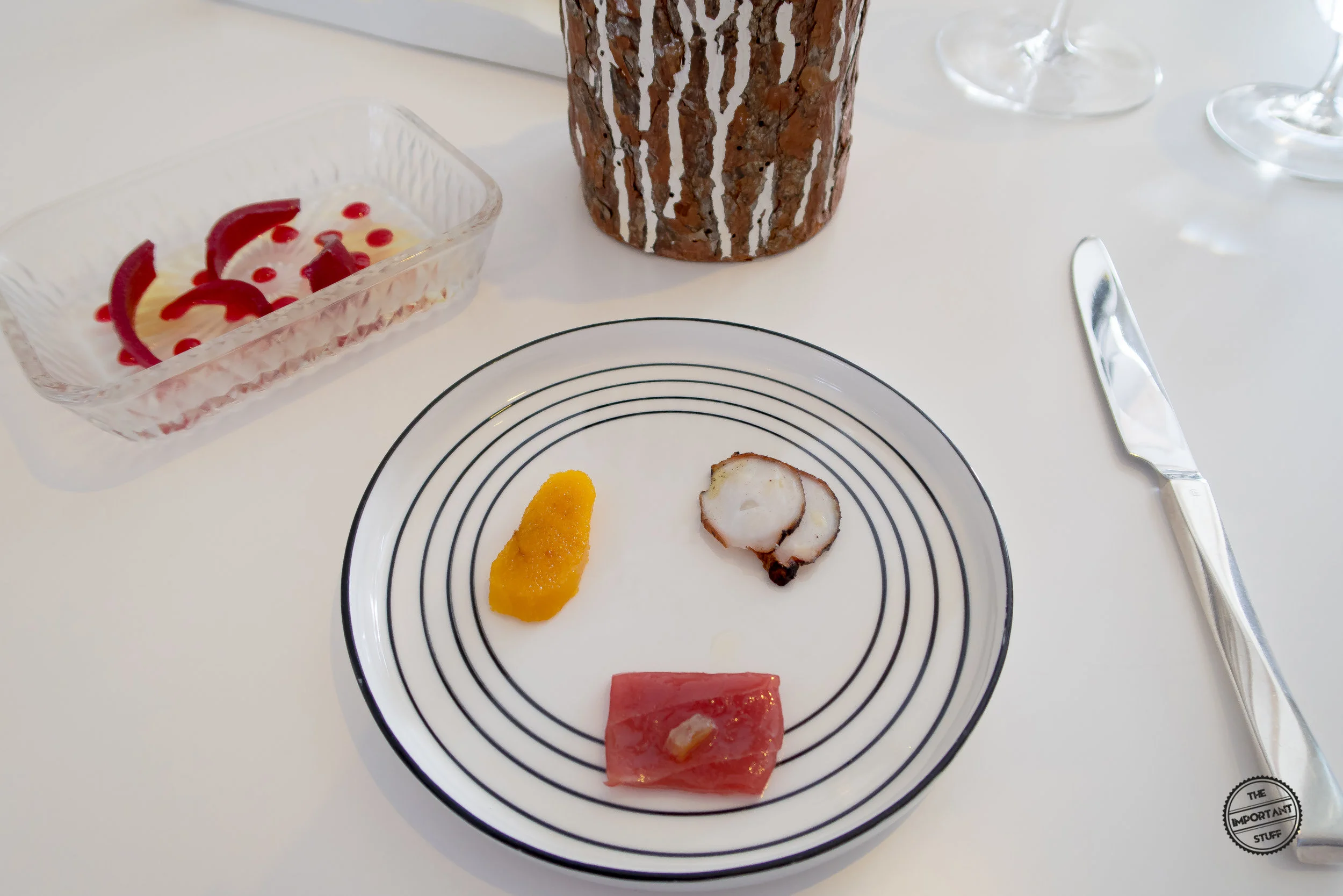 Der 2. Akt startet mit einer Präsentation der unterschiedlichen Produkte, teilweise präpariert, teilweise in rohem Zustand, die den nächsten Gang ausmachen: Getrockneter Oktopus, Meeräschenrogen und roter Thunfischbauch in Kombu und Mechoui. Die lokalen maritimen Spezialitäten schüren definitiv den Appetit. Angerichtet sieht das alles sehr übersichtlich aus - zum bereits Präsentierten gesellen sich dann noch eingelegte Zwiebeln sowie ein Kümmelpapadam (nicht im Bild). Der getrocknete Oktopus ist ebenso wie der Thunfisch von toller Qualität, versprüht Meeresfrische und harmoniert wunderbar mit dem etwas fettigen, überdimensionierten Papadam sowie den herrlich säuerlichen Zwiebeln. Der Rogen hingegen trifft meinen persönlichen Geschmack nicht, auch wenn er zweifelsfrei von guter Qualität ist, und profitiert auch von der Kombination mit den Beilagen nicht. Im Gegenteil. Gerade die Zwiebeln stellen den prägnant metallischen, extrem jodigen Geschmack der getrockneten Fischeier so stark in den Vordergrund, das ich es als fast schon unangenehm empfinde. Diese Art von Produktpurismus ist oftmals durchaus nach meinem Gusto, hat in diesem Fall jedoch neben Höhen auch beträchtliche Tiefen.
